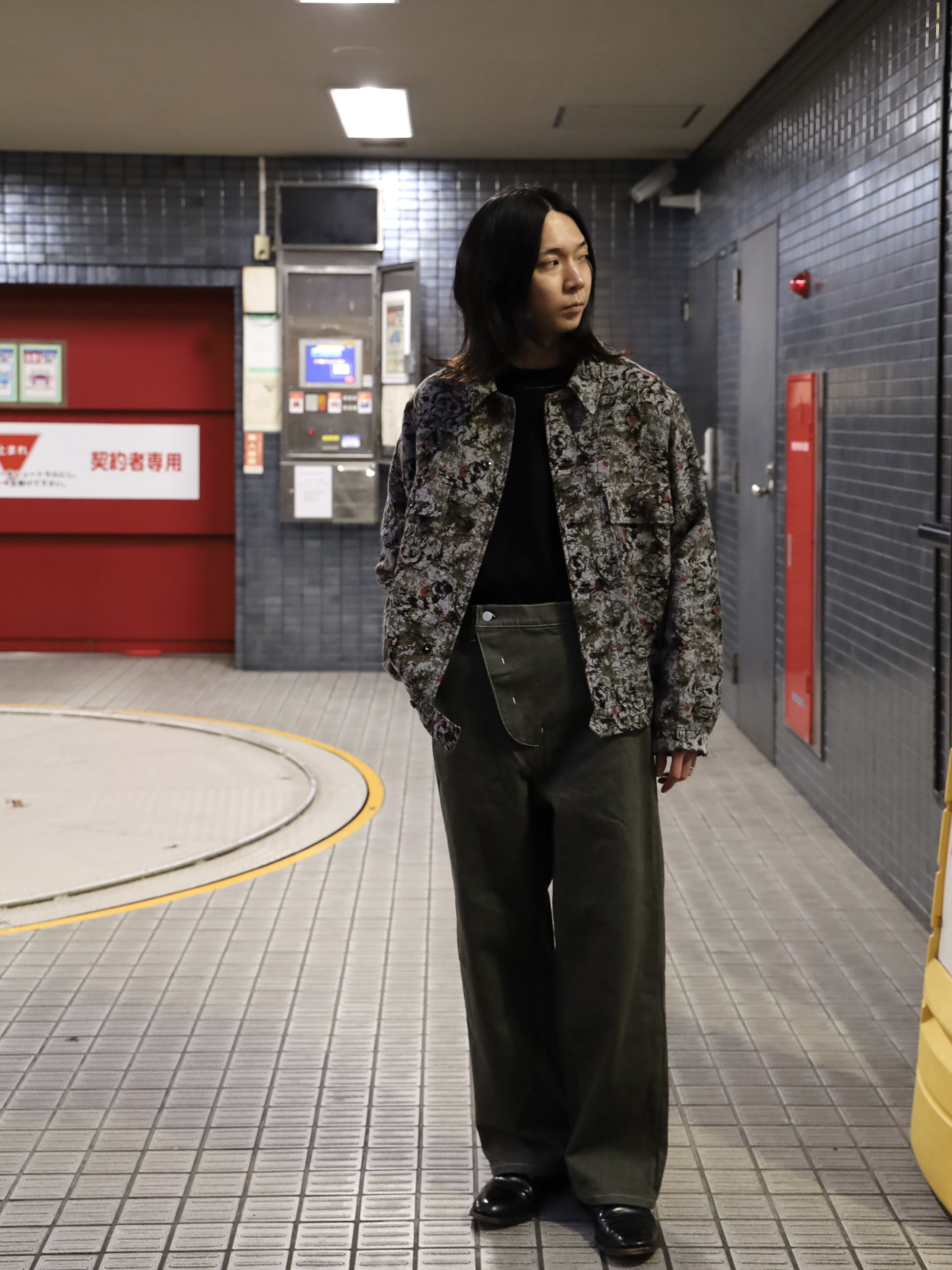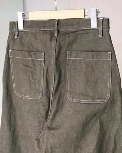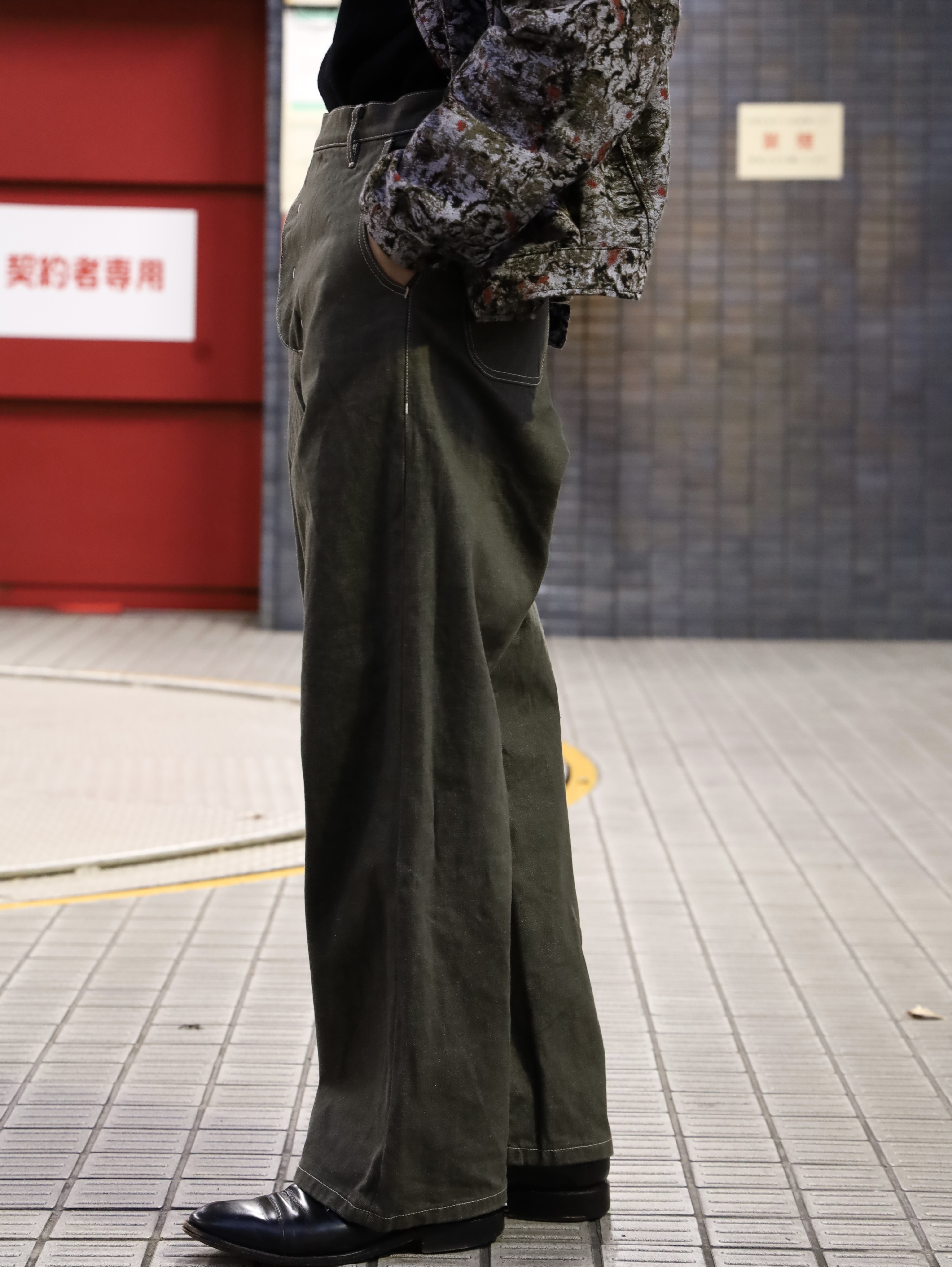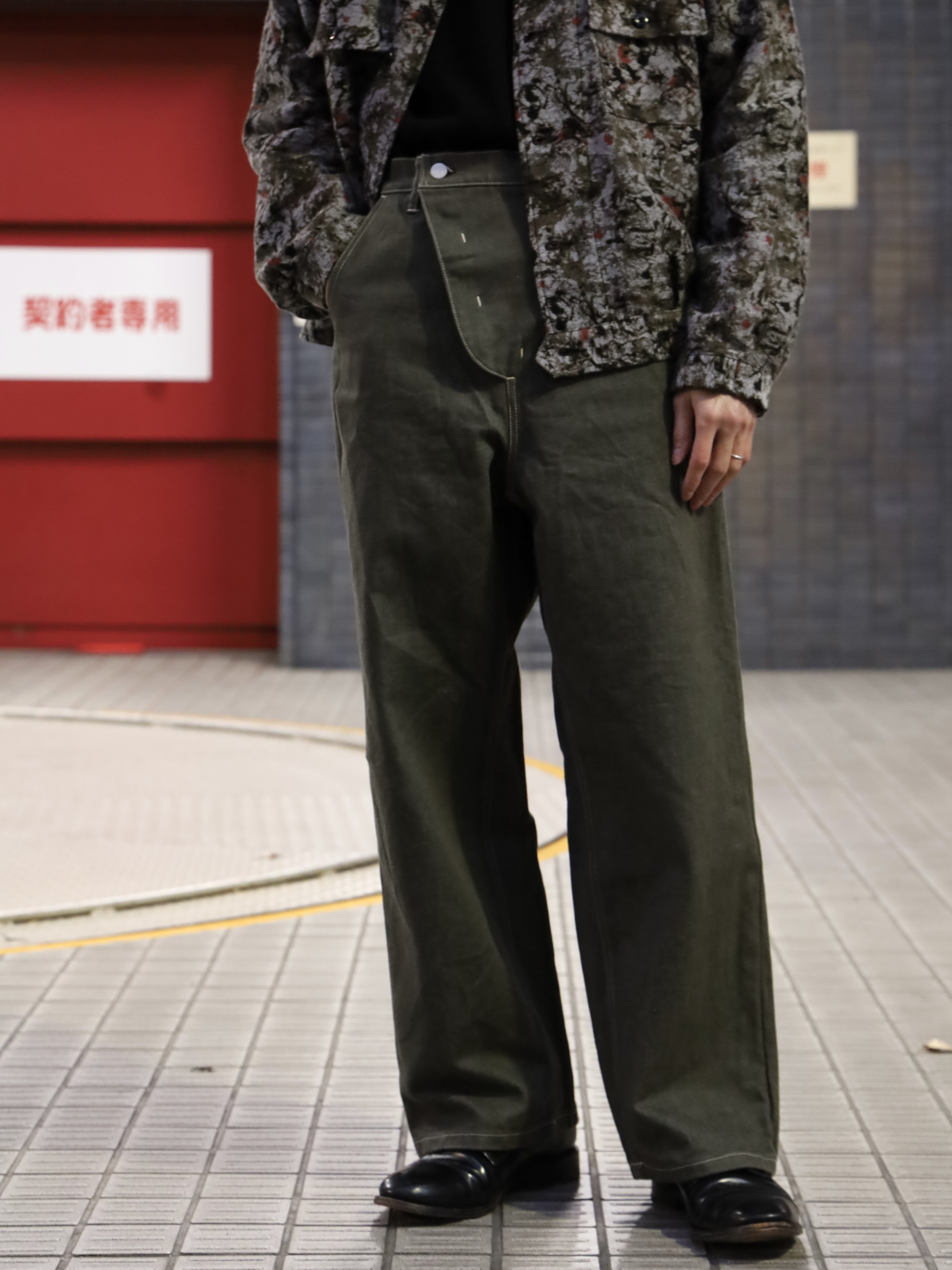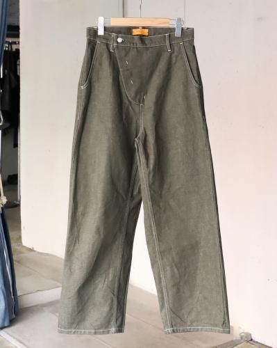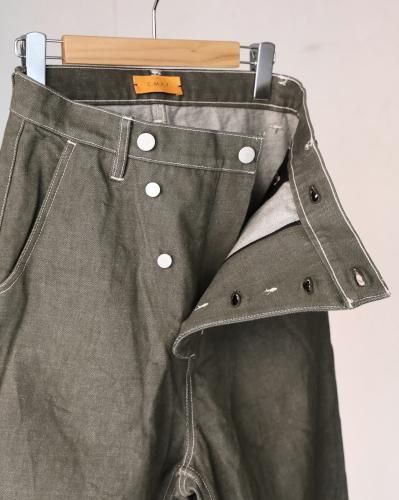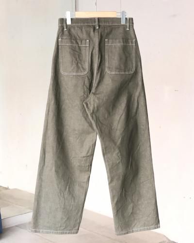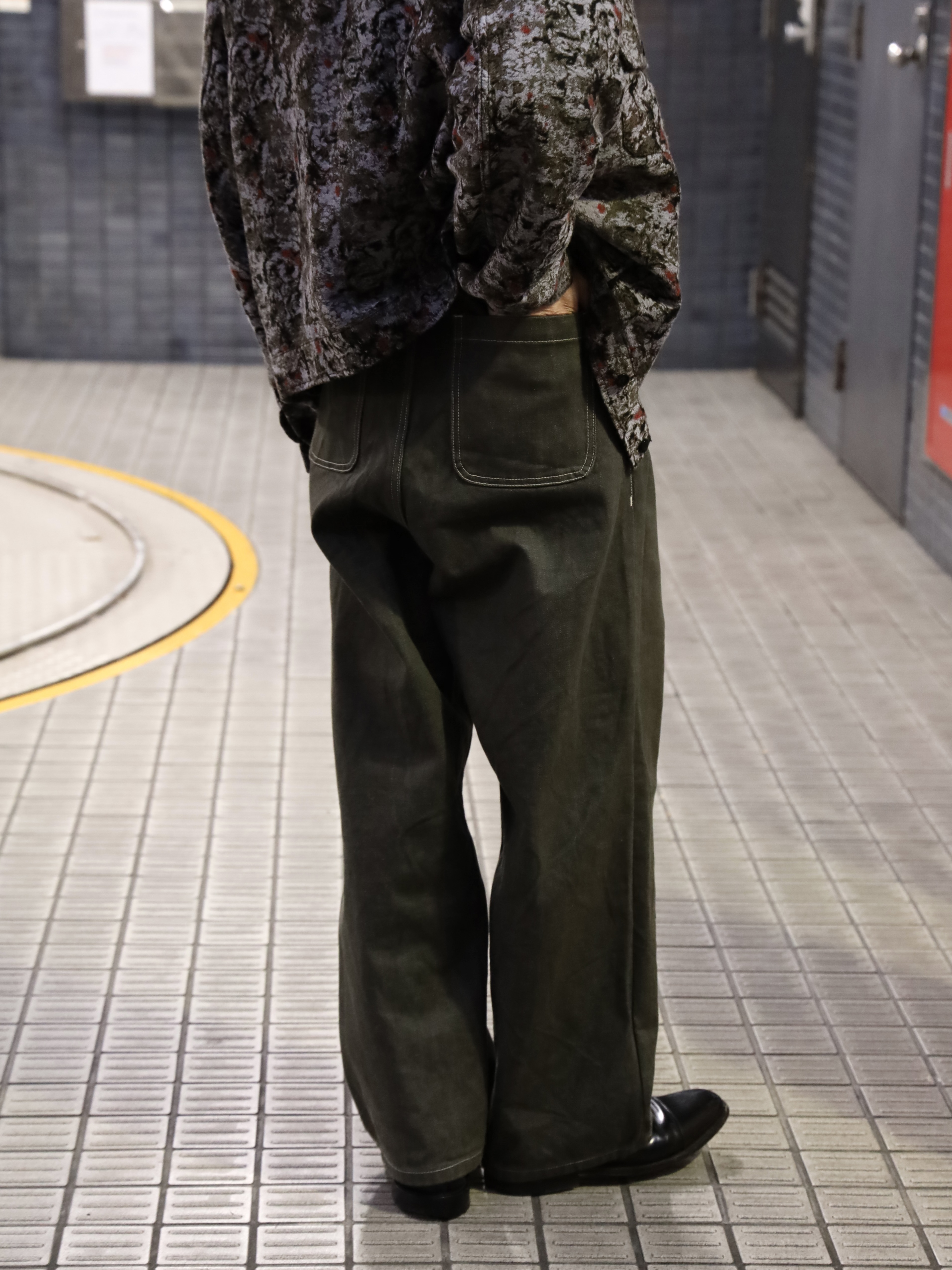 SSシーズンでもご好評をいただいたグリーンデニム。フロントに配された大げさな前開き持ち出しのデザインが特徴です。このデザインは見た目だけでなく、ウエストの安定感とホールド感に貢献しています。軽快な履き心地とシルエットの美しさをぜひご体感ください。