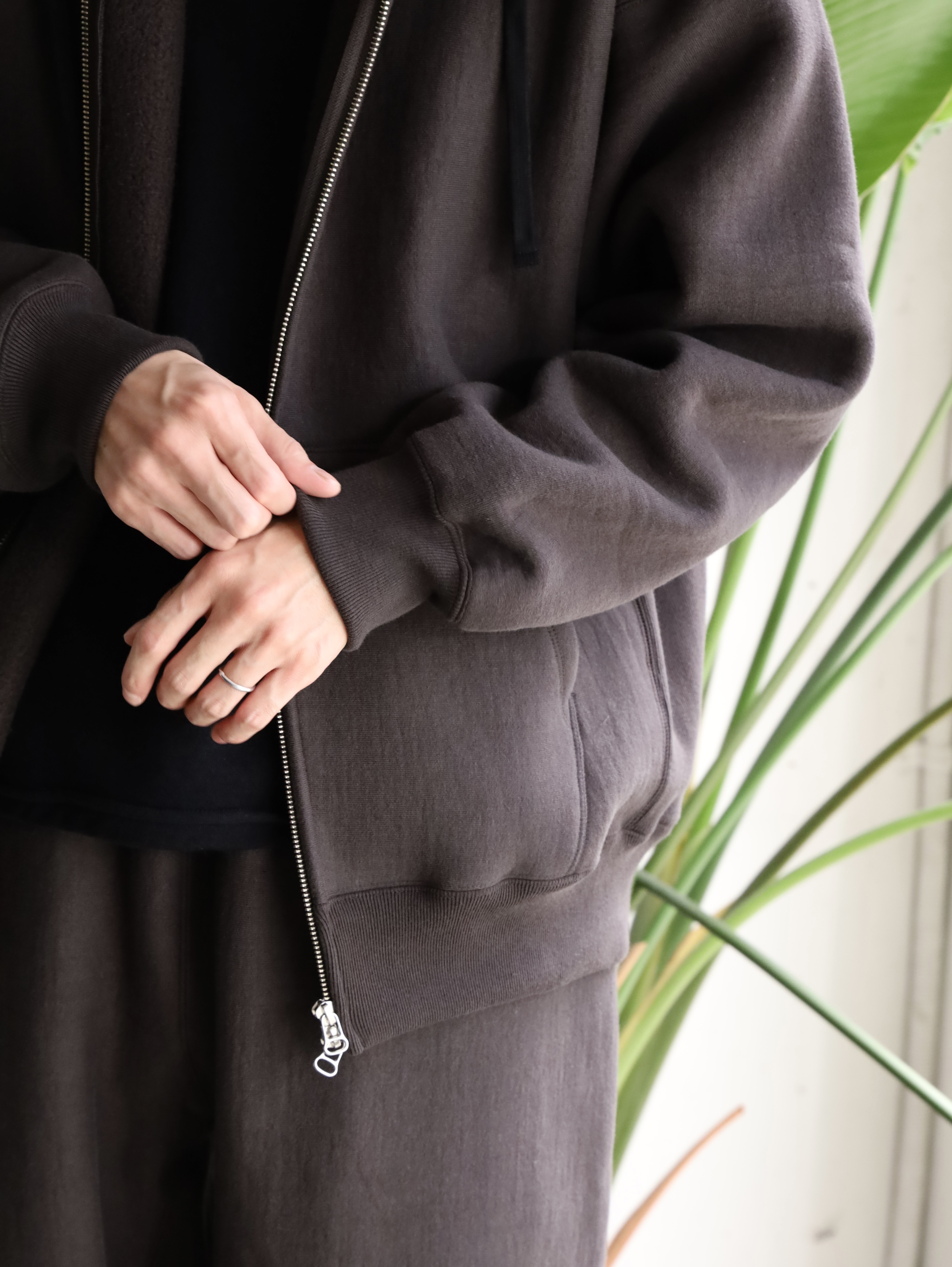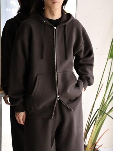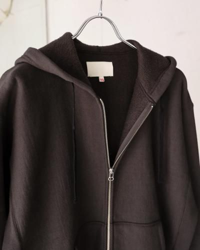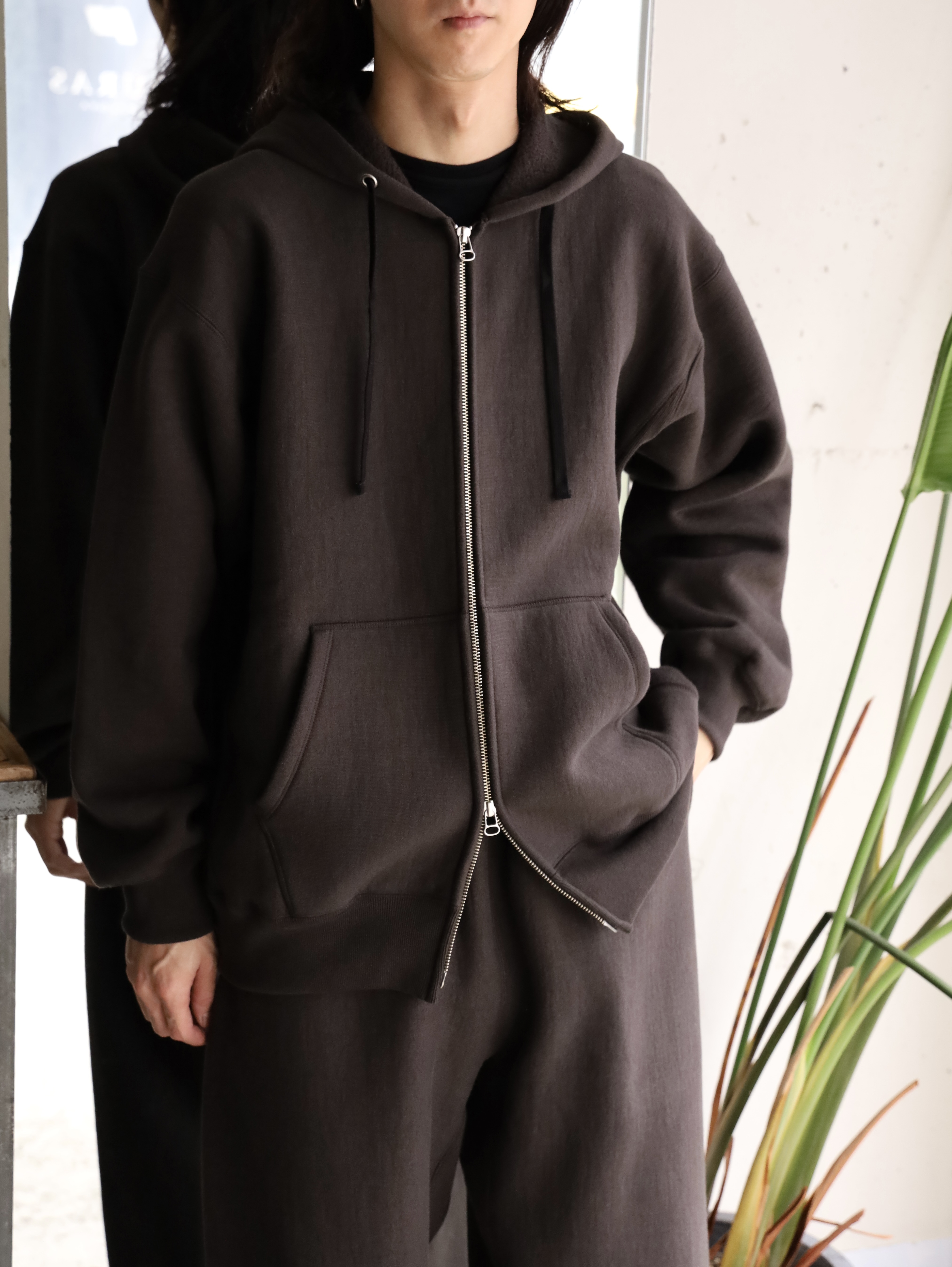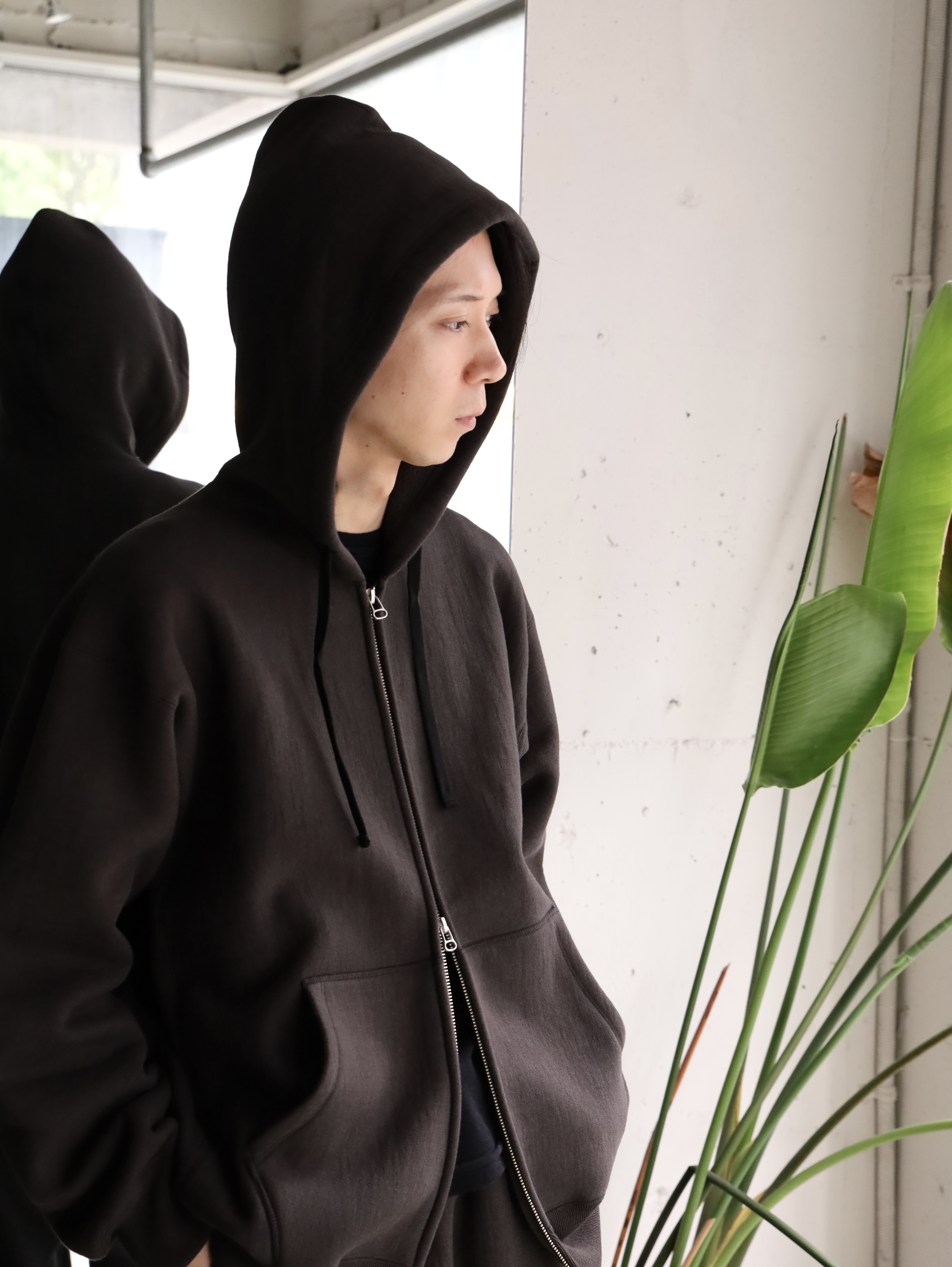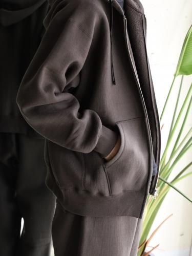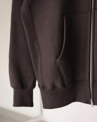 クラシックなデザインのジップアップフーディー。古いスポーツウェアからインスパイアされた、肩線がシームレスで肩傾斜のないT字のシルエットを再現。余った生地が脇下で溜まるルーズな雰囲気がとてもクラシカルです。全体的にゆとりのあるブランドらしいルーズサイジング。インナーに肉厚な物も着込めるため、アウターとしても活躍してくれます。生地には、和歌山のニッターが吊り編み機で編み上げたオリジナルの吊り編み3飛び裏毛を使用。仕上げに裏起毛を施しています。しっかりと度目を詰めて 編立てた3飛び裏毛ですが、吊り編みならではの空気を含んだふっくらとした生地感と、着用と洗濯を重ねてもダレずに身体に馴染むキックバック(伸縮性)が魅力です。
