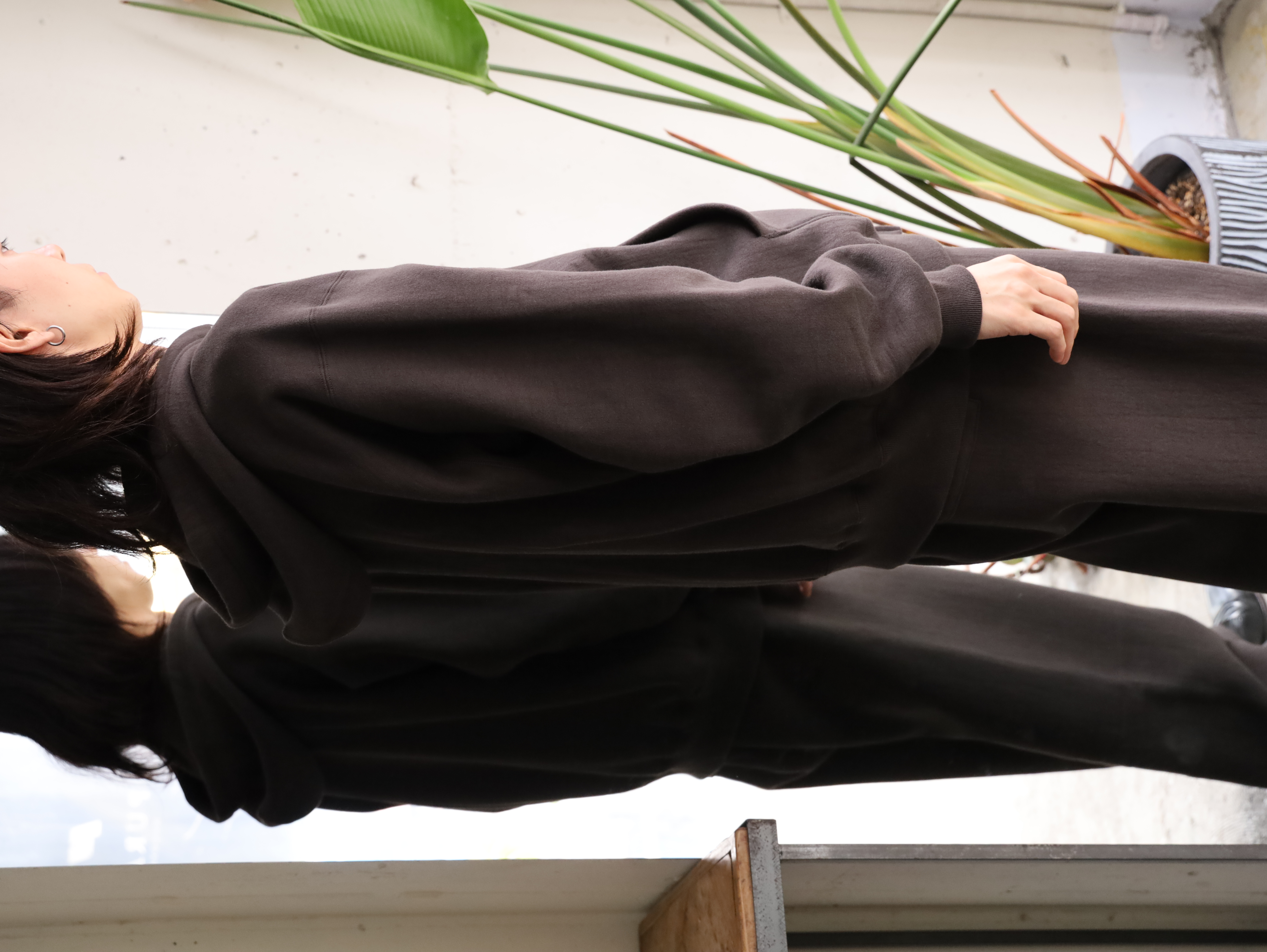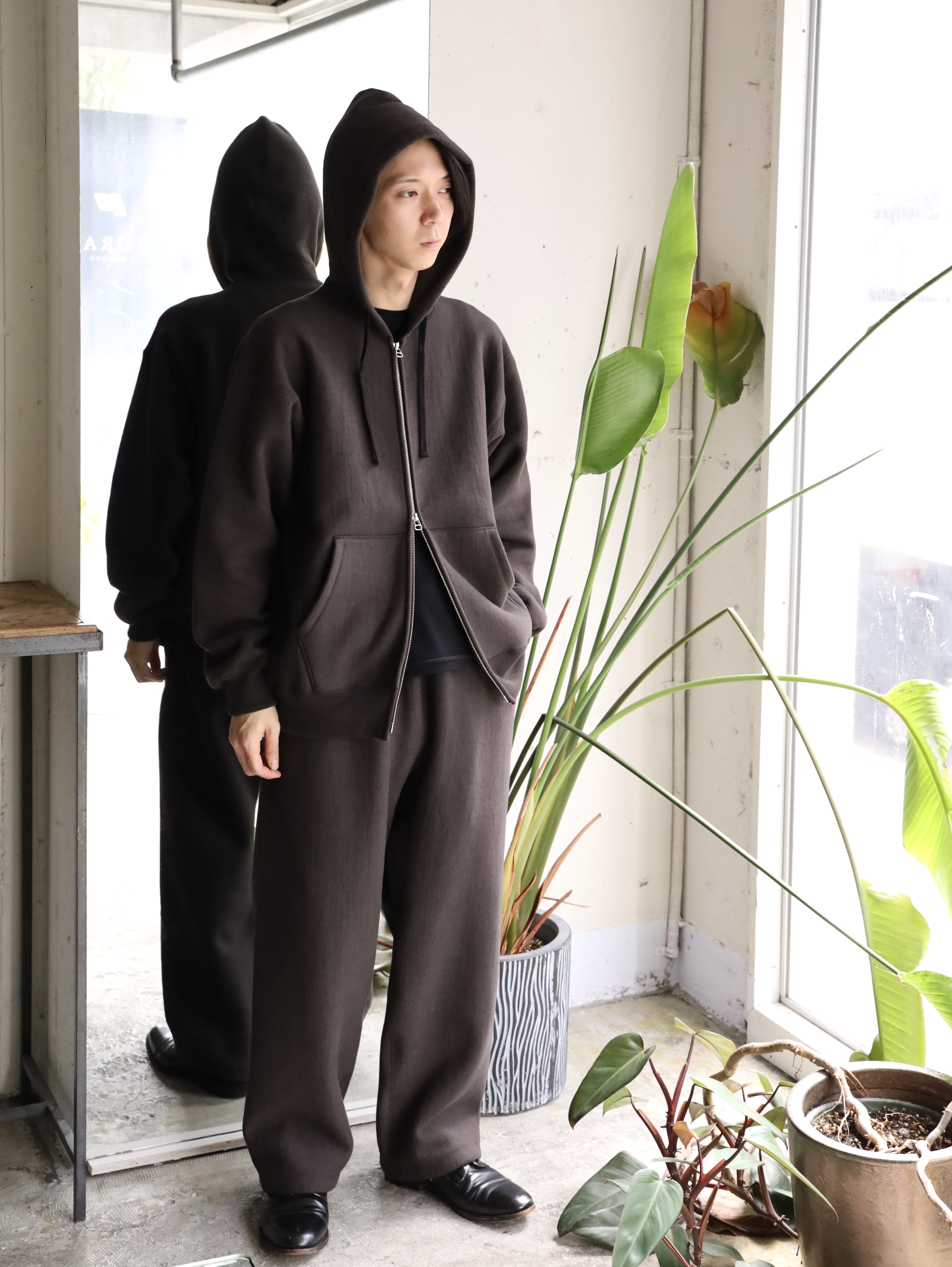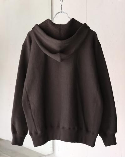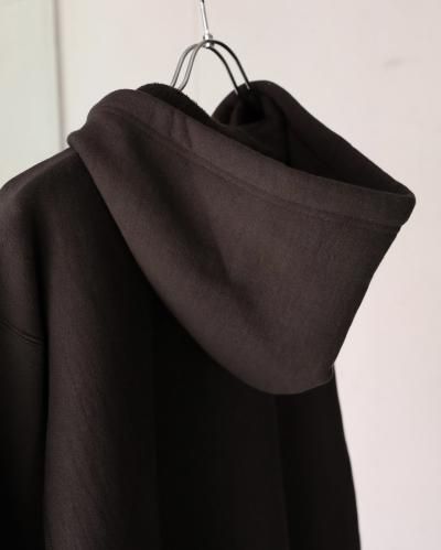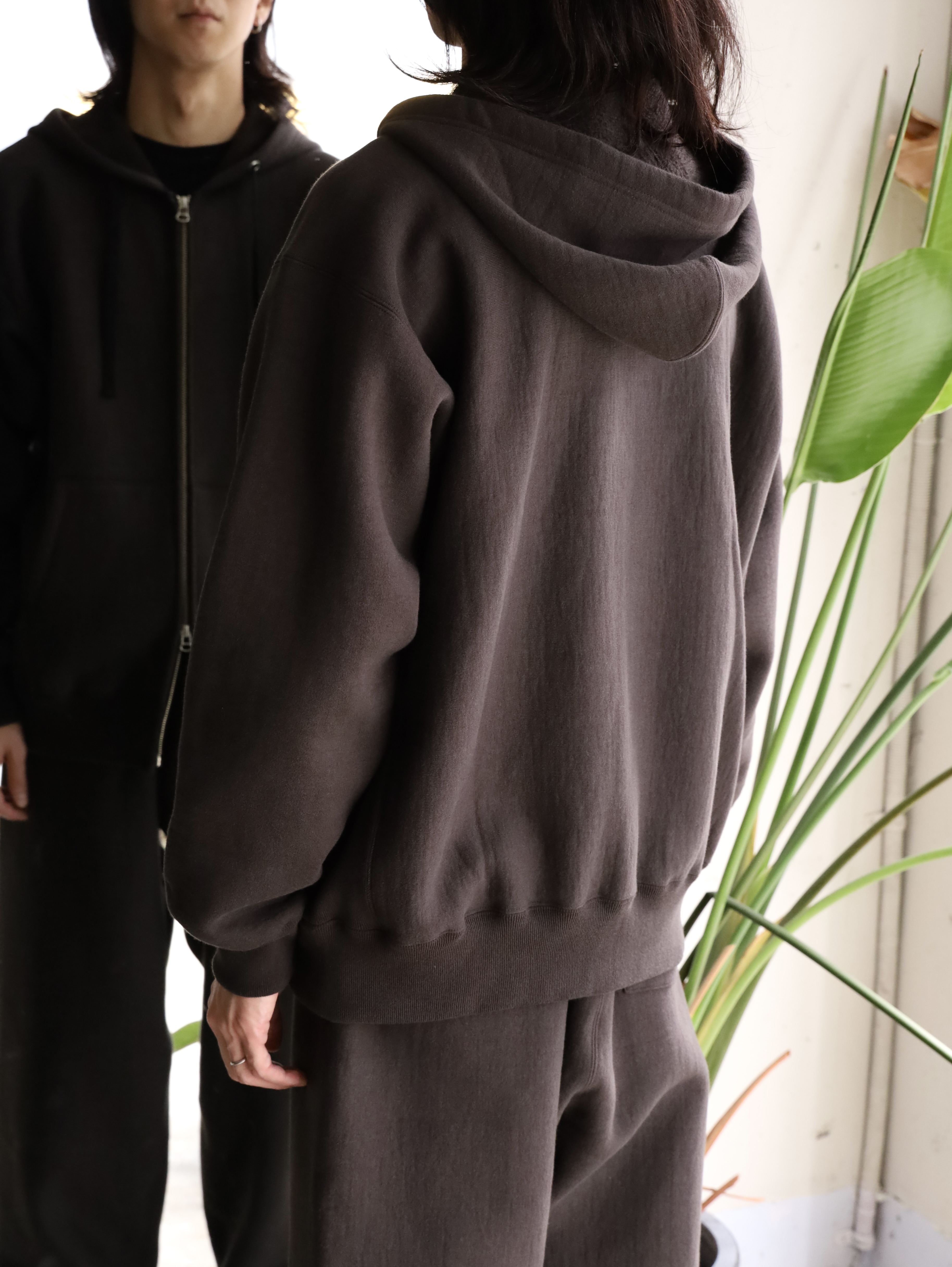 クラシックなデザインのジップアップフーディー。古いスポーツウェアからインスパイアされた、肩線がシームレスで肩傾斜のないT字のシルエットを再現。余った生地が脇下で溜まるルーズな雰囲気がとてもクラシカルです。全体的にゆとりのあるブランドらしいルーズサイジング。インナーに肉厚な物も着込めるため、アウターとしても活躍してくれます。生地には、和歌山のニッターが吊り編み機で編み上げたオリジナルの吊り編み3飛び裏毛を使用。仕上げに裏起毛を施しています。しっかりと度目を詰めて 編立てた3飛び裏毛ですが、吊り編みならではの空気を含んだふっくらとした生地感と、着用と洗濯を重ねてもダレずに身体に馴染むキックバック(伸縮性)が魅力です。