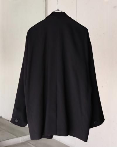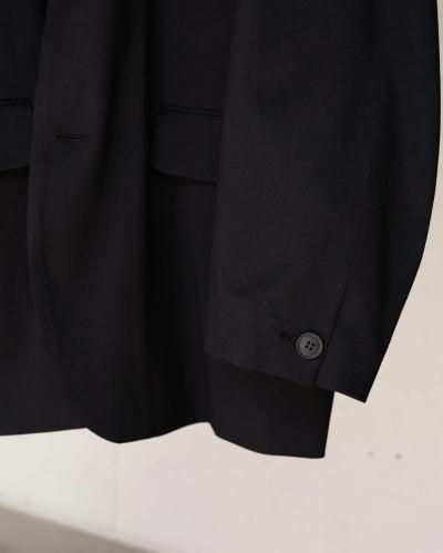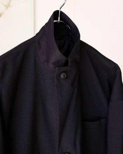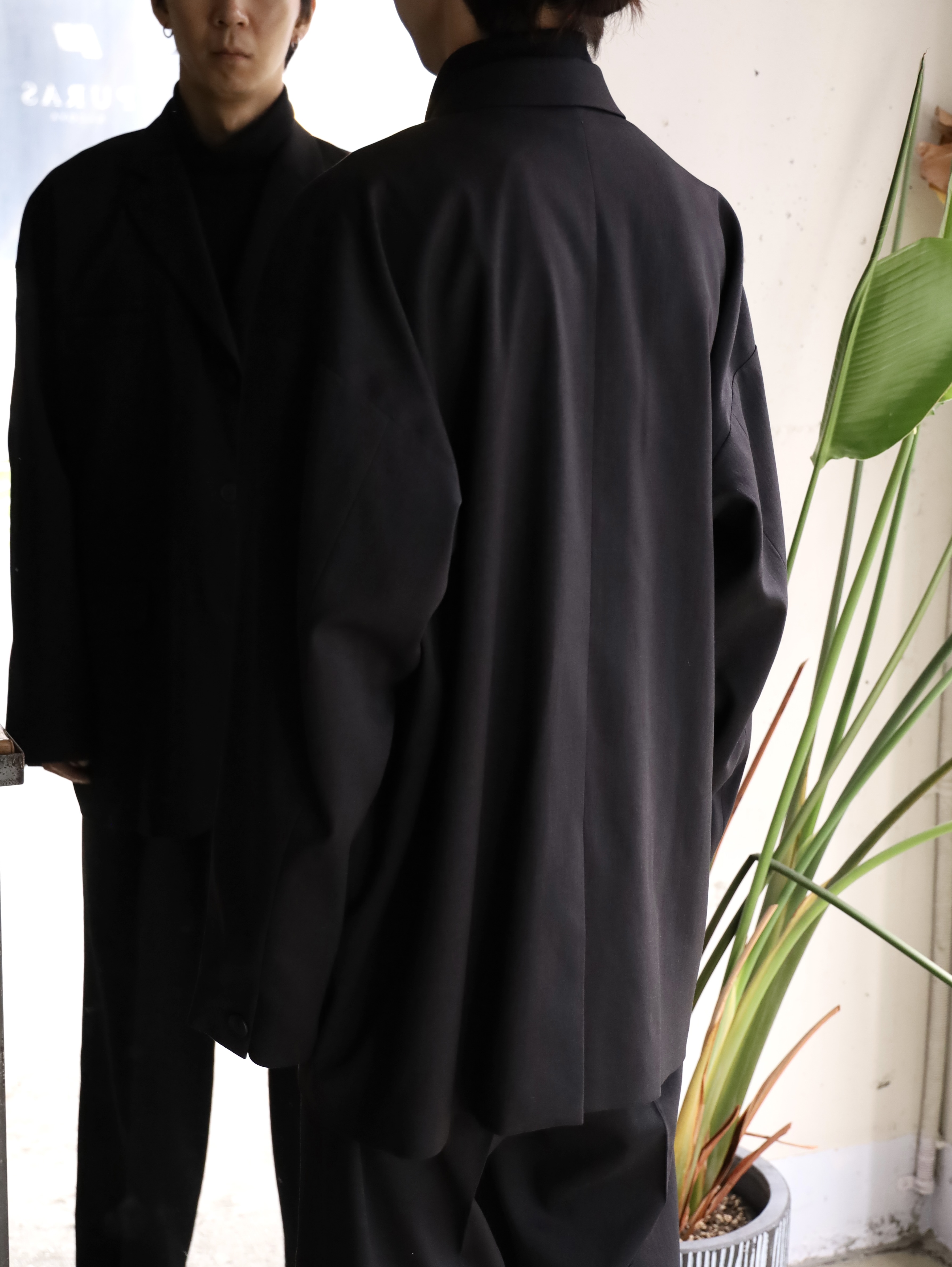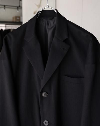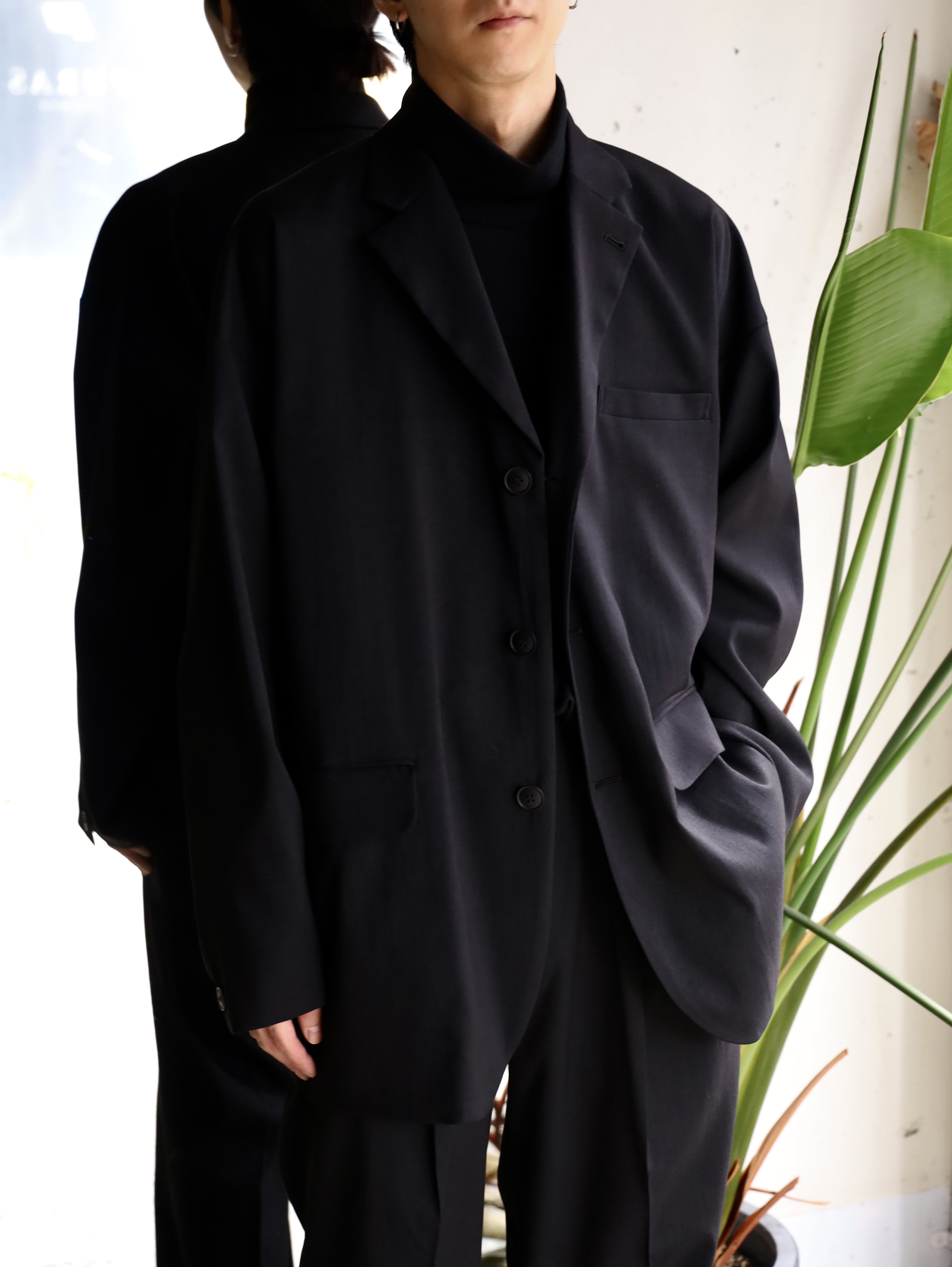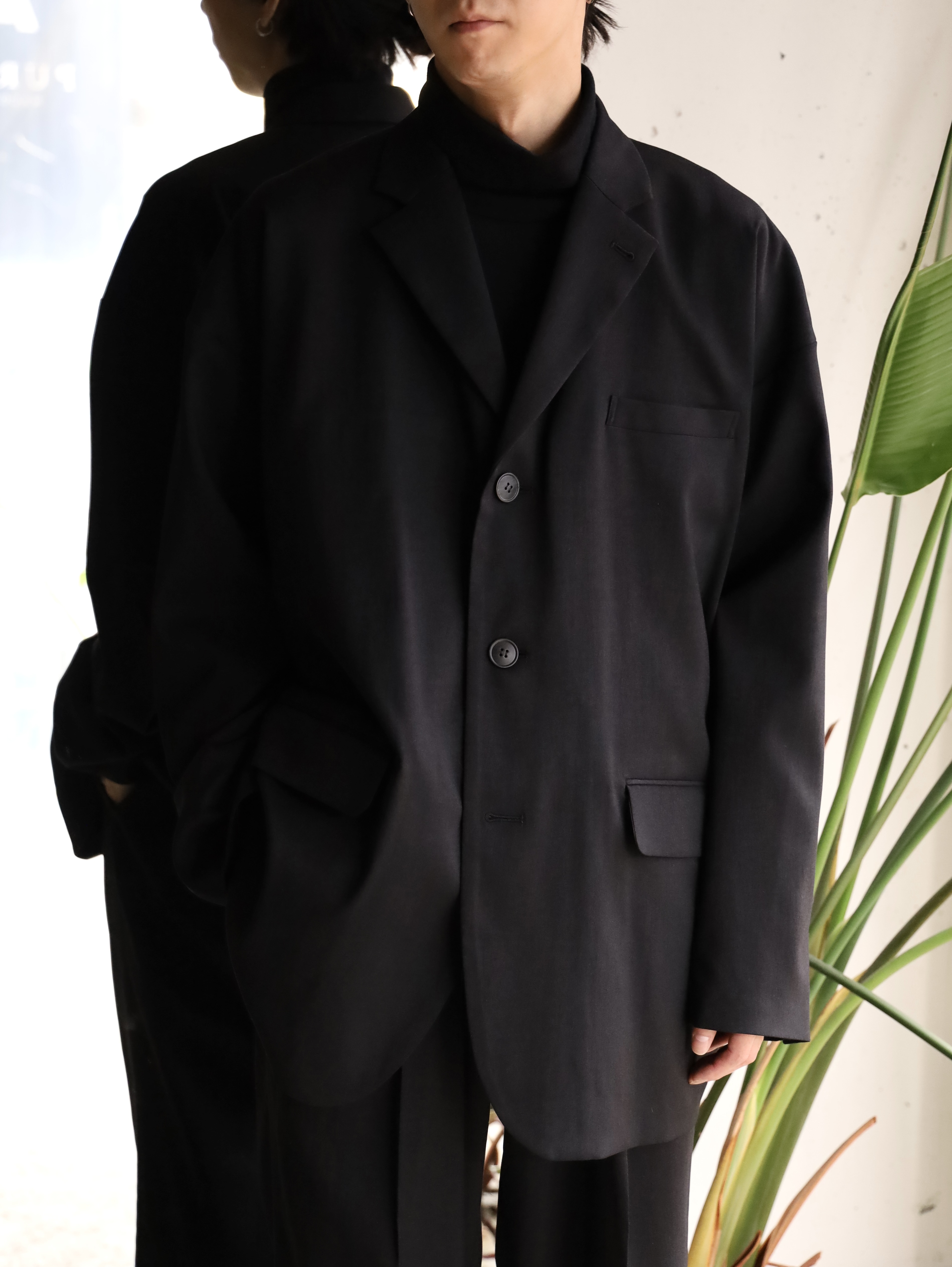 ルーズなサイズ感とドロップショルダーが特徴の、クラシックなテーラードジャケット。3つボタンデザインに本切羽仕立てで本格さがありながらも、肩肘張らずリラックスして着用できる作りです。厚手のインナーを着込んでも余裕のあるサイジング。ジャケットとしての使い方のみならず、軽アウターとしても活躍してくれそうです。生地には、生地には、サスティナブルなリサイクルポリエステルを用いて、ウールのスーツ地を再現したオリジナルのギャバジン生地を使用。ポリエステルとは思えないウールのスーツ生地の様な品格と風合い、奥行きのあるカラーリングが特徴で、優しい力で伸びる圧迫感のないリラックスストレッチが魅力です。ご家庭でのお洗濯も可能な点も嬉しいポイント。通年お使いいただける頼れる1着です。
