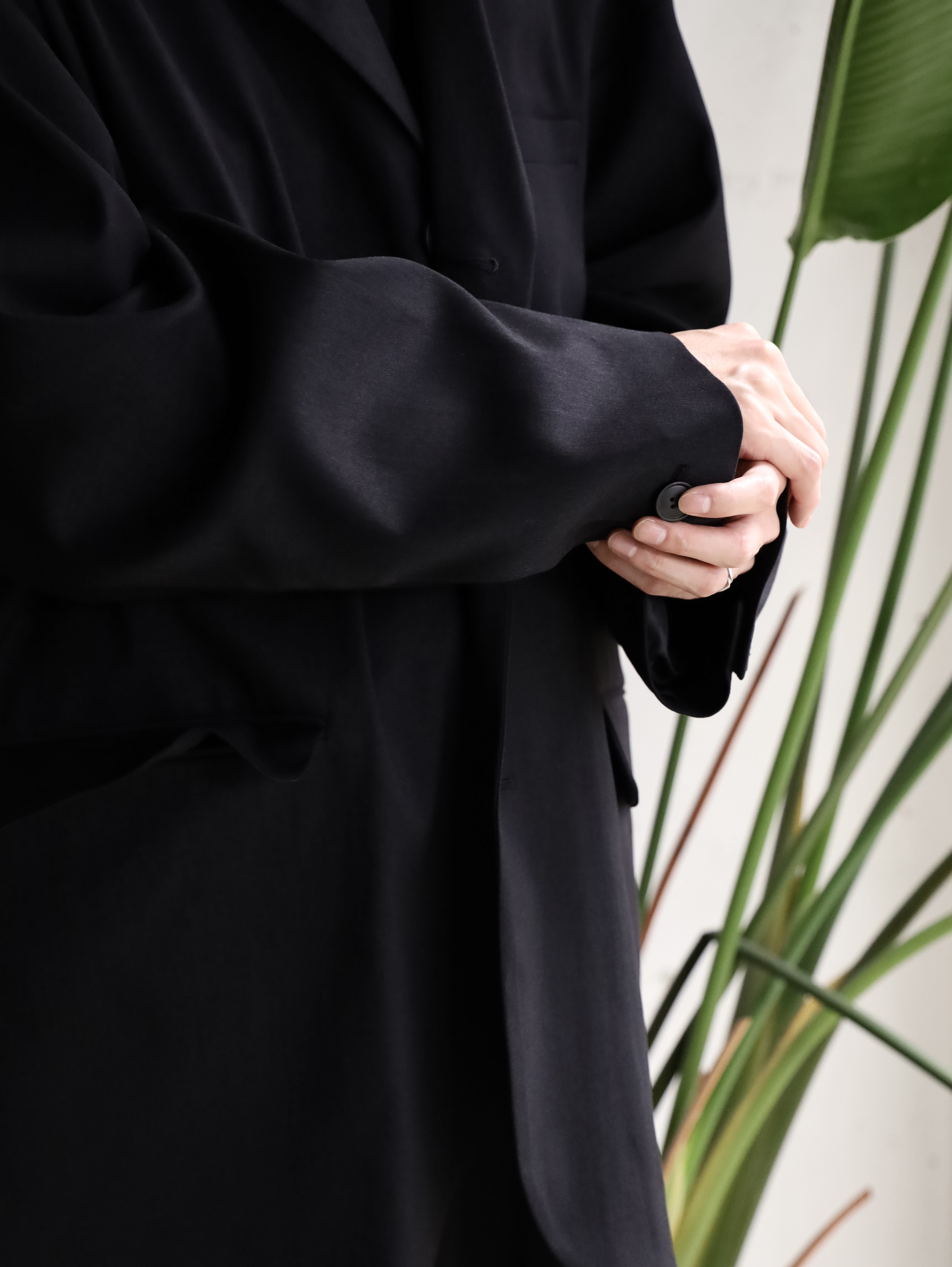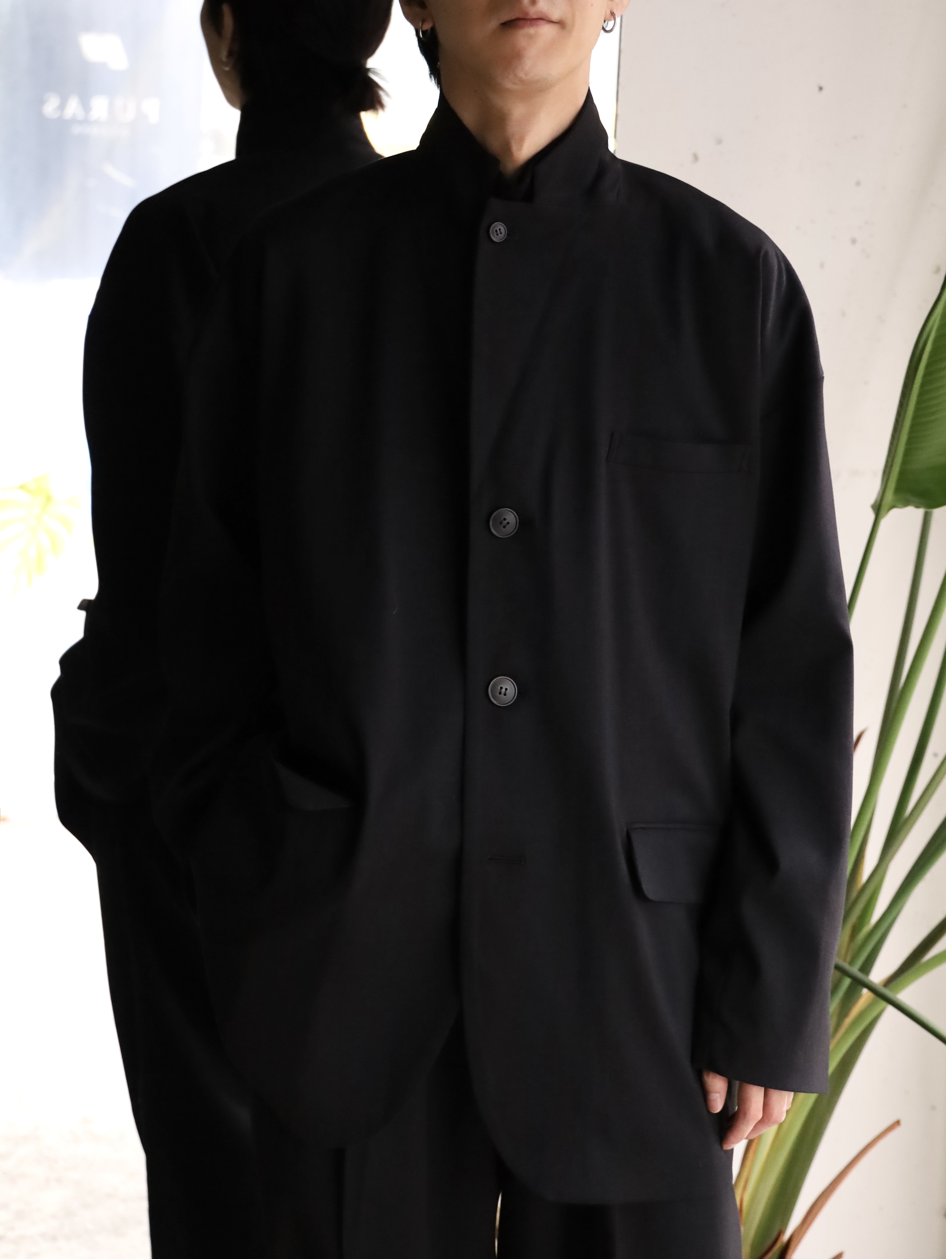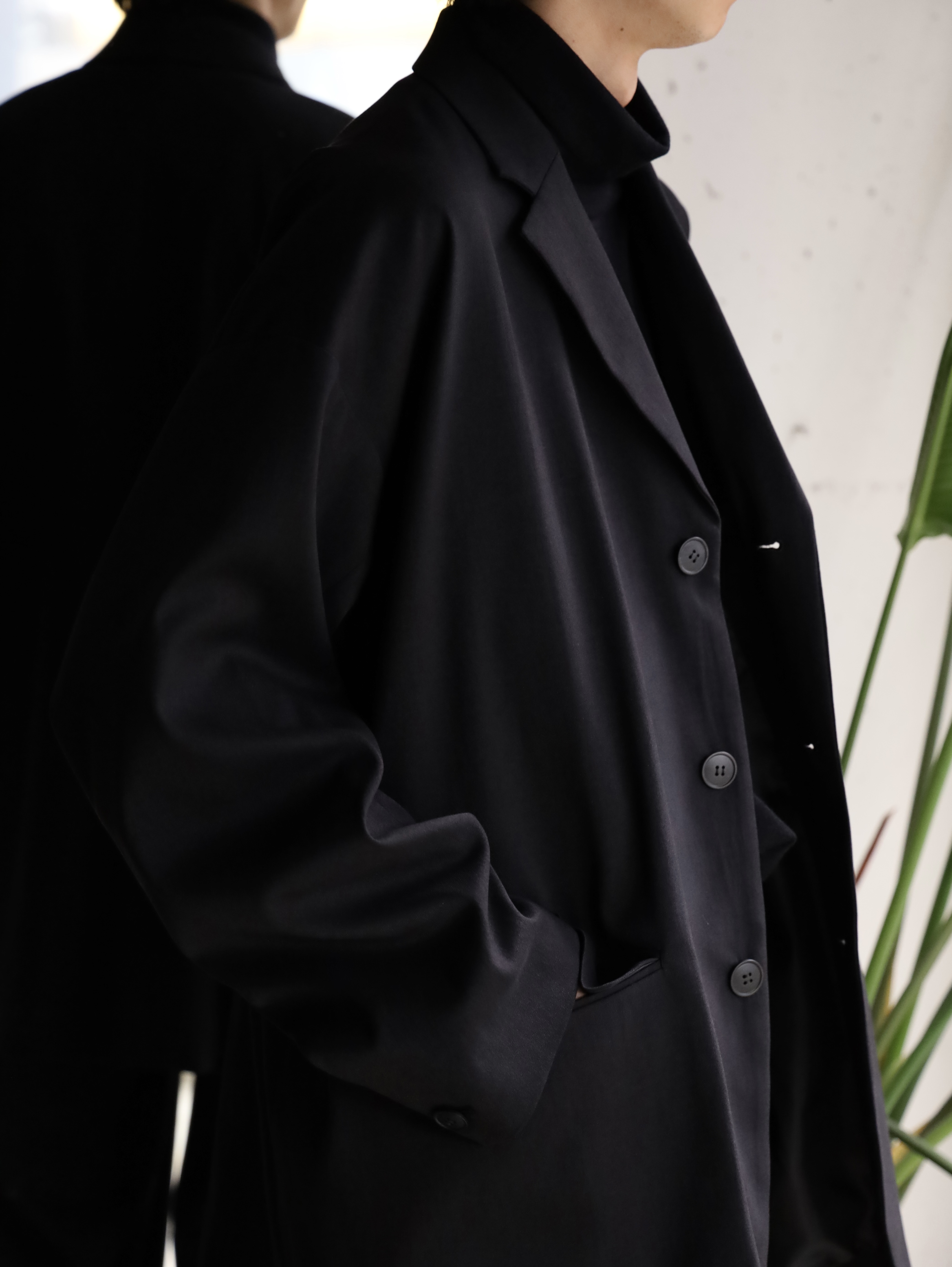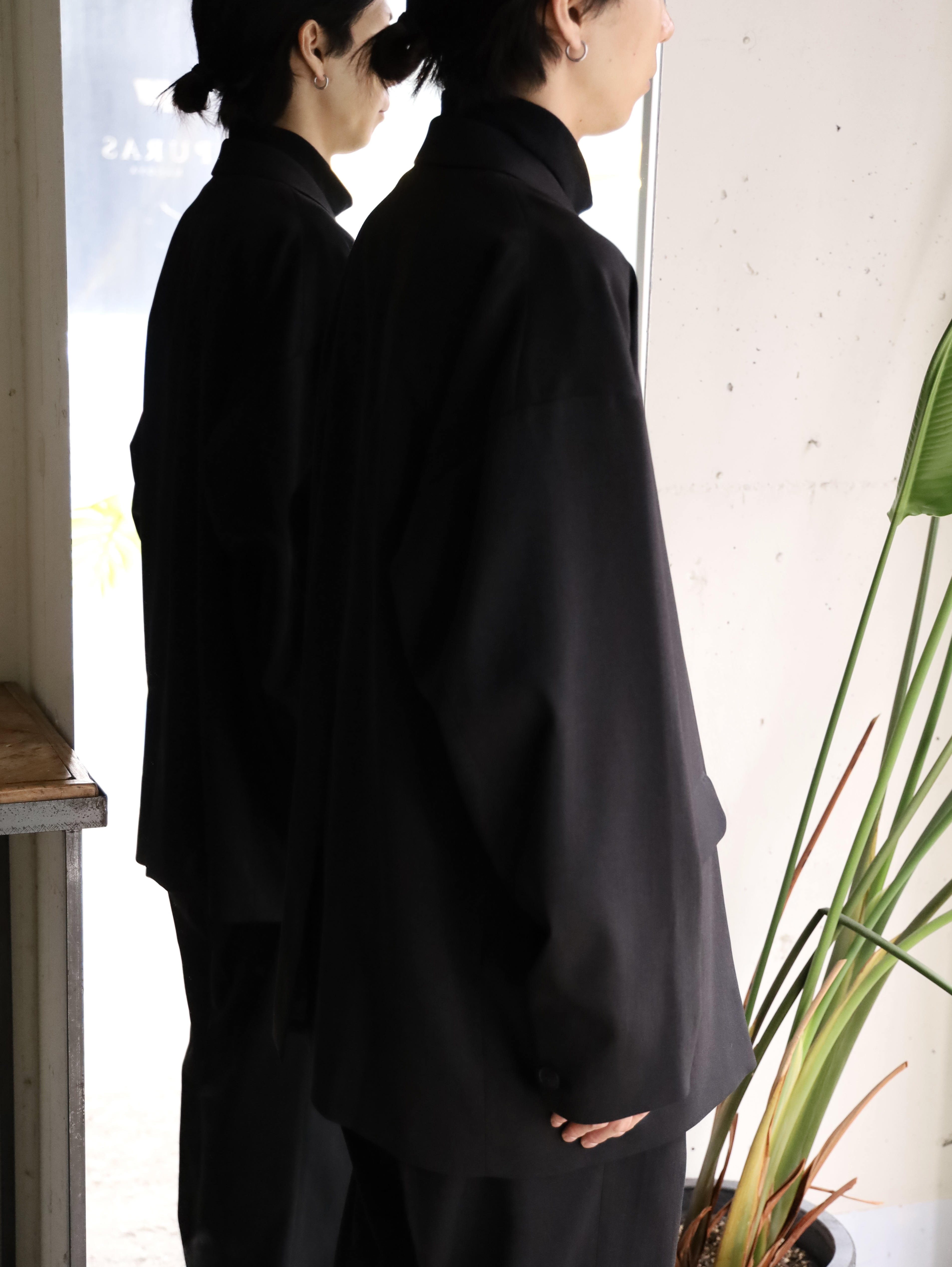 ルーズなサイズ感とドロップショルダーが特徴の、クラシックなテーラードジャケット。3つボタンデザインに本切羽仕立てで本格さがありながらも、肩肘張らずリラックスして着用できる作りです。厚手のインナーを着込んでも余裕のあるサイジング。ジャケットとしての使い方のみならず、軽アウターとしても活躍してくれそうです。生地には、生地には、サスティナブルなリサイクルポリエステルを用いて、ウールのスーツ地を再現したオリジナルのギャバジン生地を使用。ポリエステルとは思えないウールのスーツ生地の様な品格と風合い、奥行きのあるカラーリングが特徴で、優しい力で伸びる圧迫感のないリラックスストレッチが魅力です。ご家庭でのお洗濯も可能な点も嬉しいポイント。通年お使いいただける頼れる1着です。