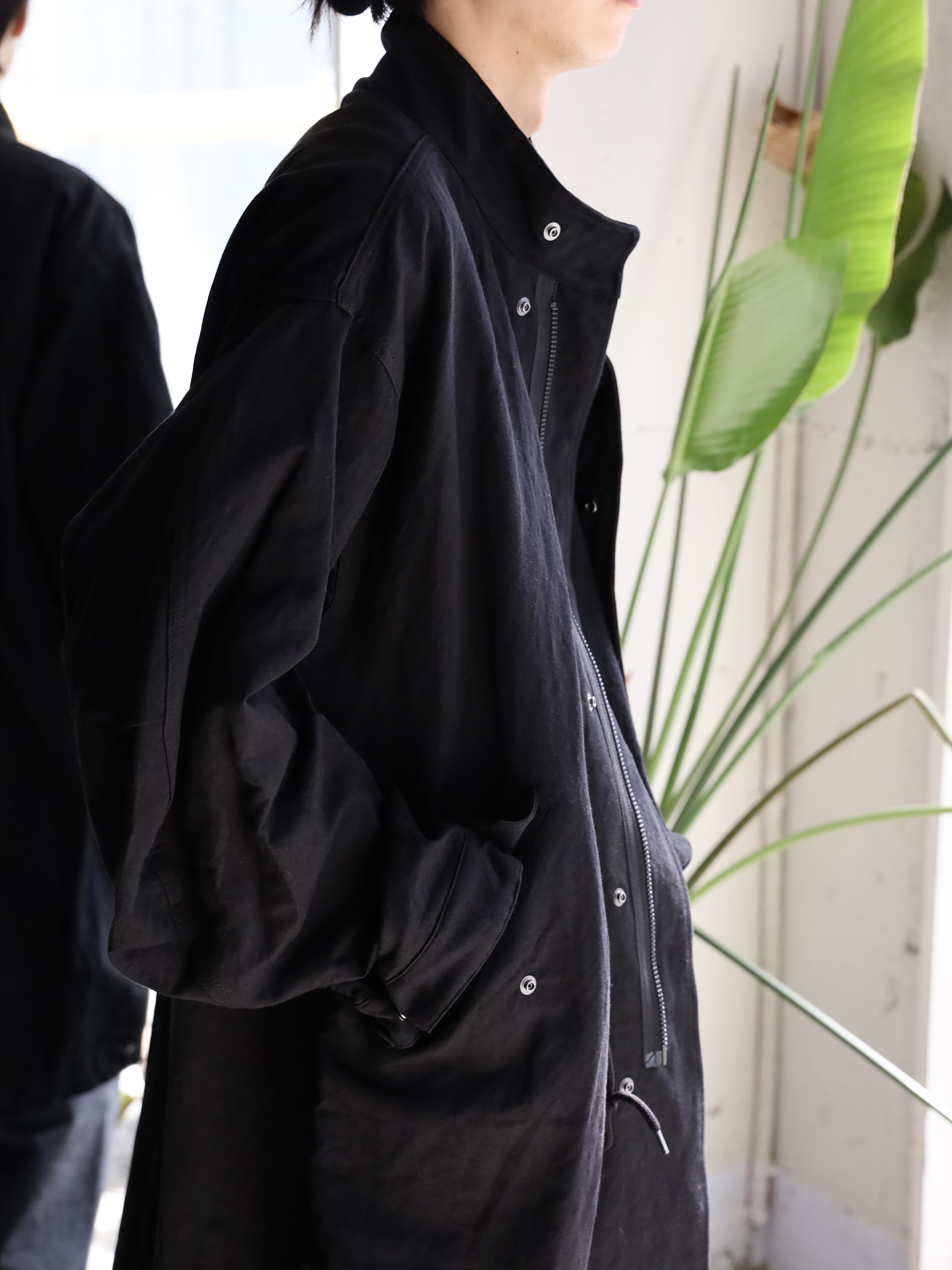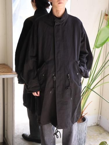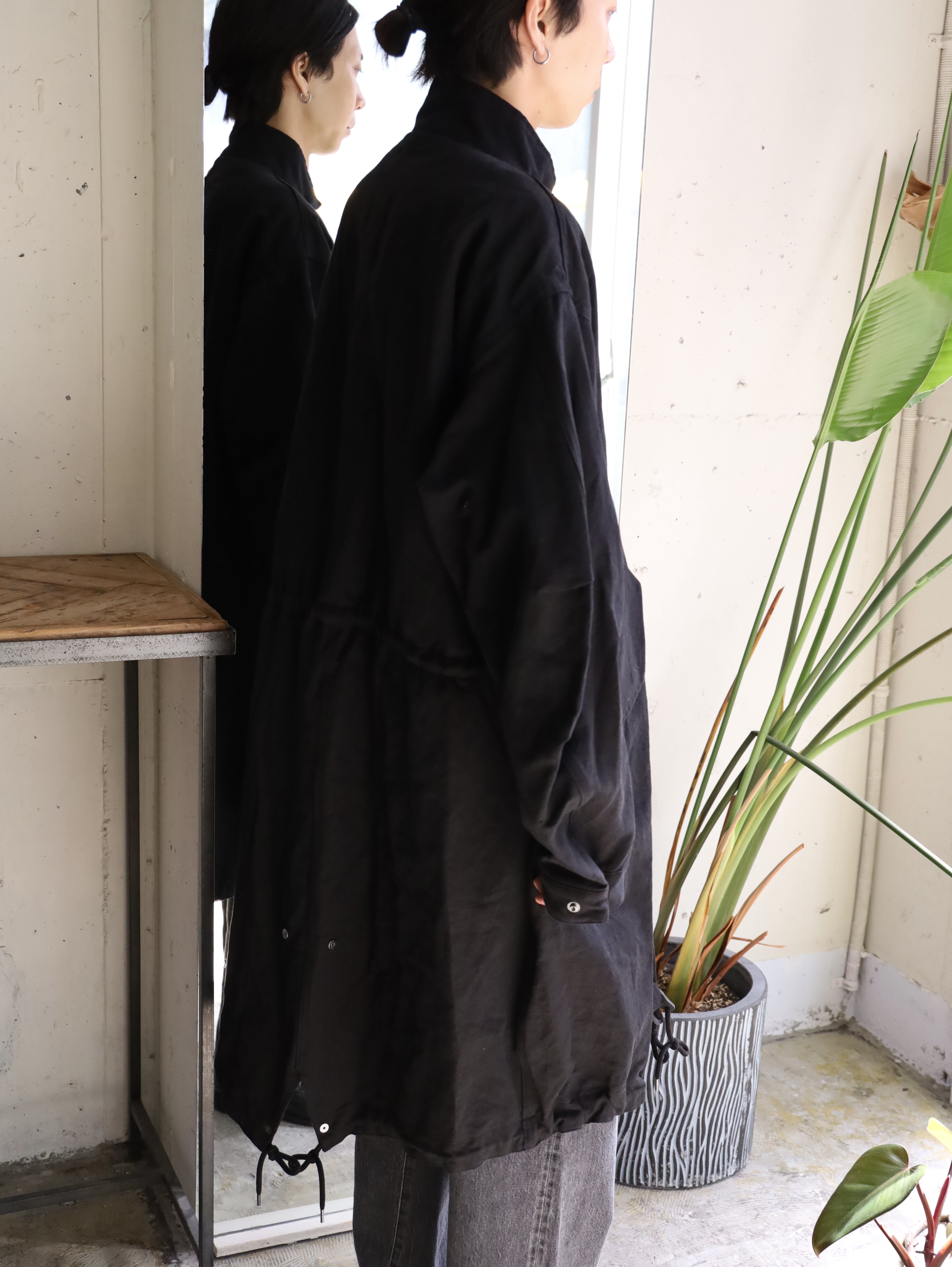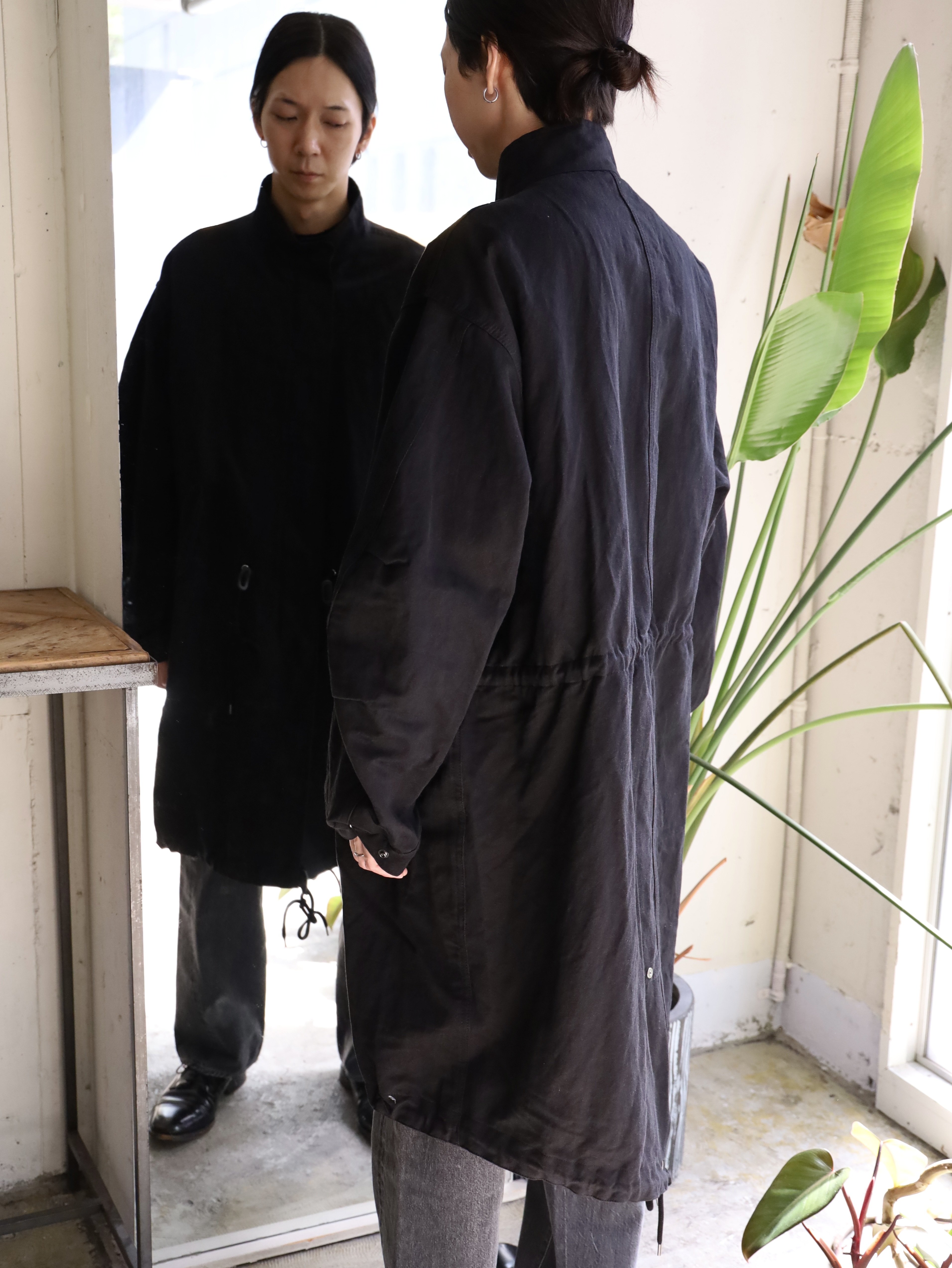 適度なハリコシのあるコットンリネンの生地を採用したフィッシュテールコート。経糸・緯糸共に特殊な染色技法を施し、繊維の奥深くまで染めることで色の深さが際立っています。上質なリネンとコットンを掛け合わさることで、特徴的な光沢感も感じられる仕上がり。無骨な印象のミリタリーアイテムですが、繊細さと風合いを感じられる1着となっており、古着のそれとは全く違う印象を受けます。オーバーサイジングで厚手のインナーの上からでも羽織りやすいのが嬉しいポイント。着用を重ねることでより身体に馴染み、経年変化を楽しんでいただけます。