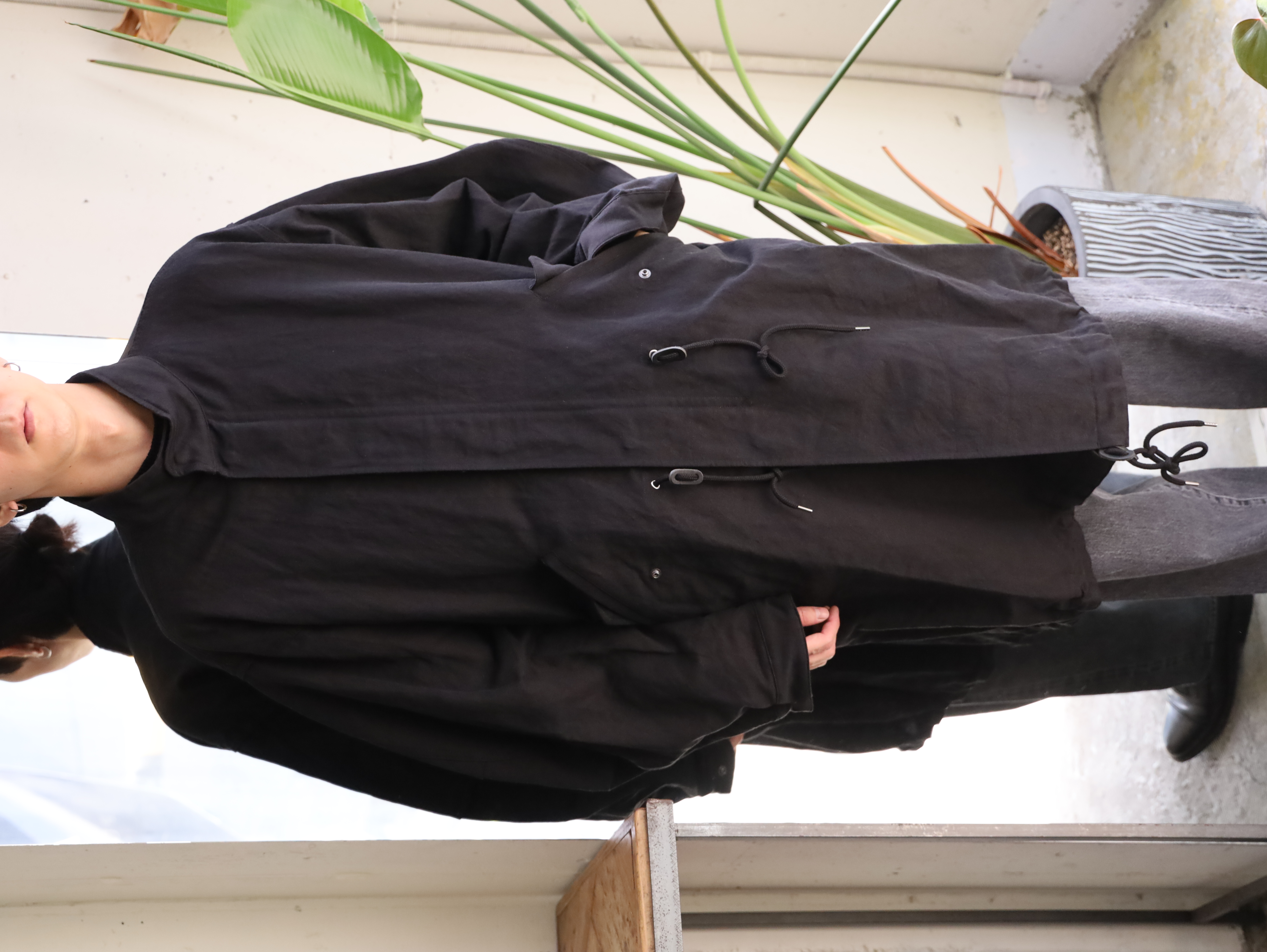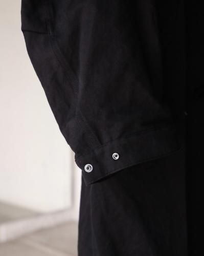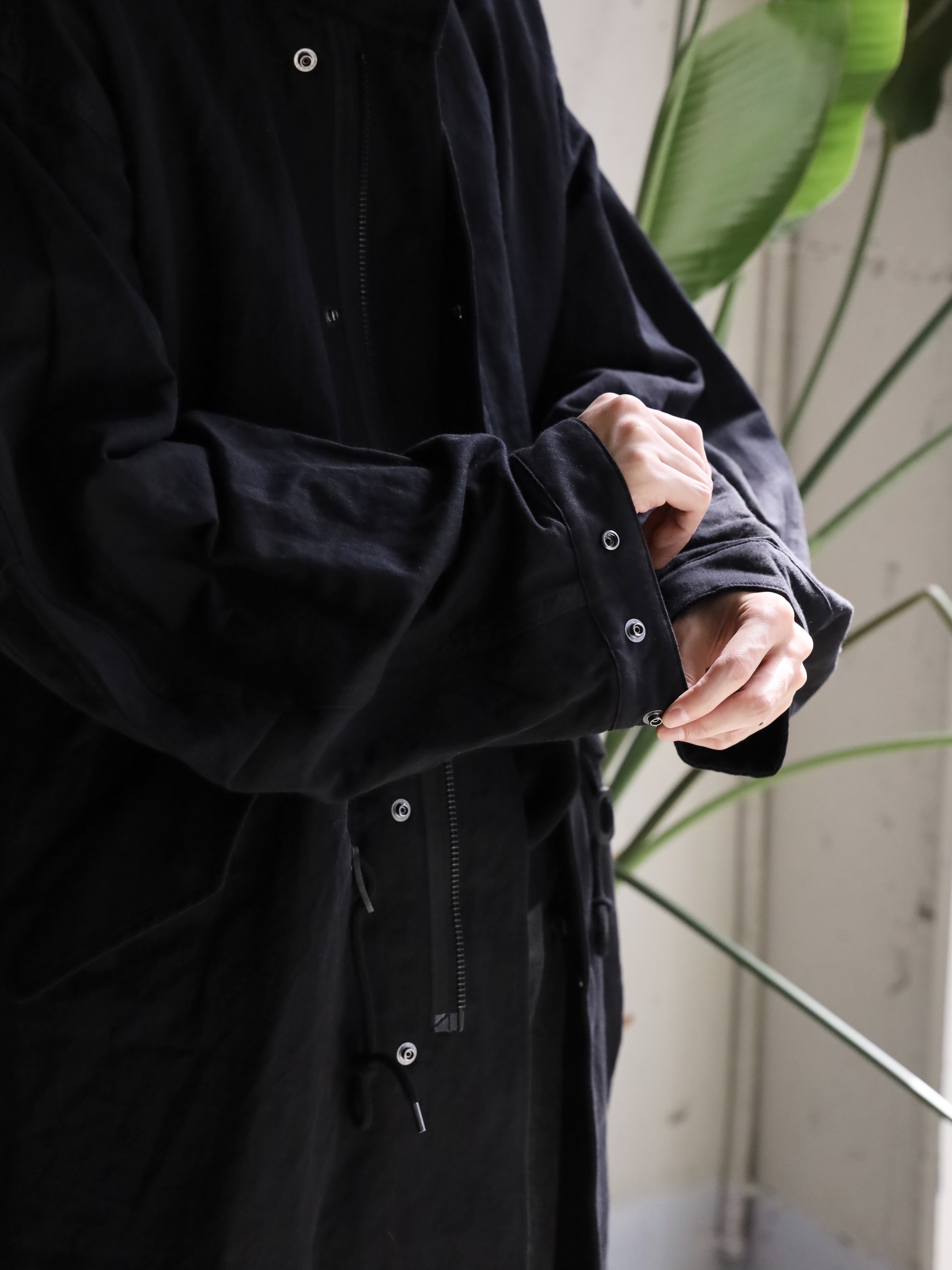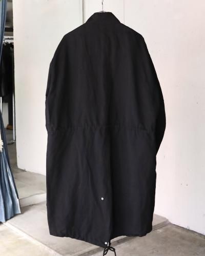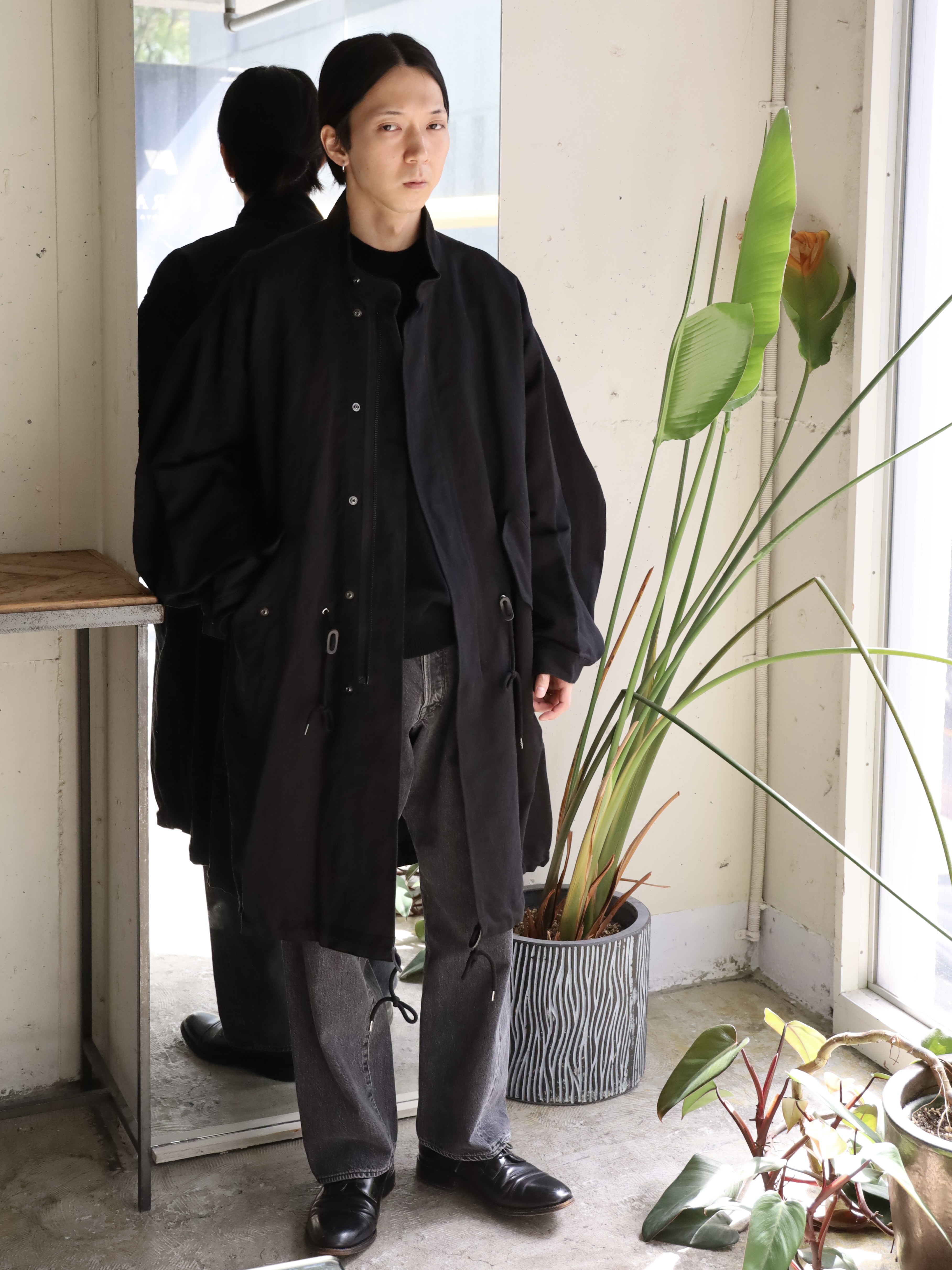適度なハリコシのあるコットンリネンの生地を採用したフィッシュテールコート。経糸・緯糸共に特殊な染色技法を施し、繊維の奥深くまで染めることで色の深さが際立っています。上質なリネンとコットンを掛け合わさることで、特徴的な光沢感も感じられる仕上がり。無骨な印象のミリタリーアイテムですが、繊細さと風合いを感じられる1着となっており、古着のそれとは全く違う印象を受けます。オーバーサイジングで厚手のインナーの上からでも羽織りやすいのが嬉しいポイント。着用を重ねることでより身体に馴染み、経年変化を楽しんでいただけます。
