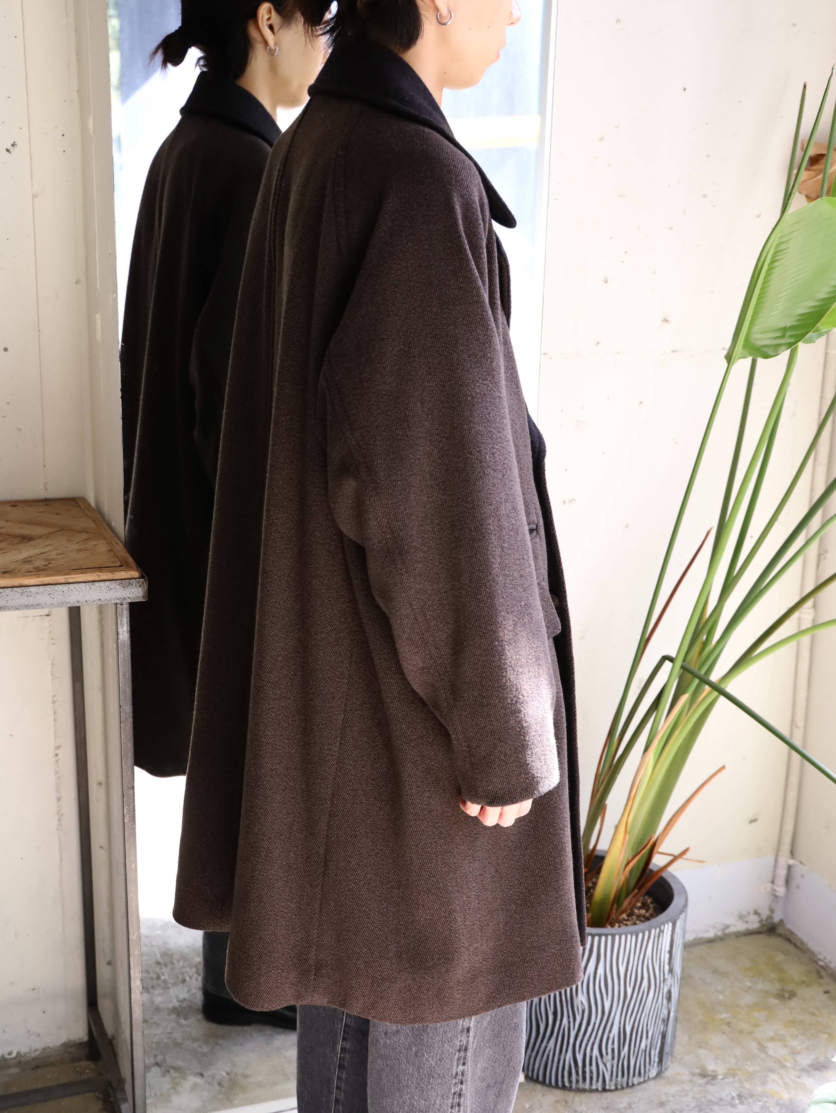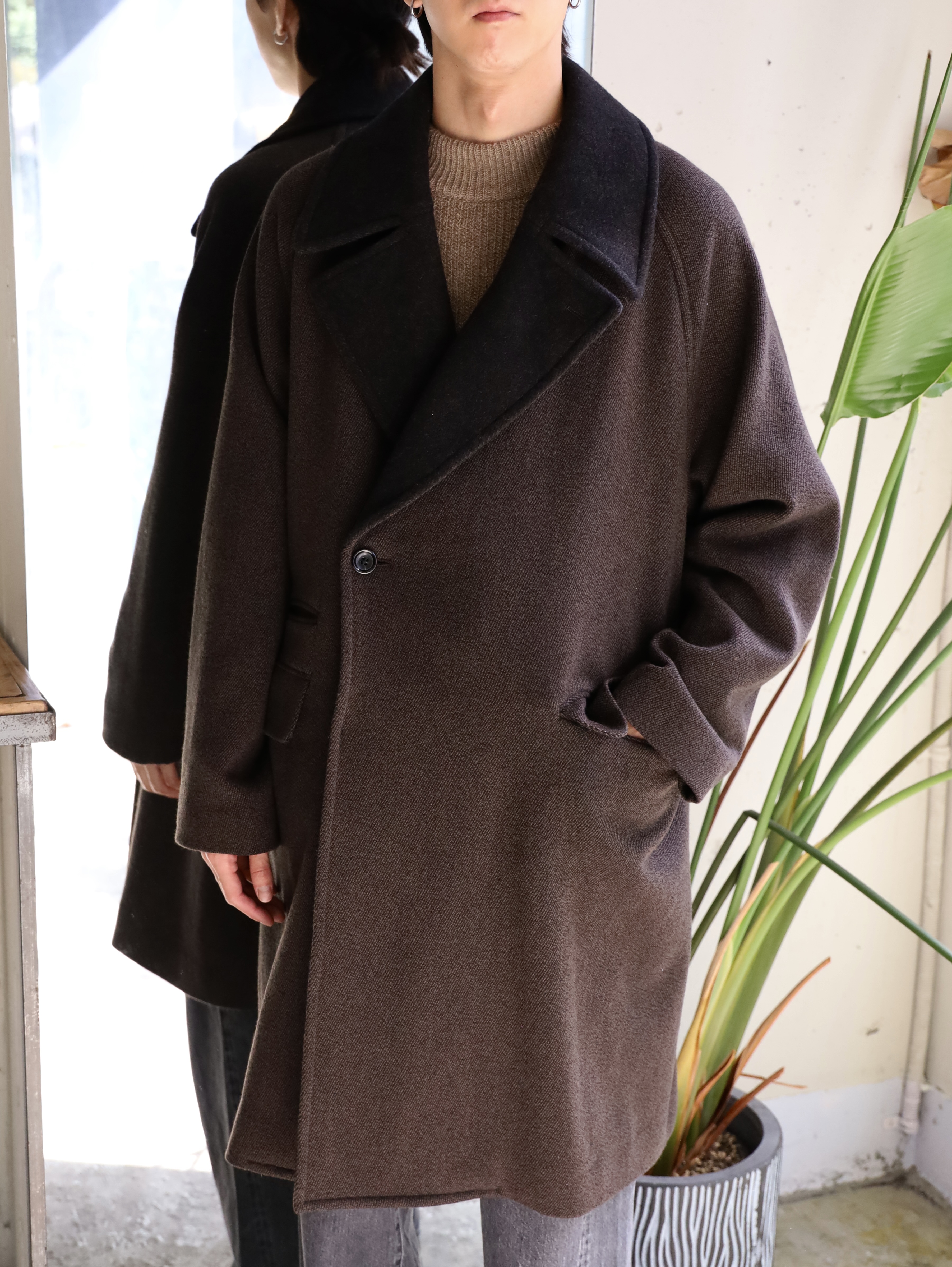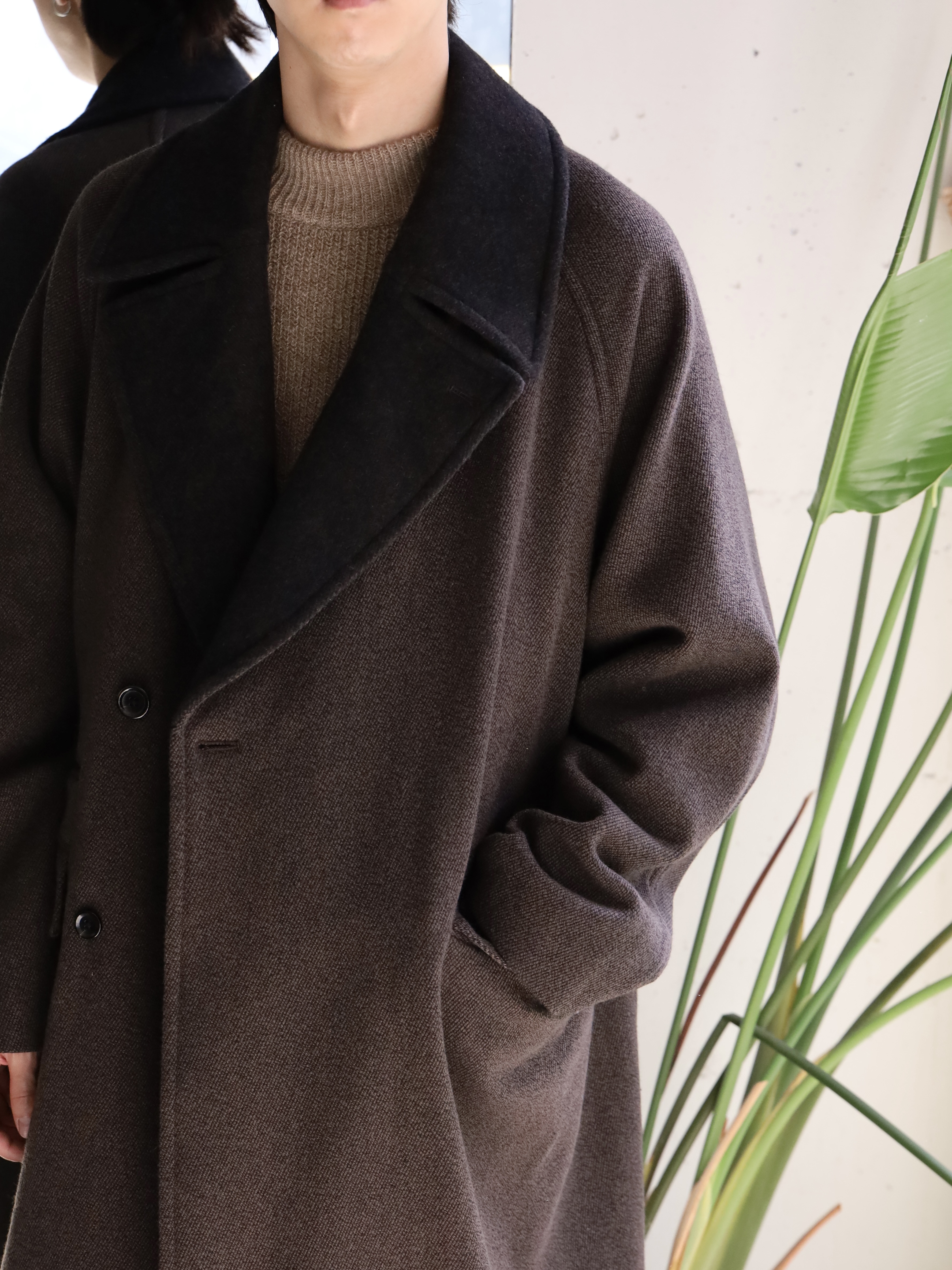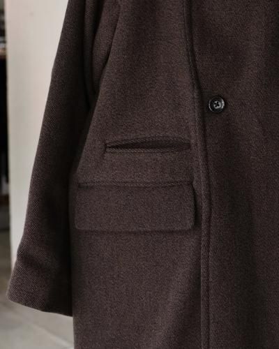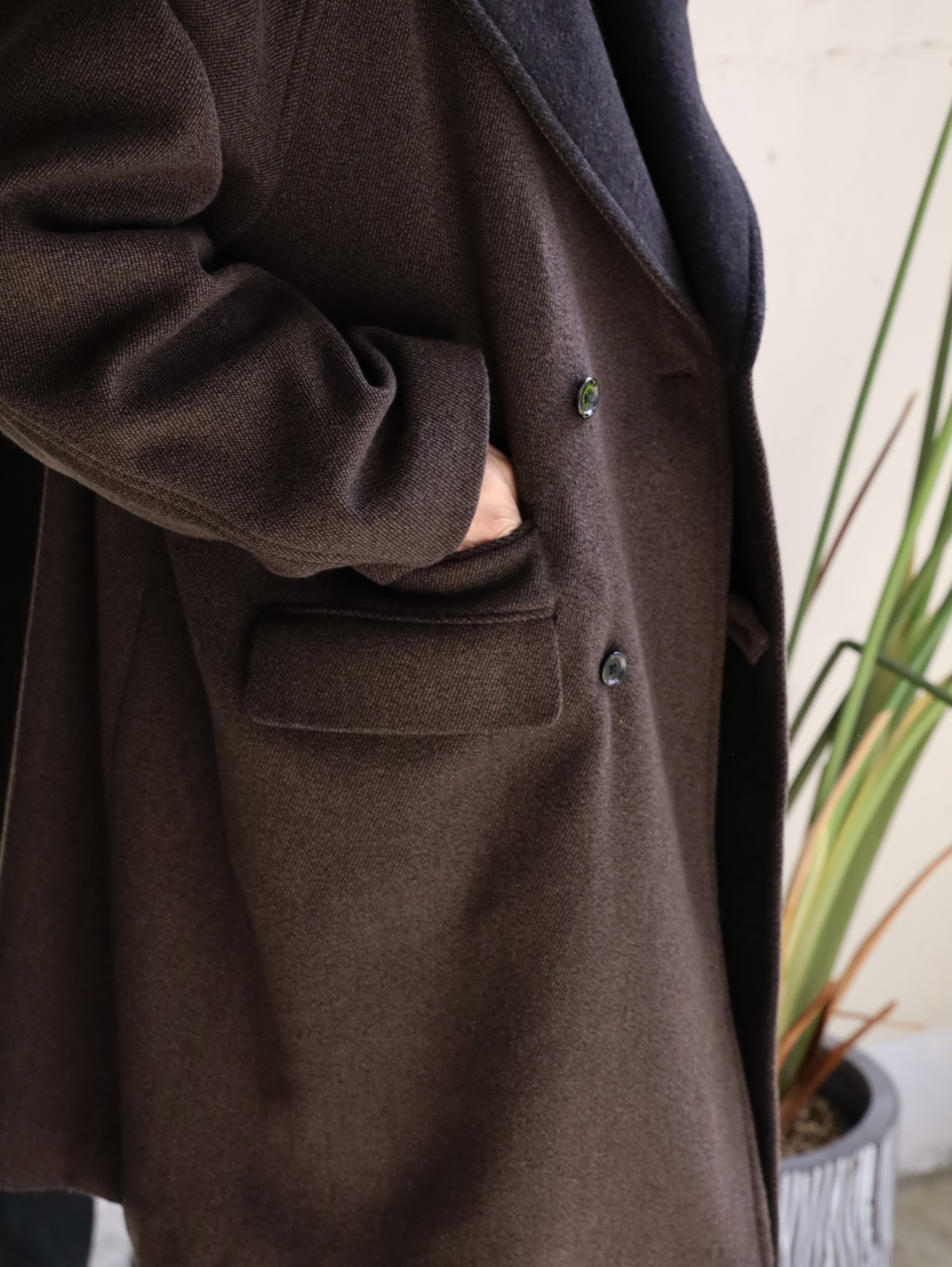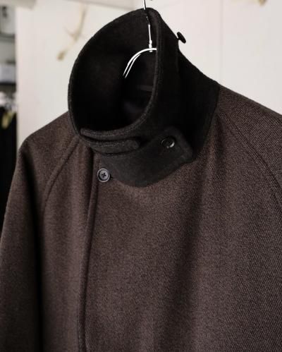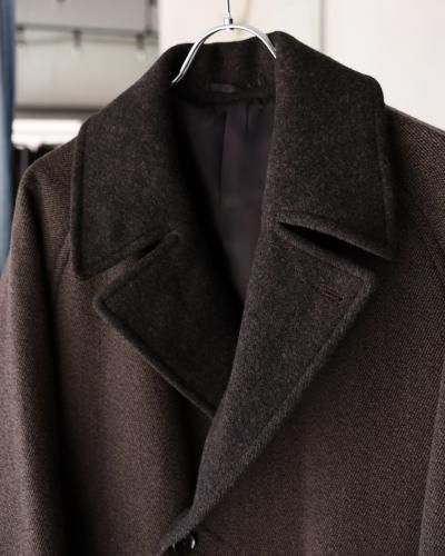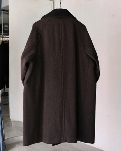 クラシックなオーバーコートをモダンですっきりしたバランスで仕上げたダブルブレステッドコート。襟〜袖周りの収まりと全体のフォルムにこだわり、ブリティッシュなムードでミニマムに仕上げられています。衿とラペルは起毛された裏面を使用し、見た目のアクセントと肌あたりの良さを加えています。重厚な見た目に反した軽さと柔らかさもポイント。厚手のインナーでも着膨れることないゆったりとしたシルエットです。生地には、軽さと膨らみが特徴のミュール紡績されたウール原料とシルクの杢糸で織り上げたウールシルクカルゼを使用。ビンテージファブリックから着想を得ながら、密度や風合い出しの加工に拘って仕上げています。裏起毛をすることで程良い膨らみ感としなやかさを求め、見た目に反した軽さとソフトな風合いが特徴です。