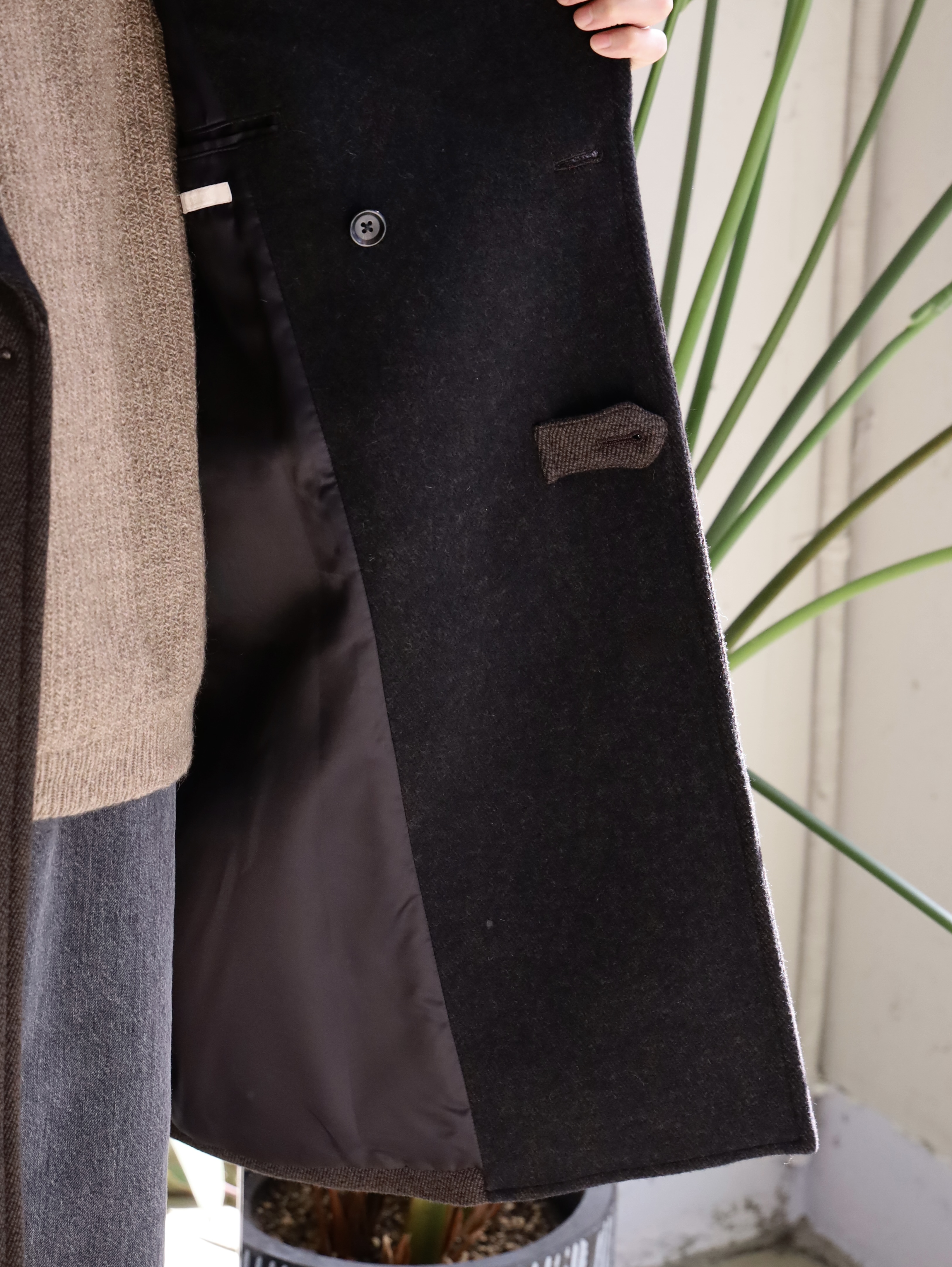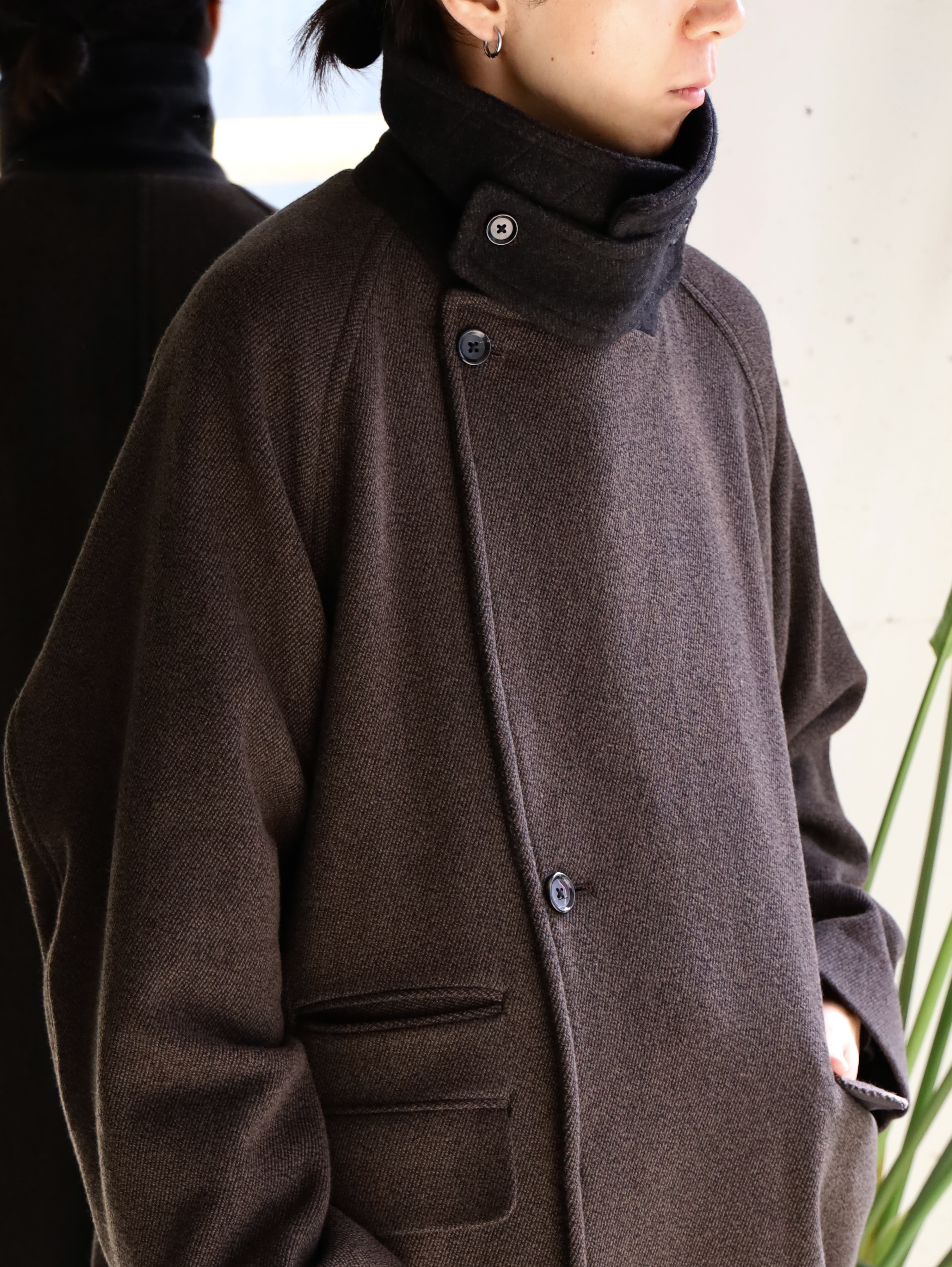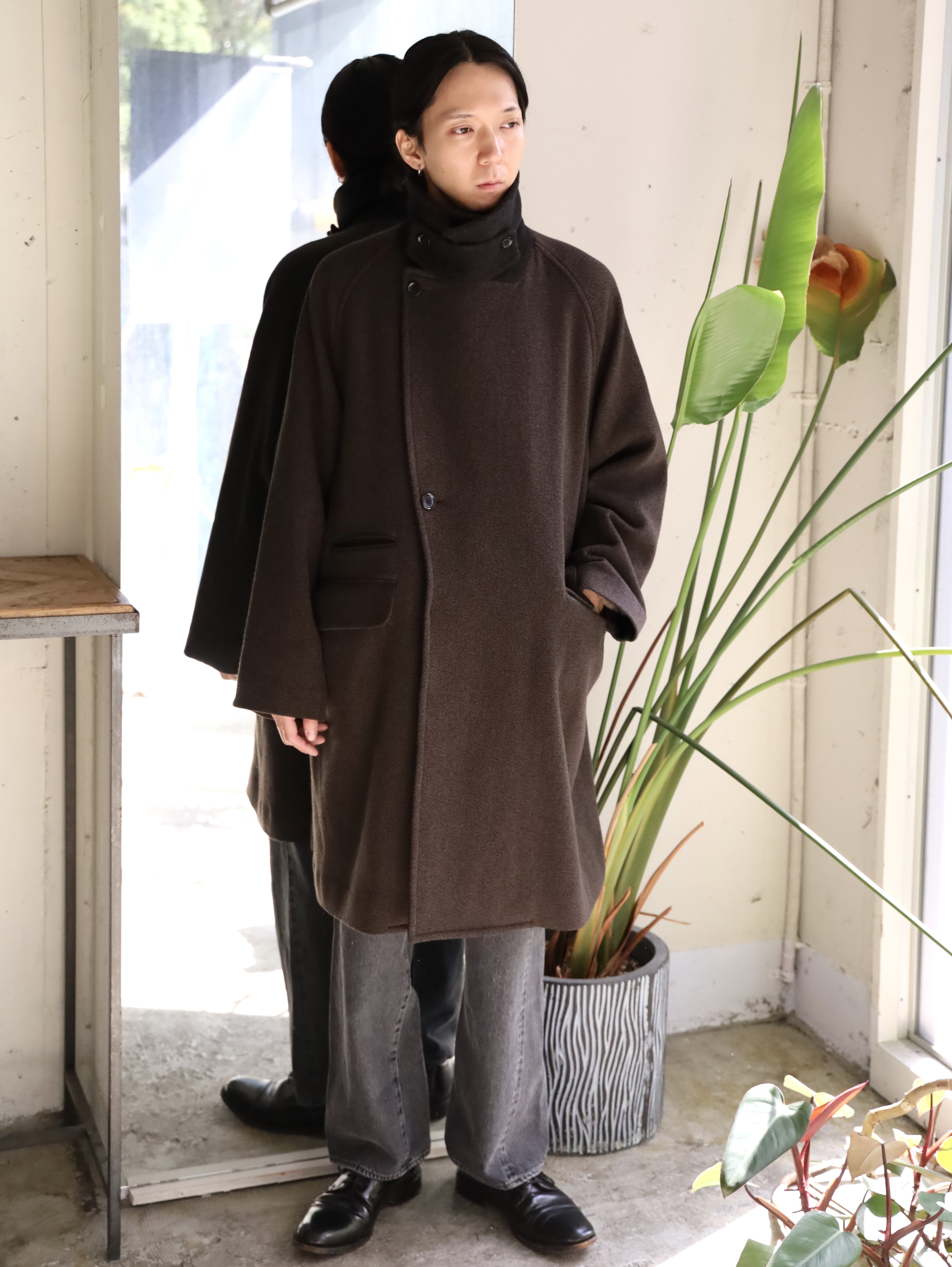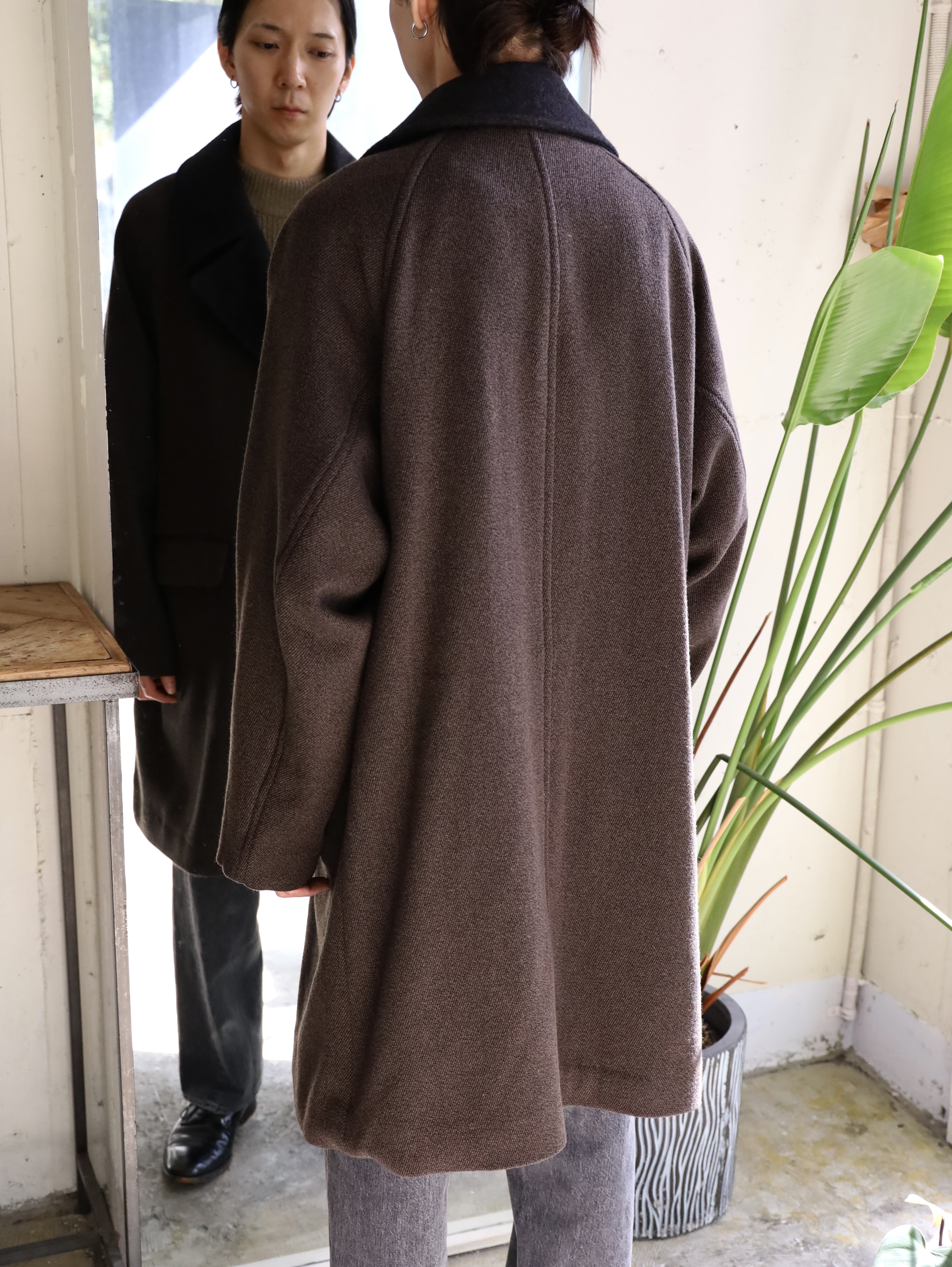 クラシックなオーバーコートをモダンですっきりしたバランスで仕上げたダブルブレステッドコート。襟〜袖周りの収まりと全体のフォルムにこだわり、ブリティッシュなムードでミニマムに仕上げられています。衿とラペルは起毛された裏面を使用し、見た目のアクセントと肌あたりの良さを加えています。重厚な見た目に反した軽さと柔らかさもポイント。厚手のインナーでも着膨れることないゆったりとしたシルエットです。生地には、軽さと膨らみが特徴のミュール紡績されたウール原料とシルクの杢糸で織り上げたウールシルクカルゼを使用。ビンテージファブリックから着想を得ながら、密度や風合い出しの加工に拘って仕上げています。裏起毛をすることで程良い膨らみ感としなやかさを求め、見た目に反した軽さとソフトな風合いが特徴です。