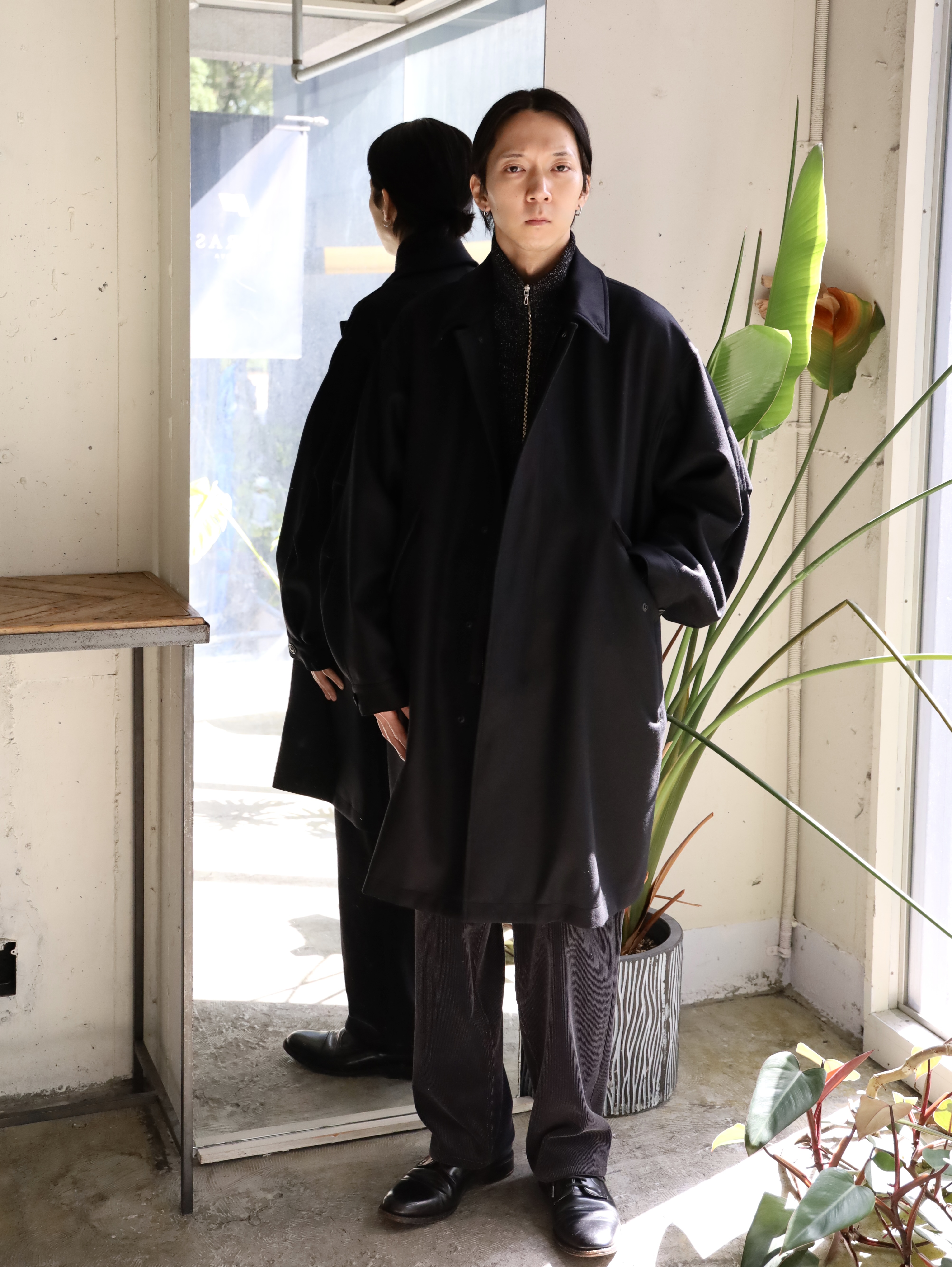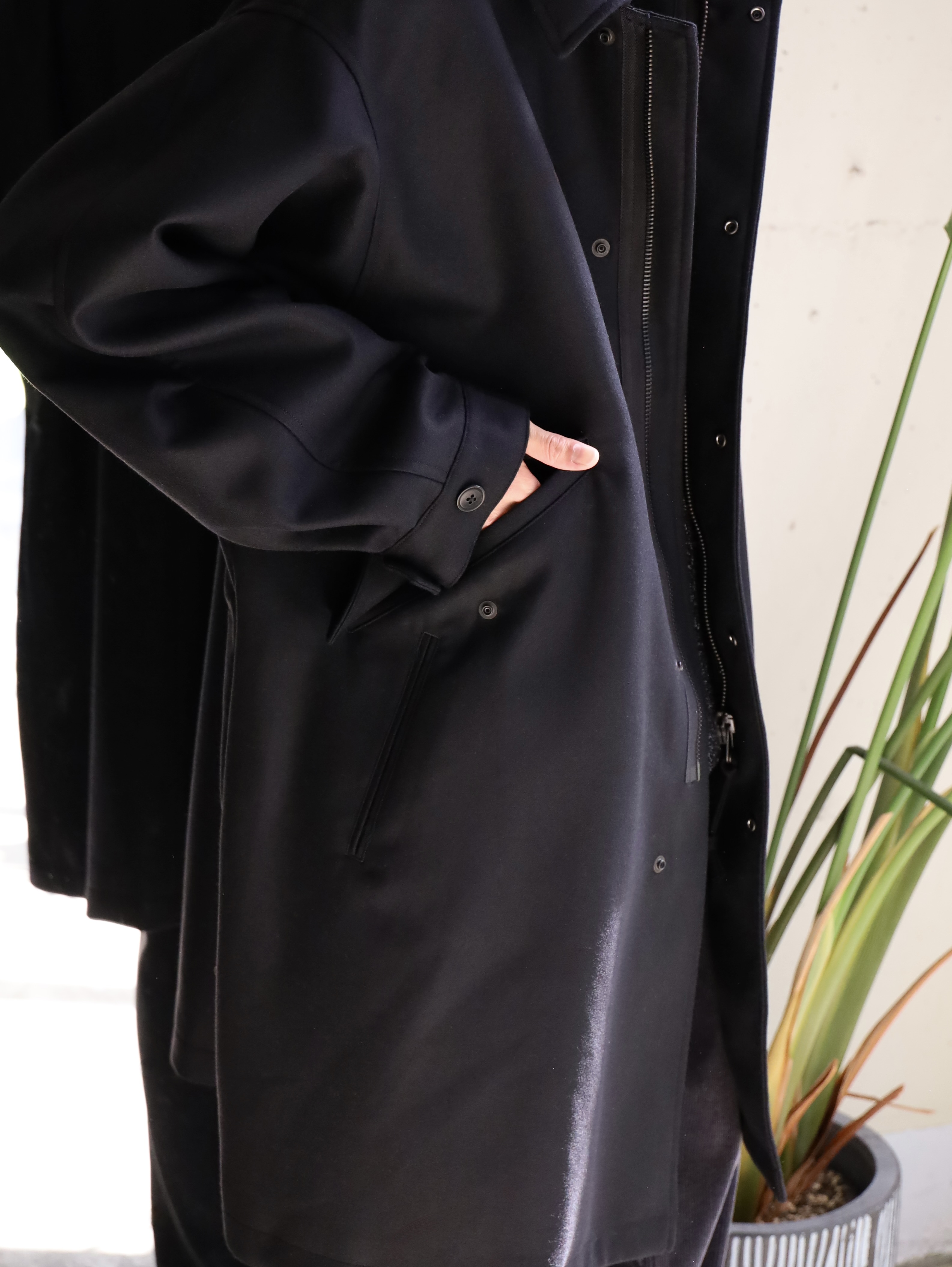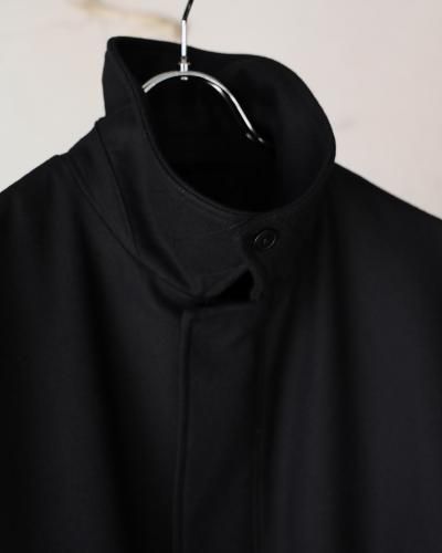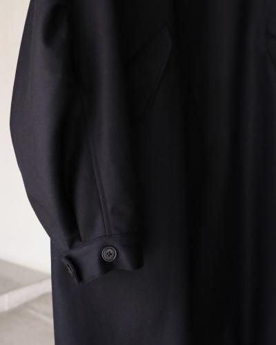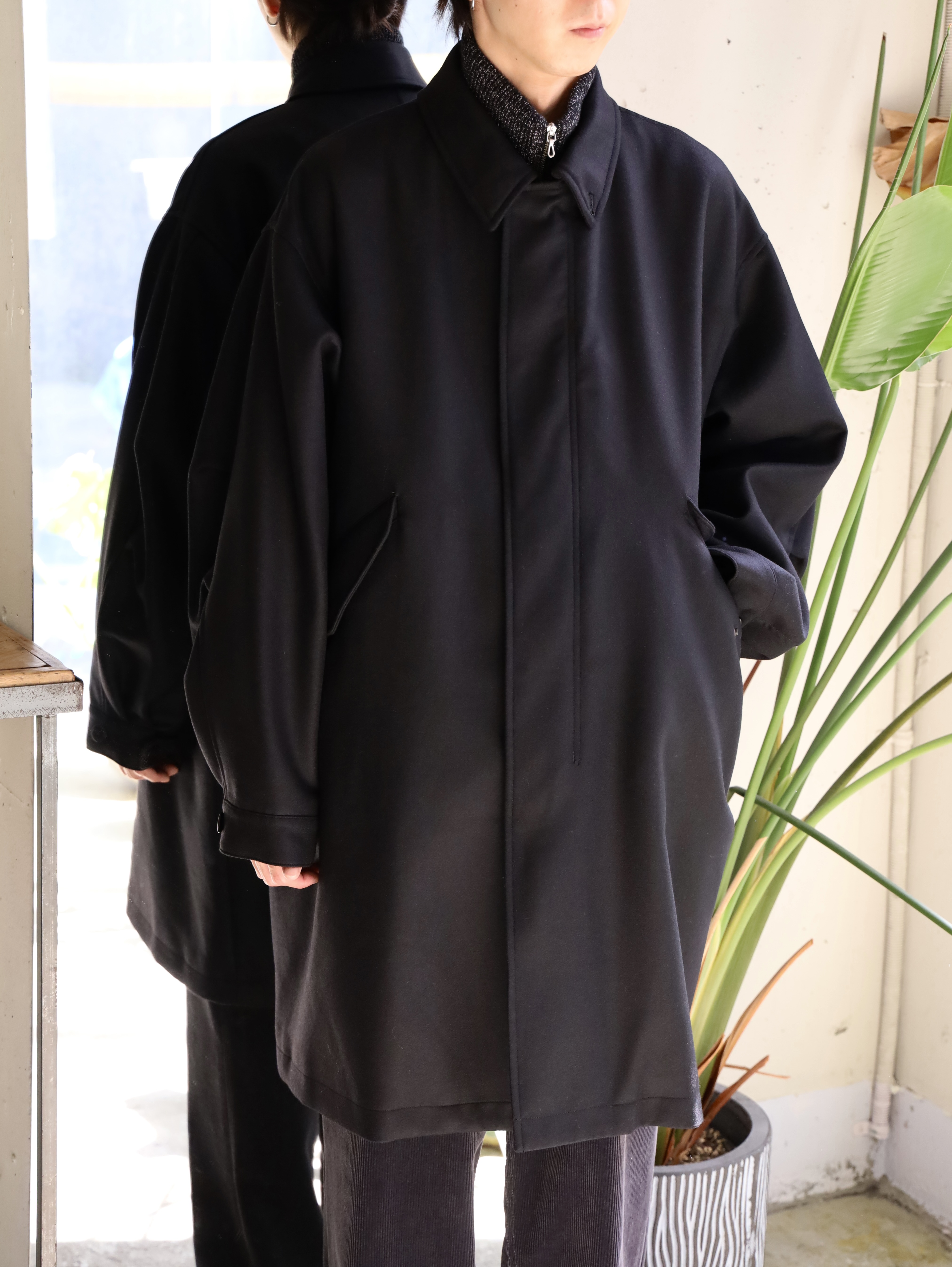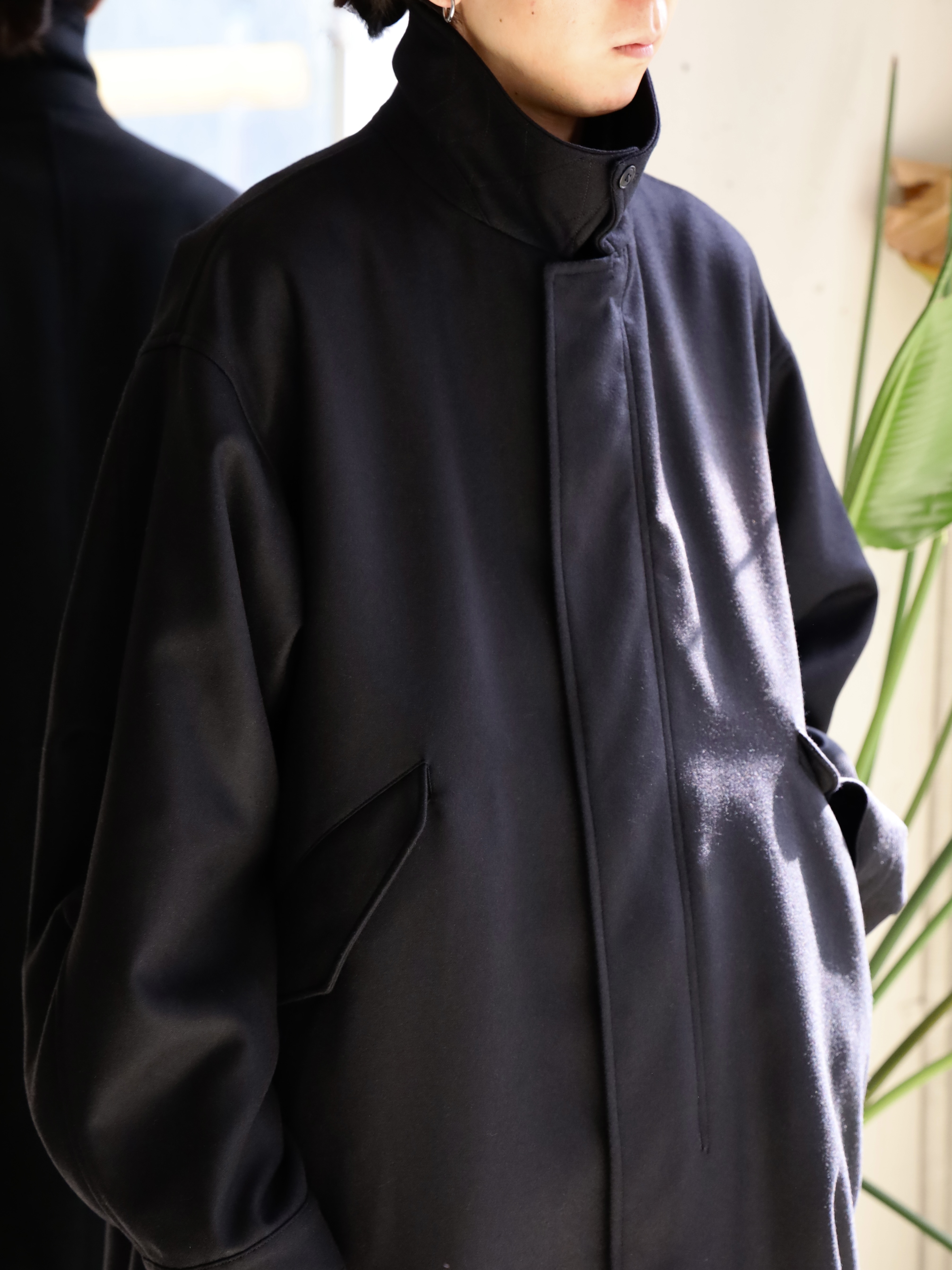 バルカラーコートとミリタリーフィールドコートの要素をバランスを良く落とし込んだコート。フロントに配置したチェンジポケットはミニマルな佇まいの中に程良いアクセントと機能性を兼ね揃えています。フィールドコートのアウトラインによる実際の分量感を感じさせないフォルムもポイント。ゆったりとしたサイジングで厚手のインナーが着込みやすくなっています。生地には、糸番手、グレードともに原料を一から見直し、新たに作成したSuper130's 梳毛原料の二重織ライトメルトンを使用。原料を見直したことで軽さと薄さをさらに引き出し、風合い出しに拘った縮絨加工で、滑らかなタッチと高級感のある質感に仕上げています。年数長く着込むことで生まれる風合いの変化も楽しみな1着。