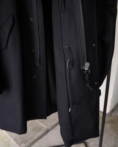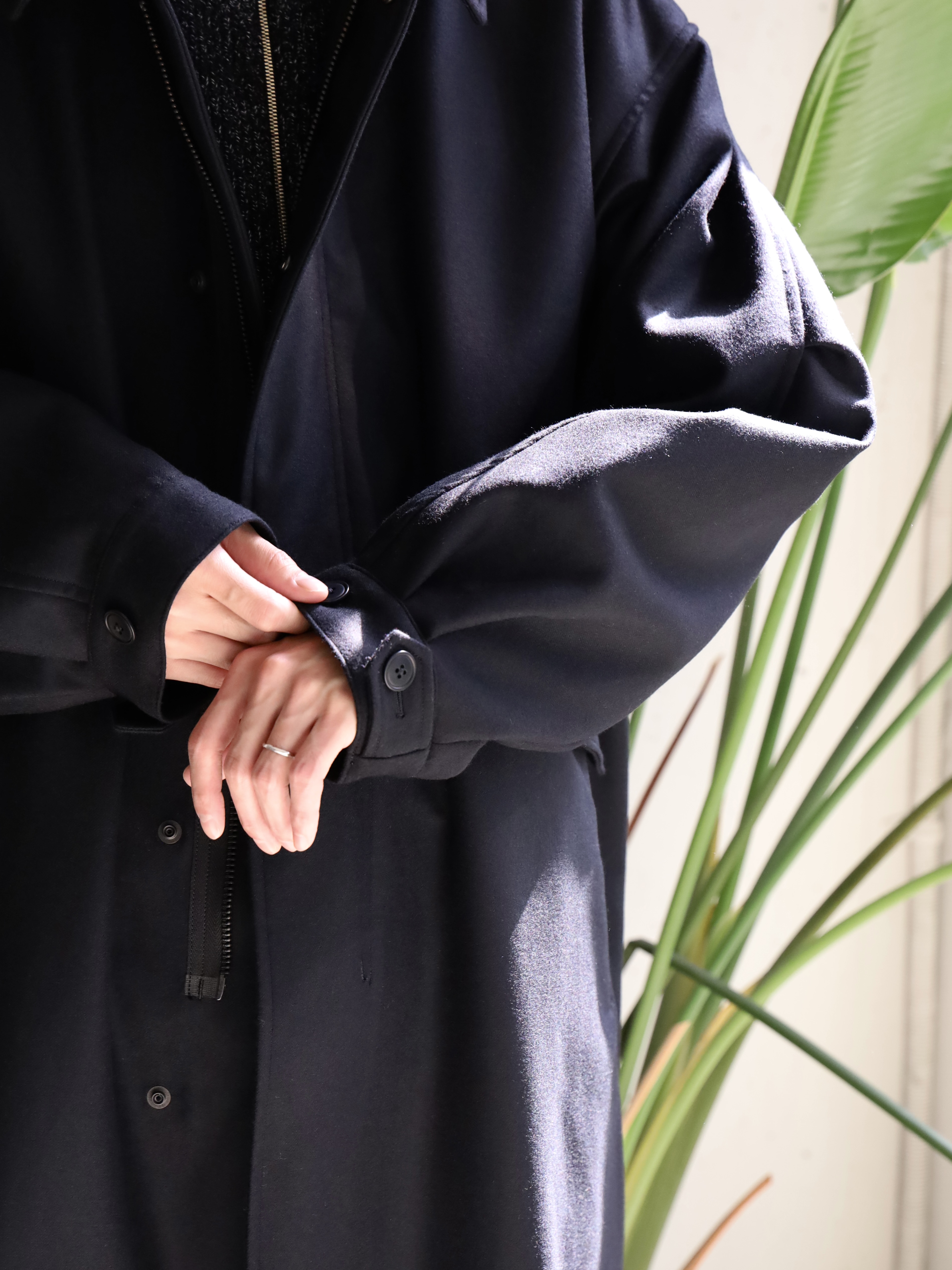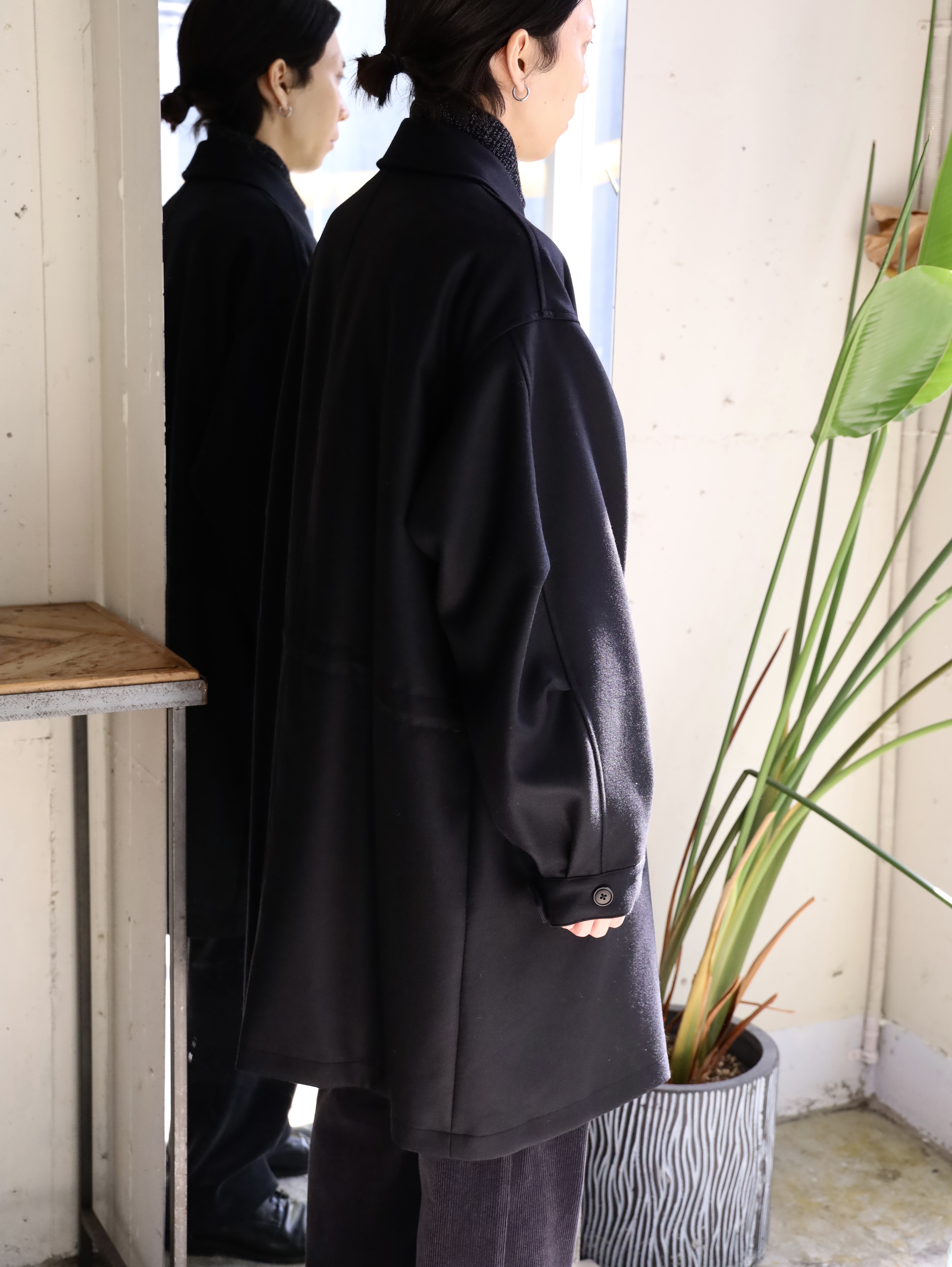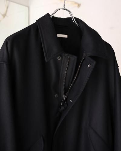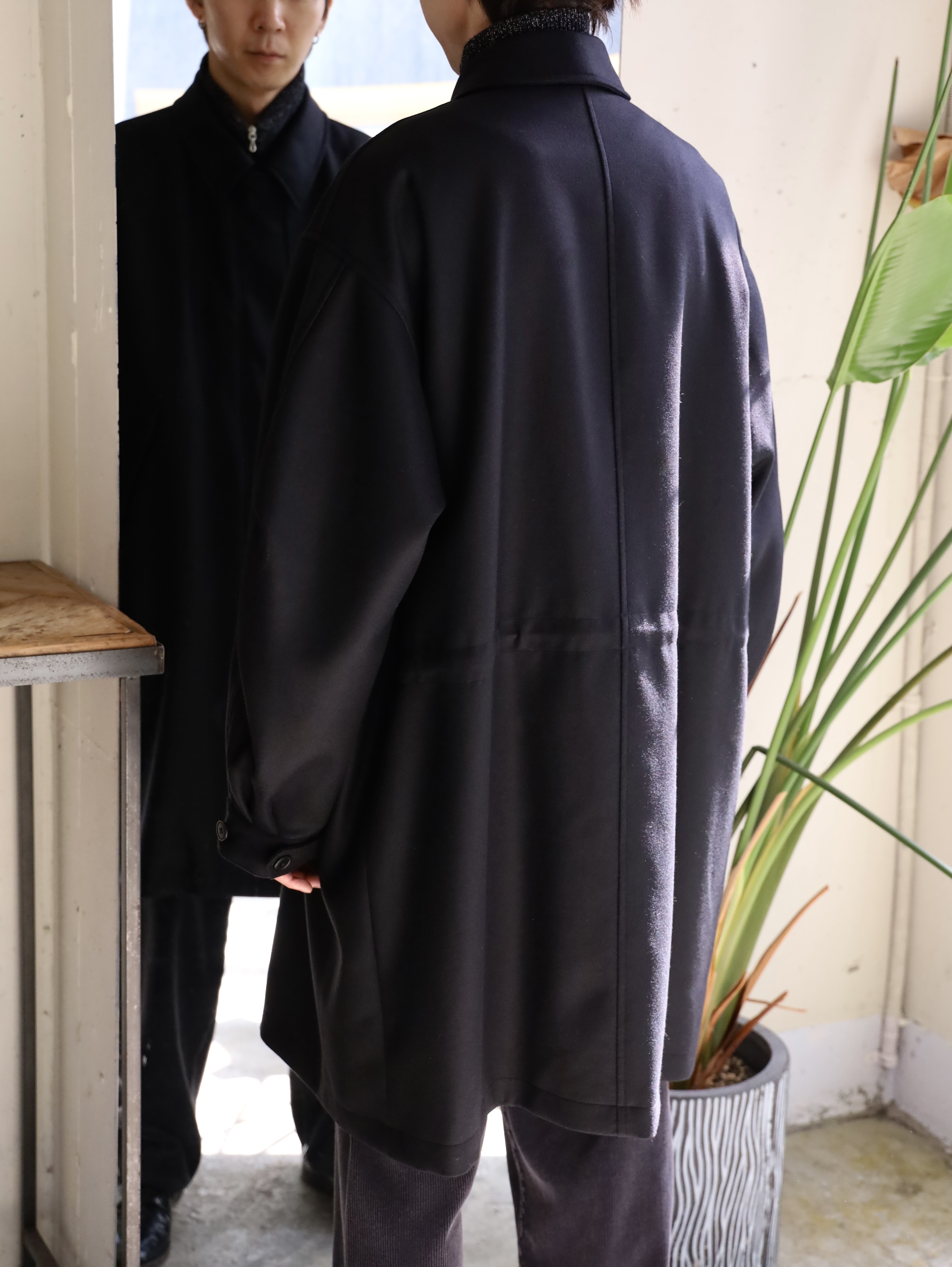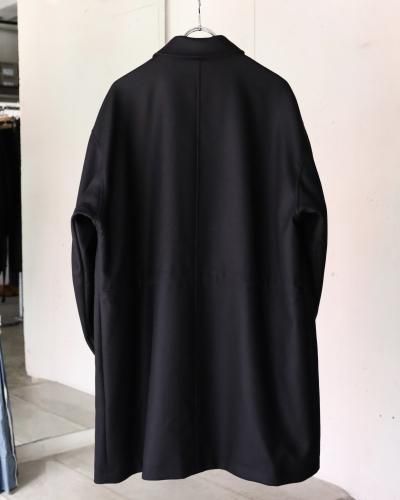 バルカラーコートとミリタリーフィールドコートの要素をバランスを良く落とし込んだコート。フロントに配置したチェンジポケットはミニマルな佇まいの中に程良いアクセントと機能性を兼ね揃えています。フィールドコートのアウトラインによる実際の分量感を感じさせないフォルムもポイント。ゆったりとしたサイジングで厚手のインナーが着込みやすくなっています。生地には、糸番手、グレードともに原料を一から見直し、新たに作成したSuper130's 梳毛原料の二重織ライトメルトンを使用。原料を見直したことで軽さと薄さをさらに引き出し、風合い出しに拘った縮絨加工で、滑らかなタッチと高級感のある質感に仕上げています。年数長く着込むことで生まれる風合いの変化も楽しみな1着。