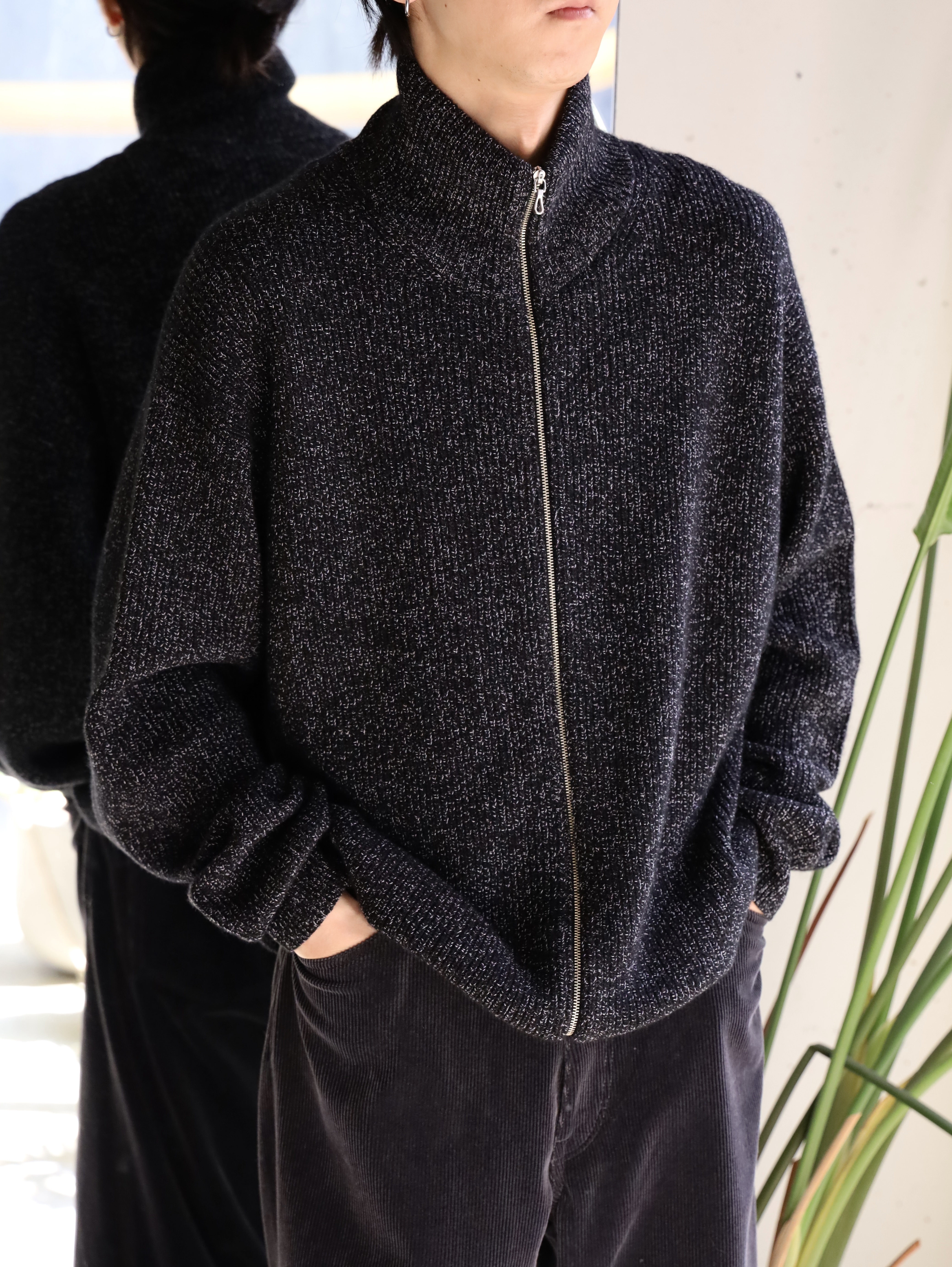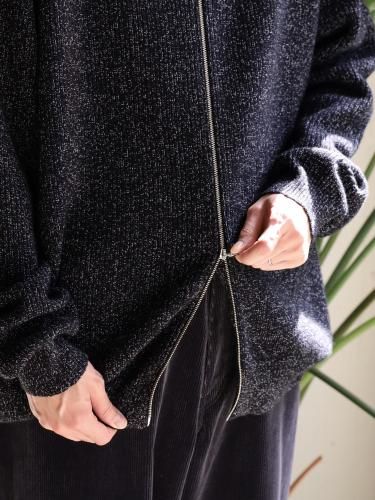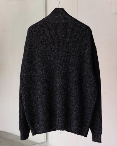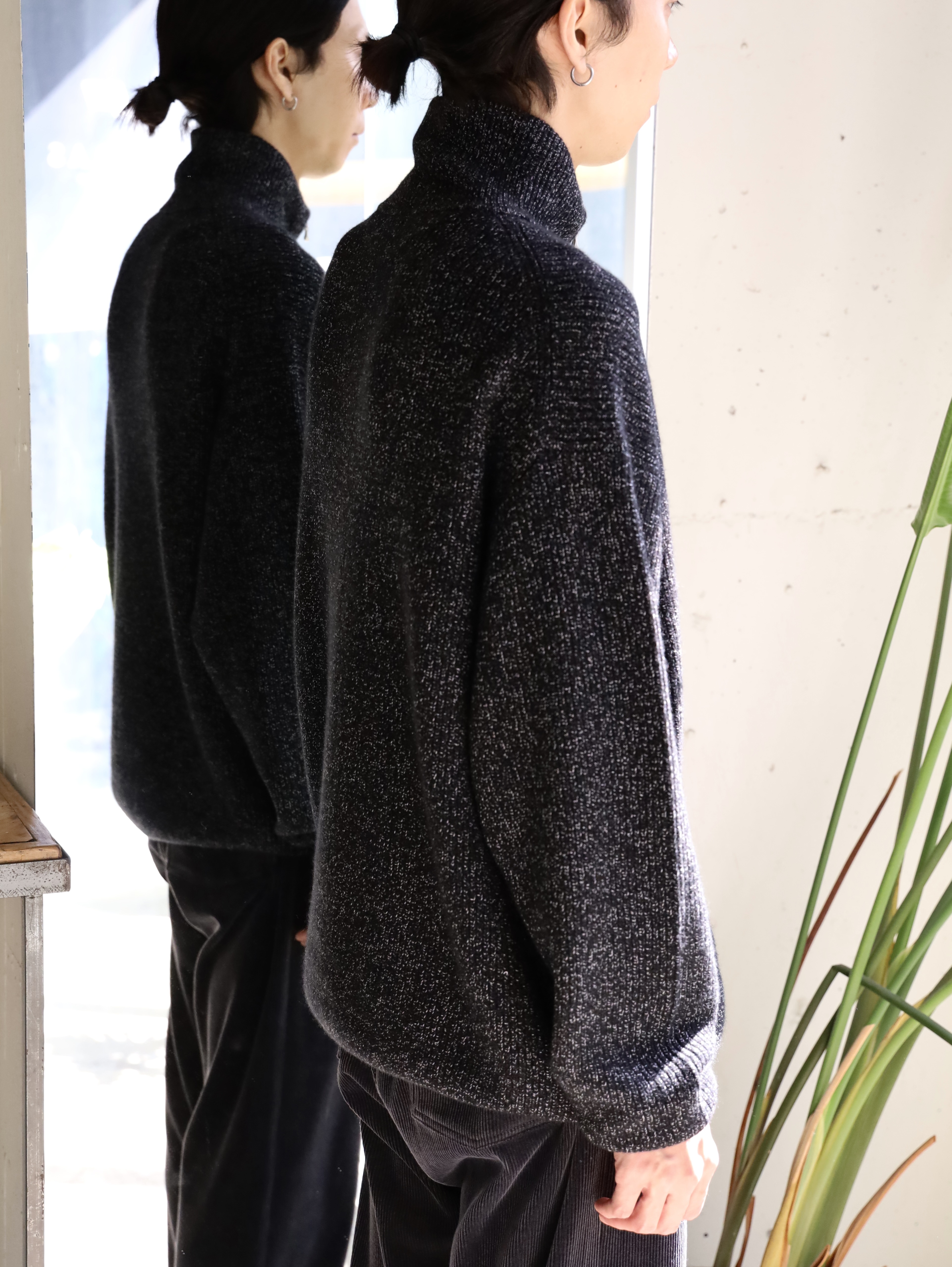 オーストラリア産メリノウール1本と3色のコットンを撚糸した糸で編み上げたドライバーズニット。膨らみのある紡毛糸に対し、本数取りされたコットンをメランジ調に組 み合わせた糸でミドルゲージの片畦で編み立てることで、奥ゆきのある色目と立体感のある表情に仕上げています。出来るだけ⻑い期間着用することを考えた原料選定を前提とし、現代の気候も考慮しながら設計。もちもちとして肌当たりの良い、優しい着心地が魅力。アウター使いはもちろん、適度にゆるいサイジングでインナー使いにも適しています。
