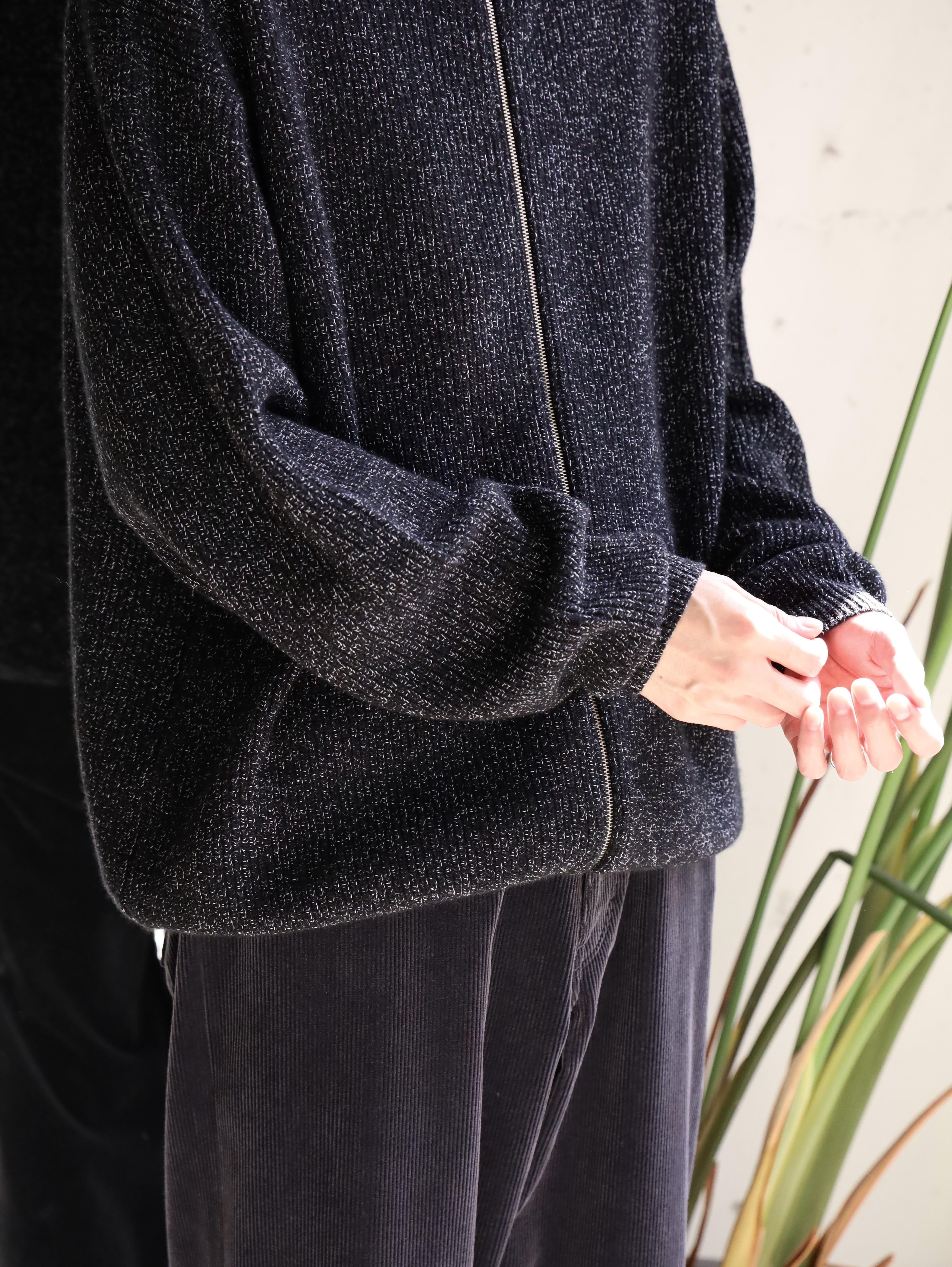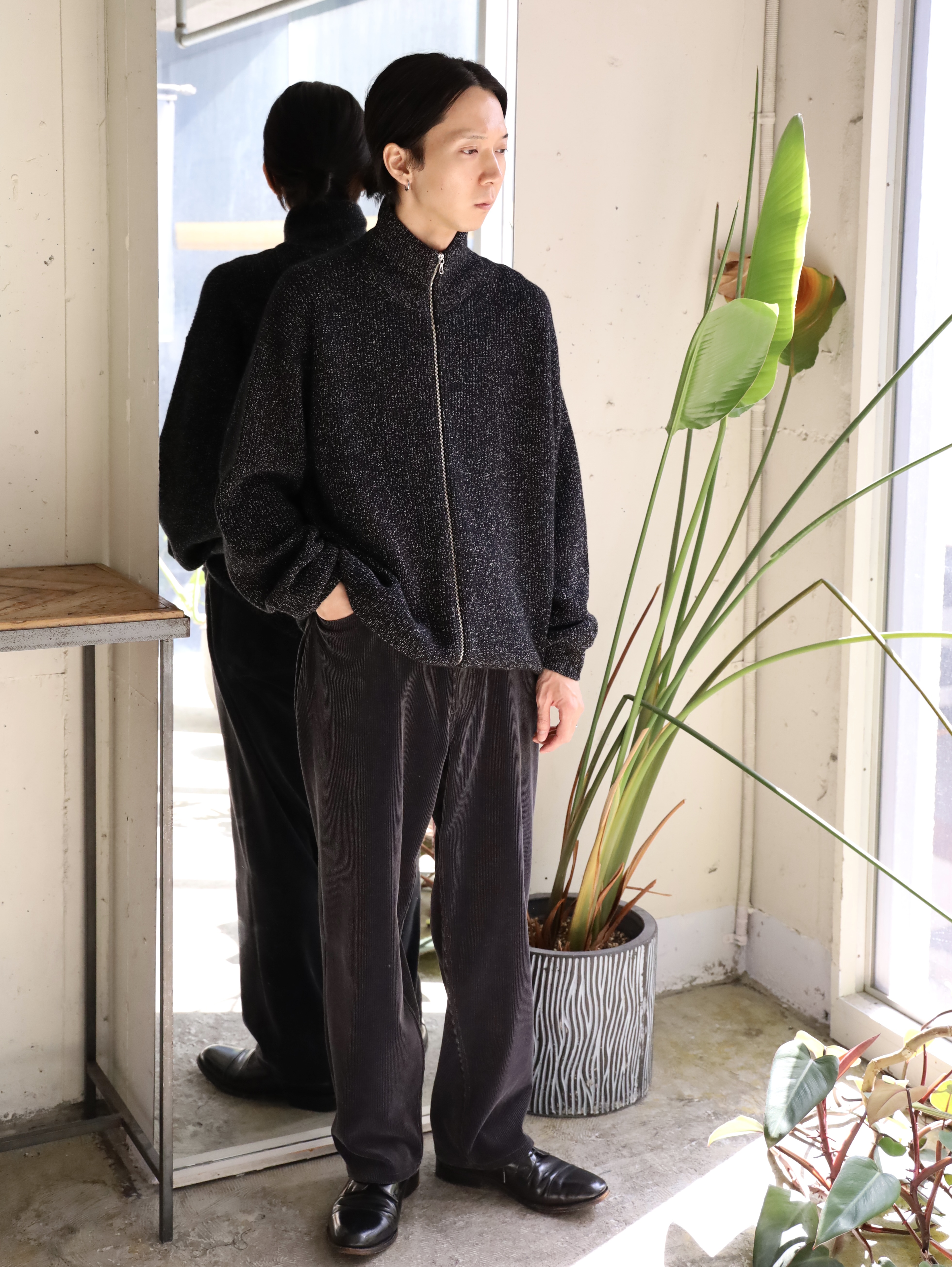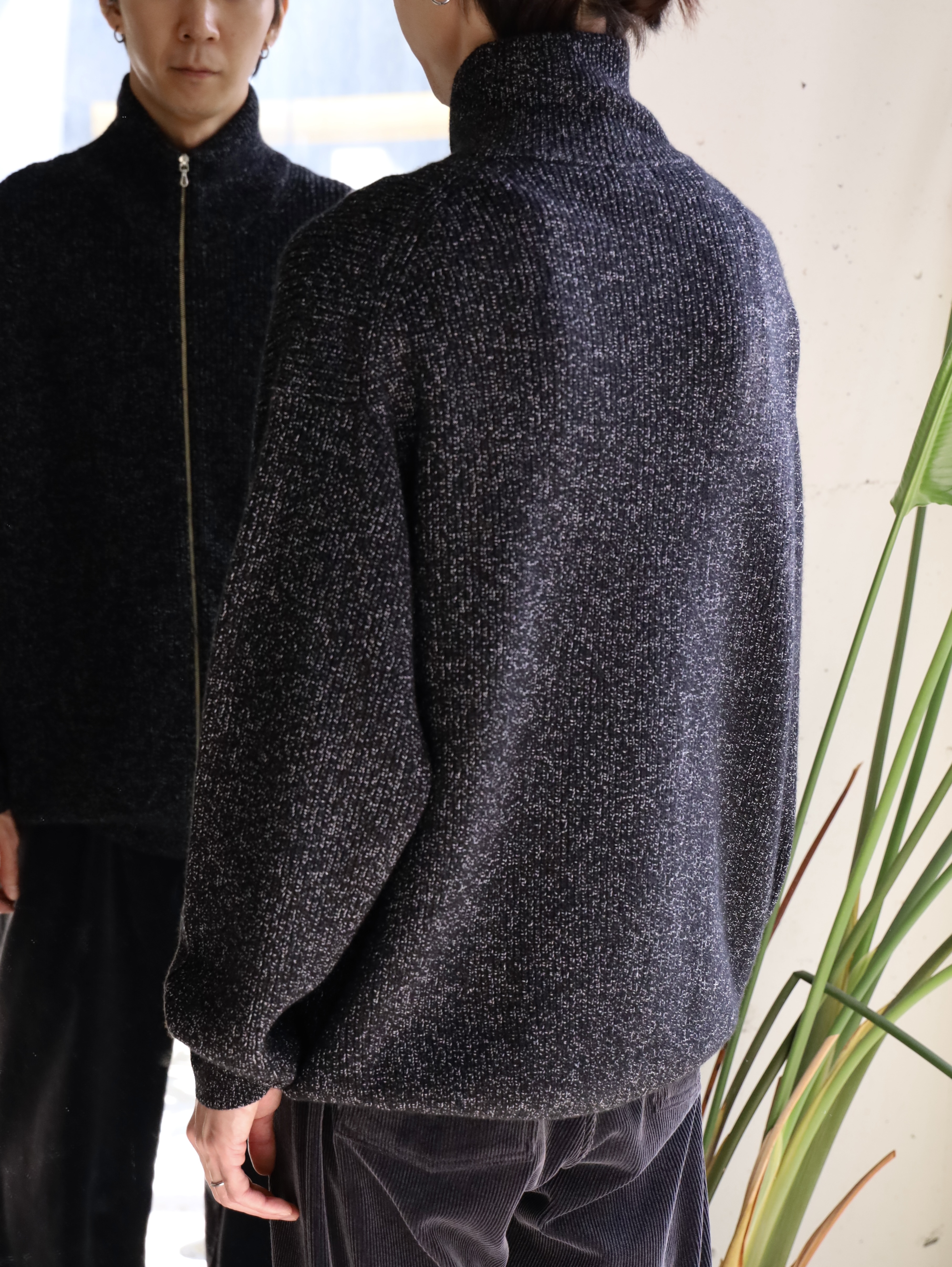 オーストラリア産メリノウール1本と3色のコットンを撚糸した糸で編み上げたドライバーズニット。膨らみのある紡毛糸に対し、本数取りされたコットンをメランジ調に組 み合わせた糸でミドルゲージの片畦で編み立てることで、奥ゆきのある色目と立体感のある表情に仕上げています。出来るだけ⻑い期間着用することを考えた原料選定を前提とし、現代の気候も考慮しながら設計。もちもちとして肌当たりの良い、優しい着心地が魅力。アウター使いはもちろん、適度にゆるいサイジングでインナー使いにも適しています。