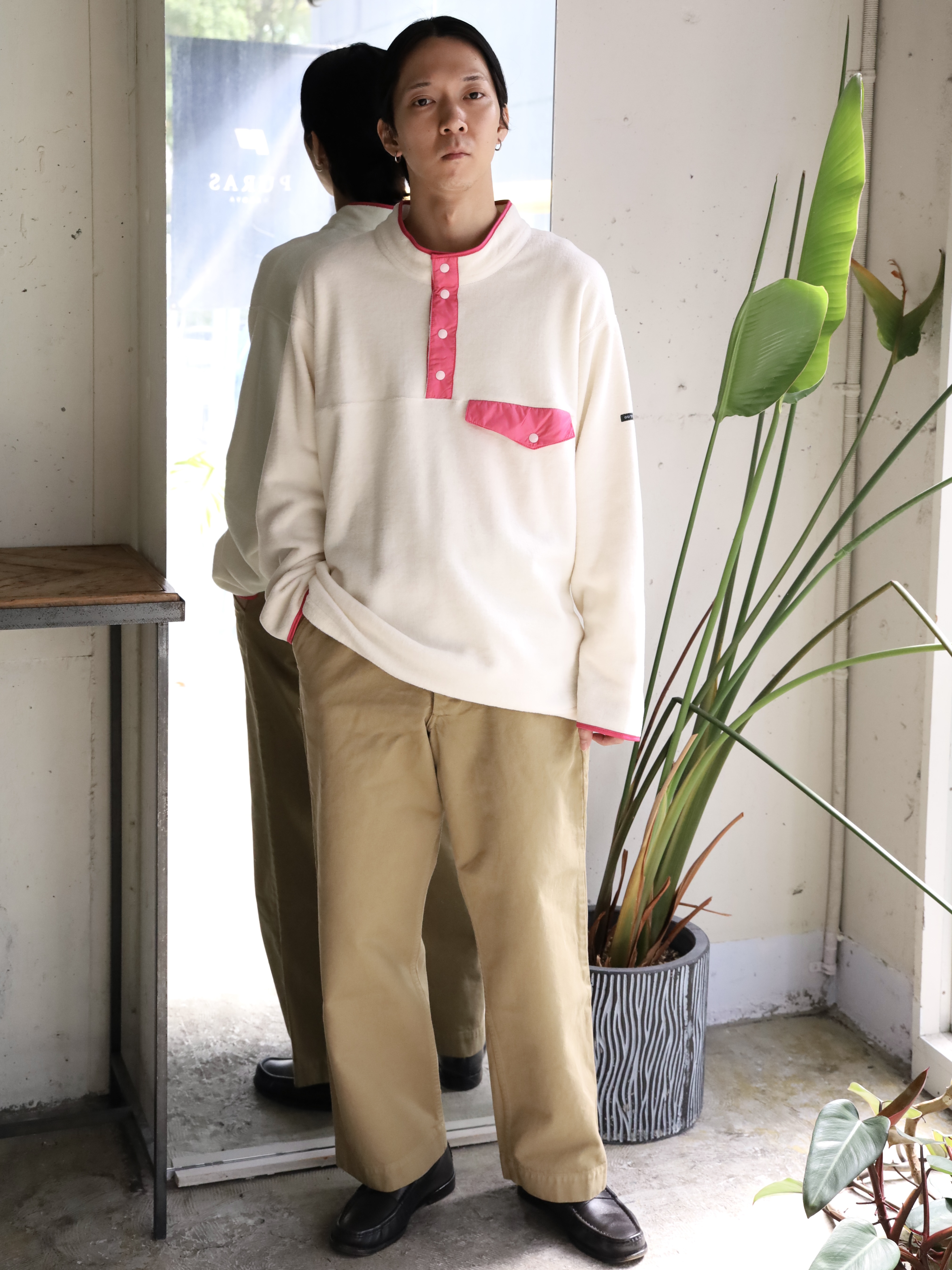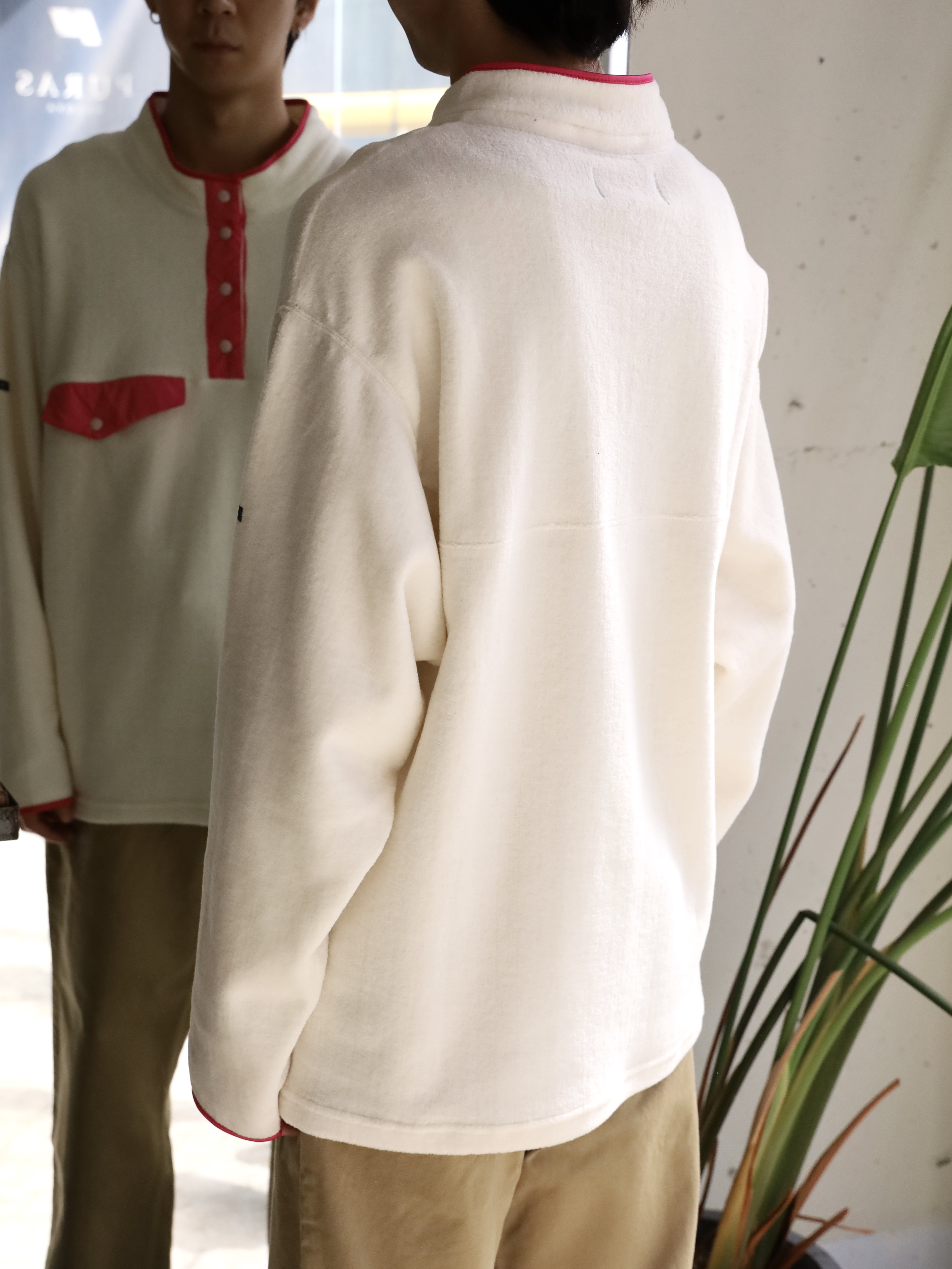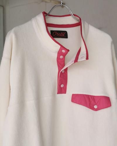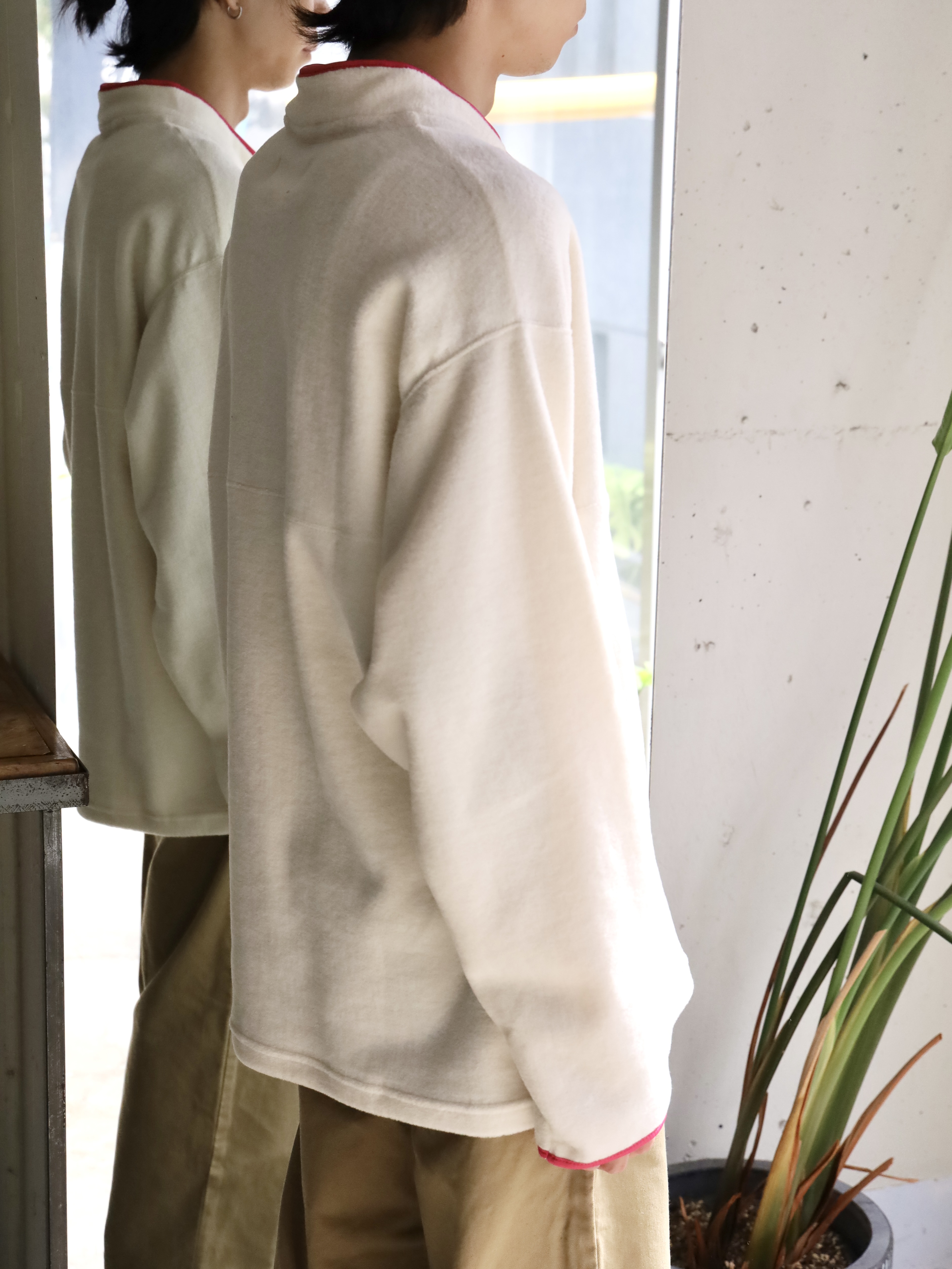 アメリカの有名ブランドのフリースプルオーバーをフランスで作ったら、、というところから始まった1着。生地には、コットンの編み地を引っ掻き製作したコットンフリースを使用。保温性に優れており、肌に乗ったときのふんわりとした感触が心地良く、言わずもがなですが着心地も極上です。着用を重ねることによる経年変化もお楽しみいただけます。