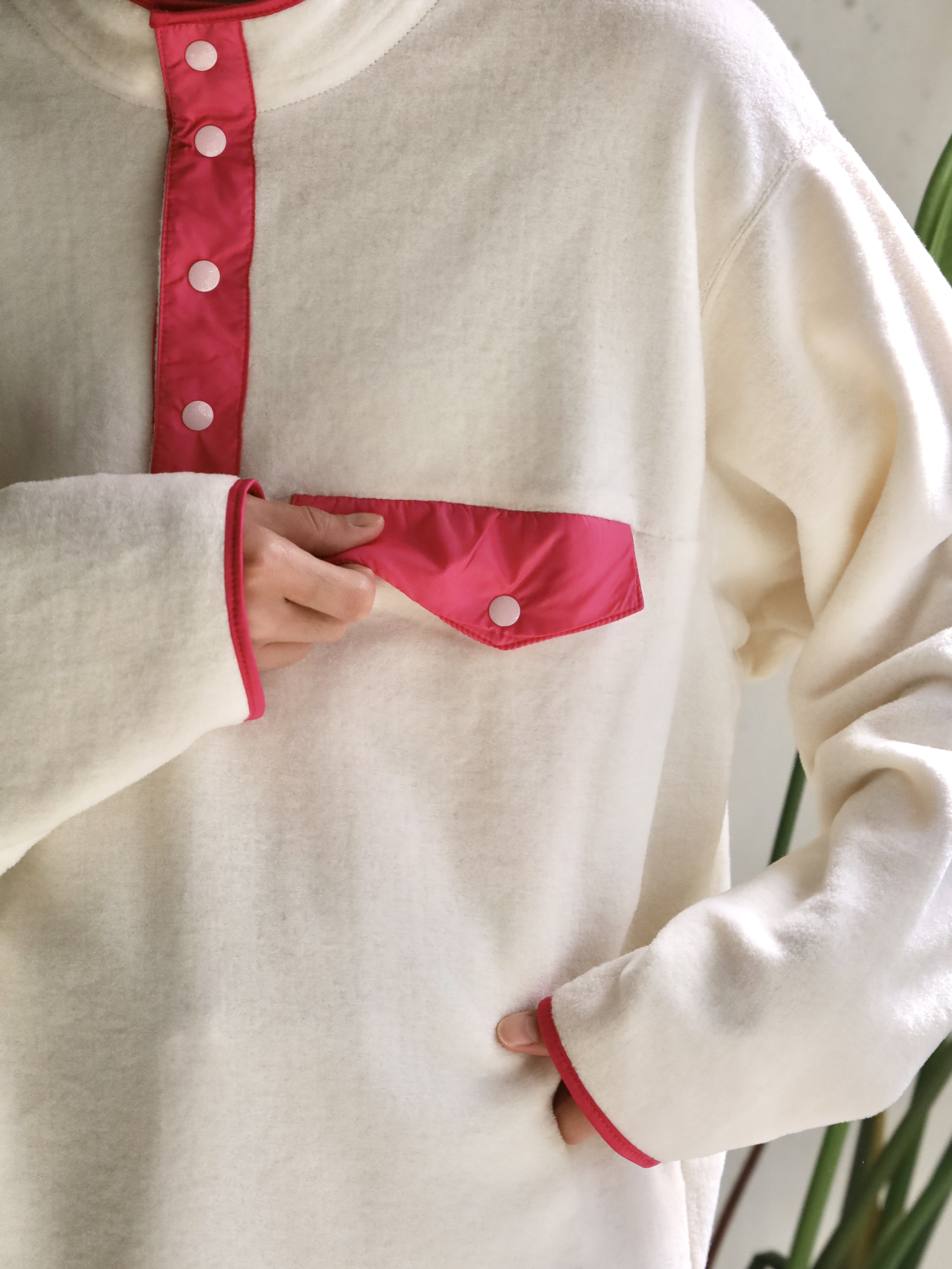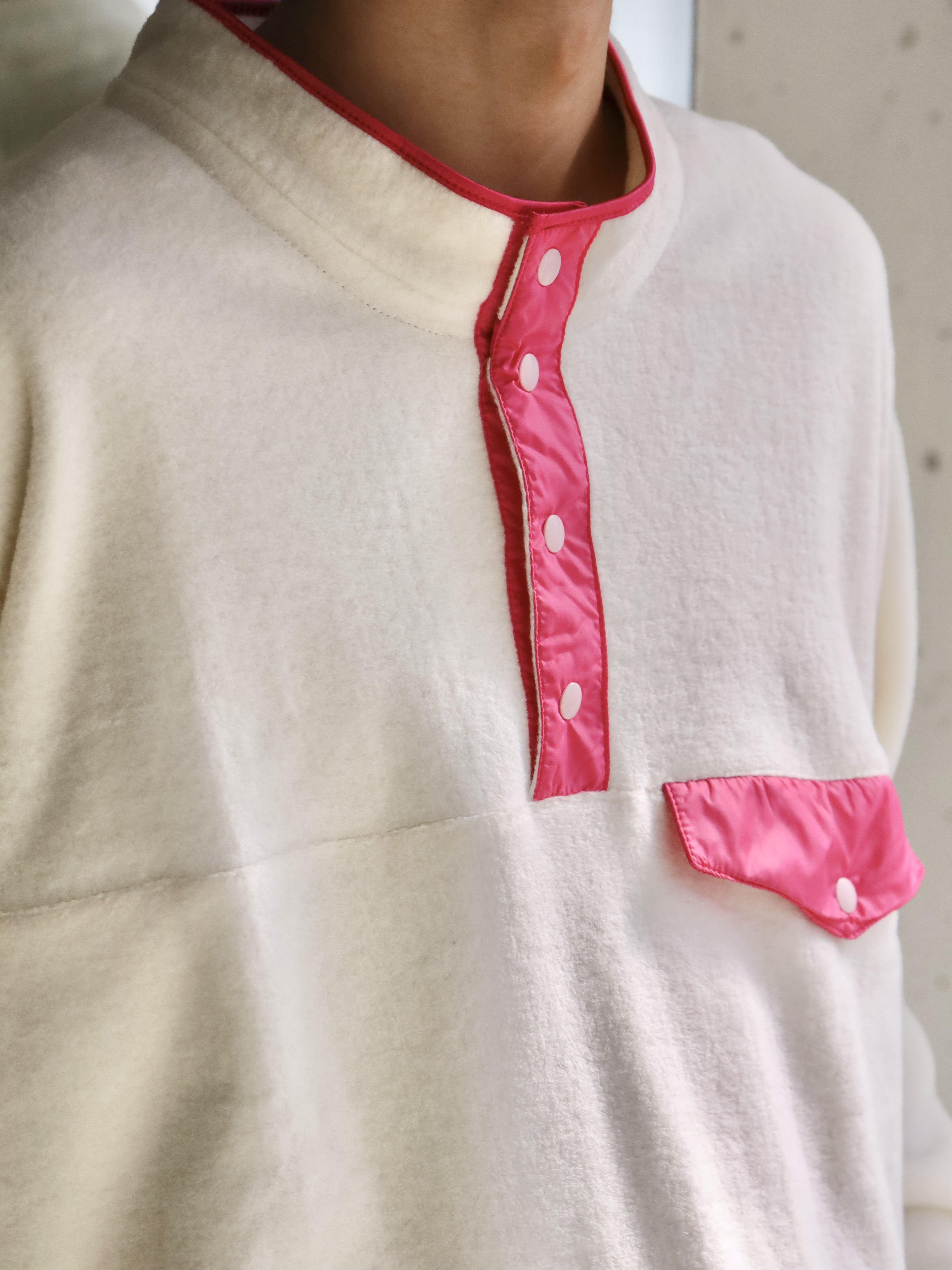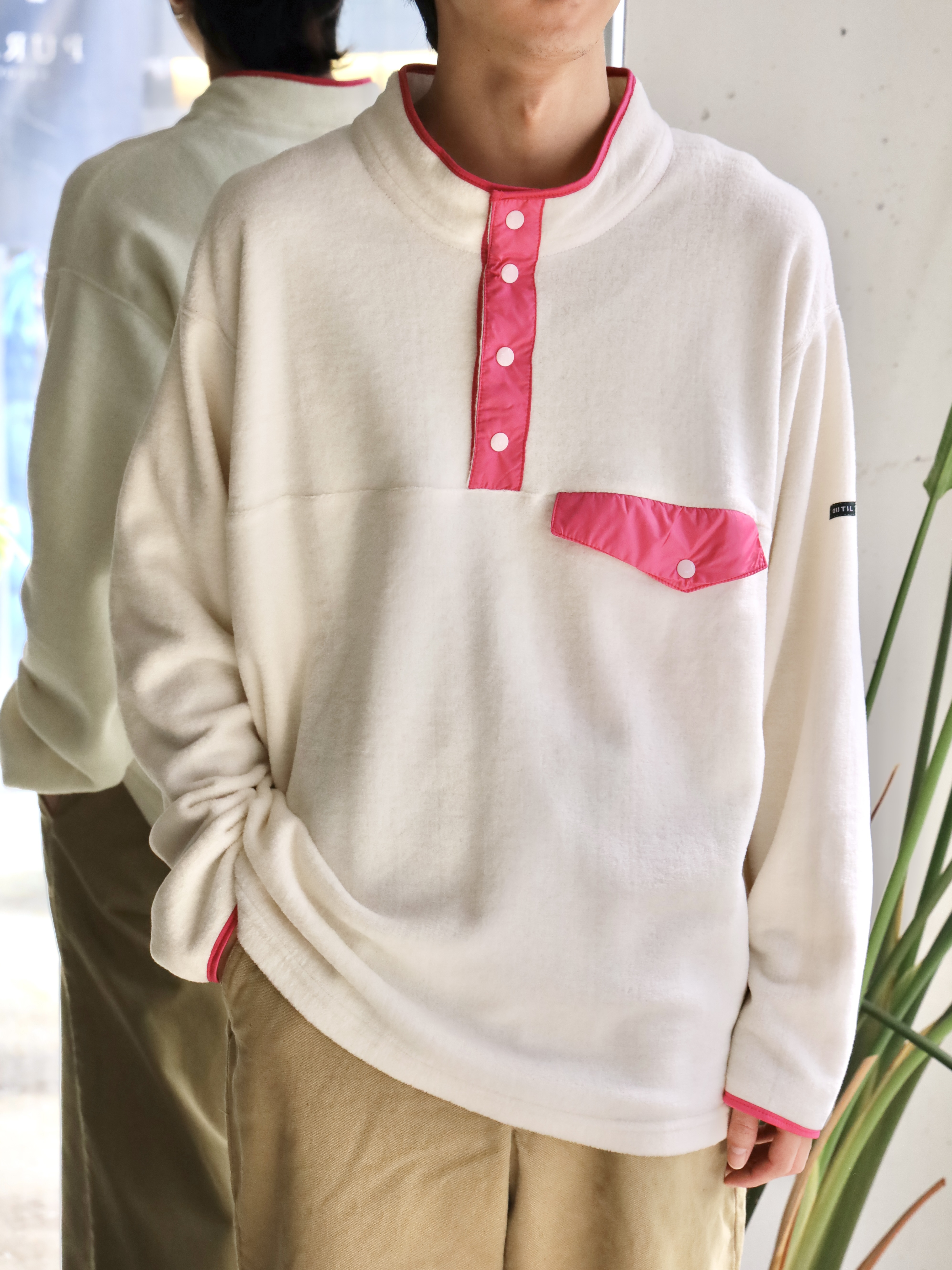 アメリカの有名ブランドのフリースプルオーバーをフランスで作ったら、、というところから始まった1着。生地には、コットンの編み地を引っ掻き製作したコットンフリースを使用。保温性に優れており、肌に乗ったときのふんわりとした感触が心地良く、言わずもがなですが着心地も極上です。着用を重ねることによる経年変化もお楽しみいただけます。