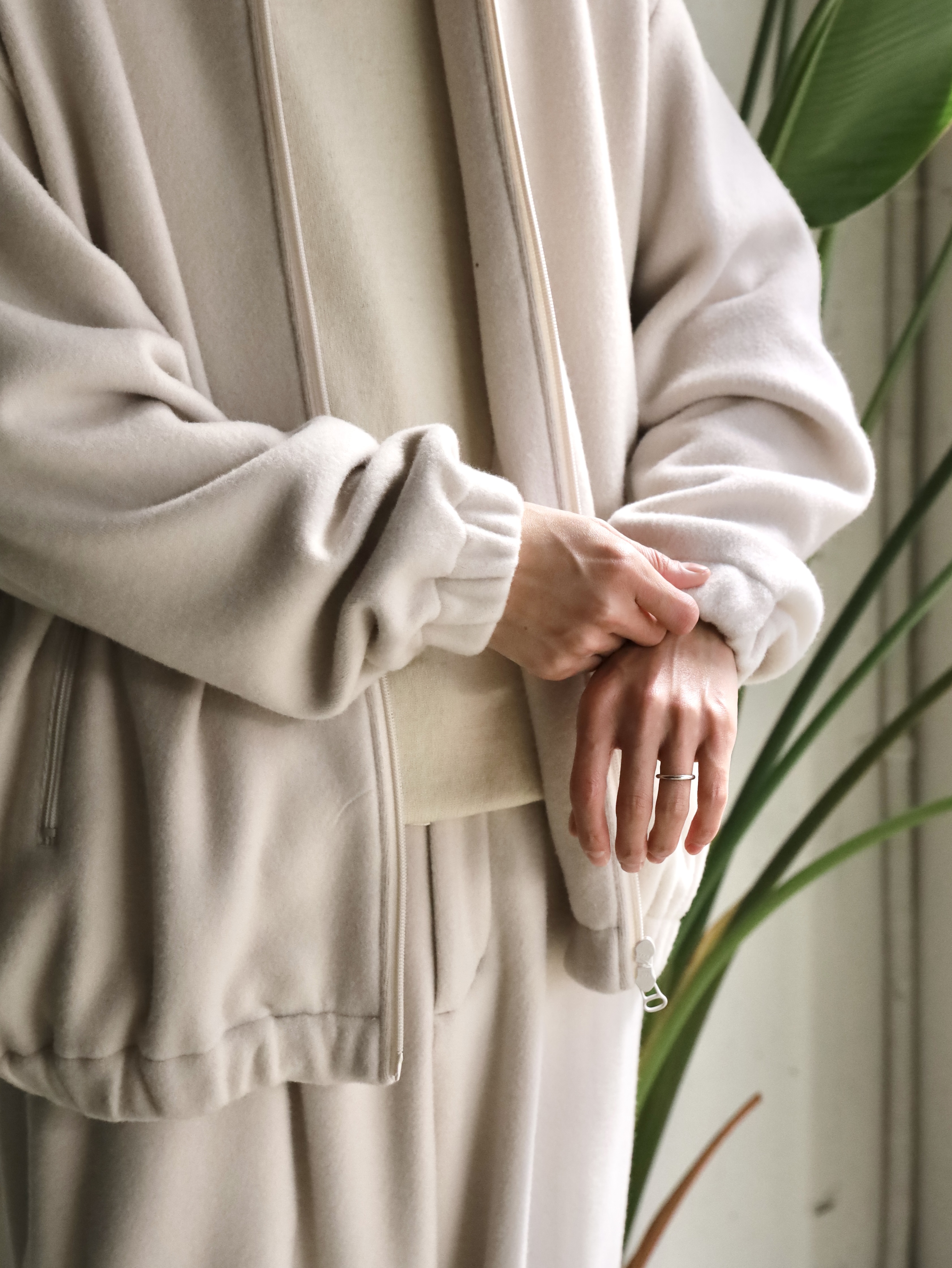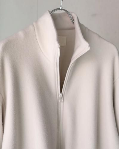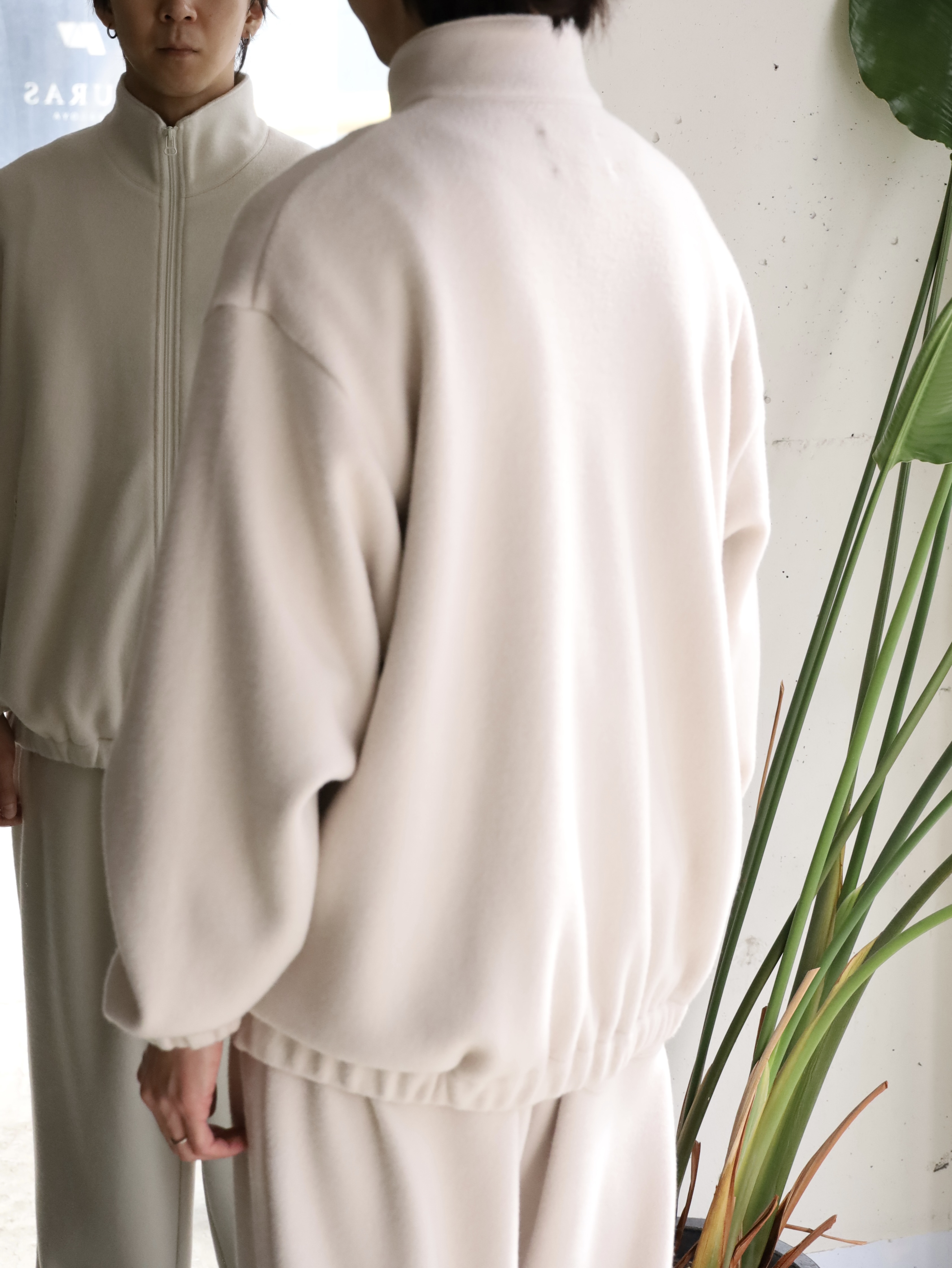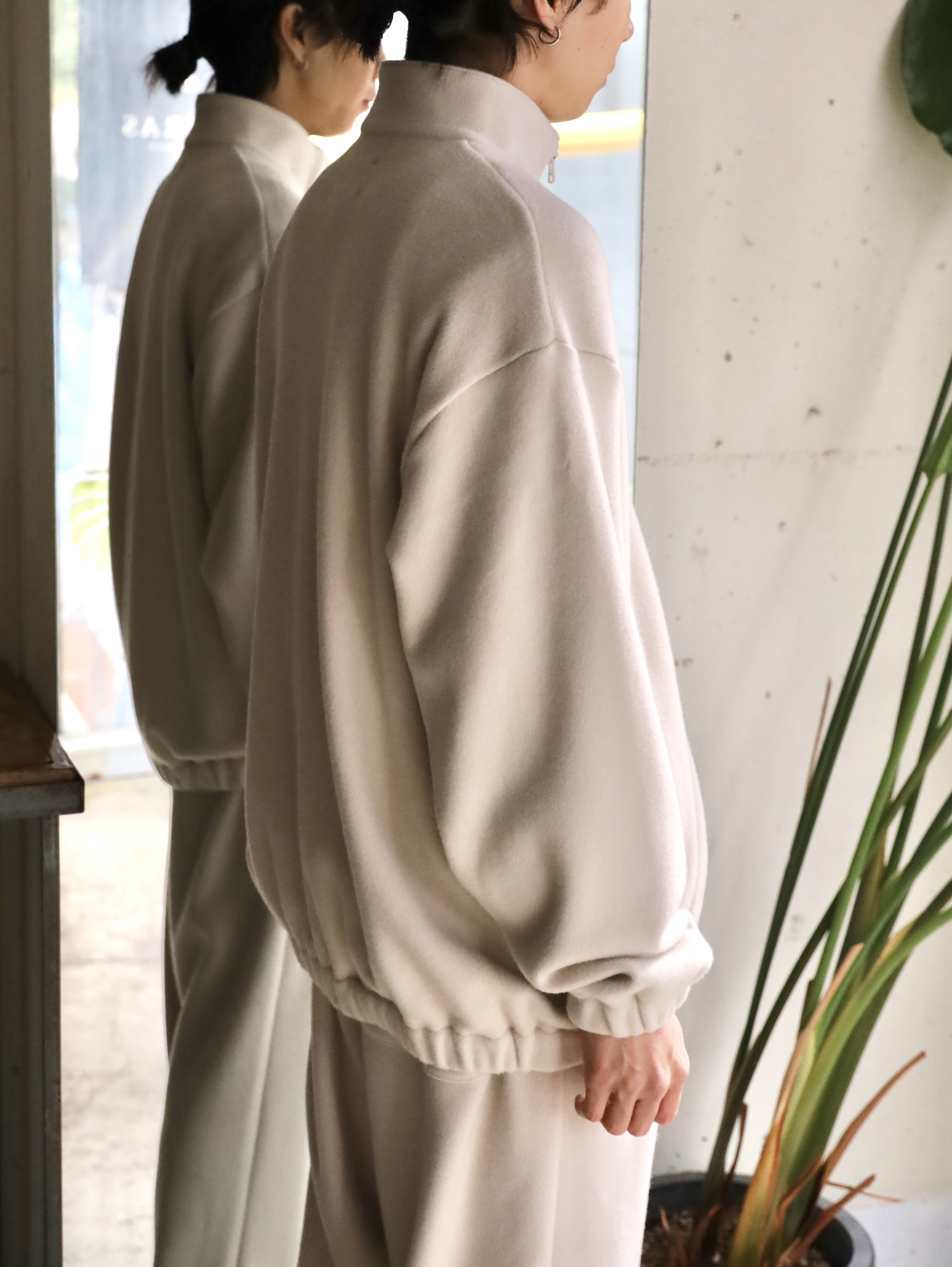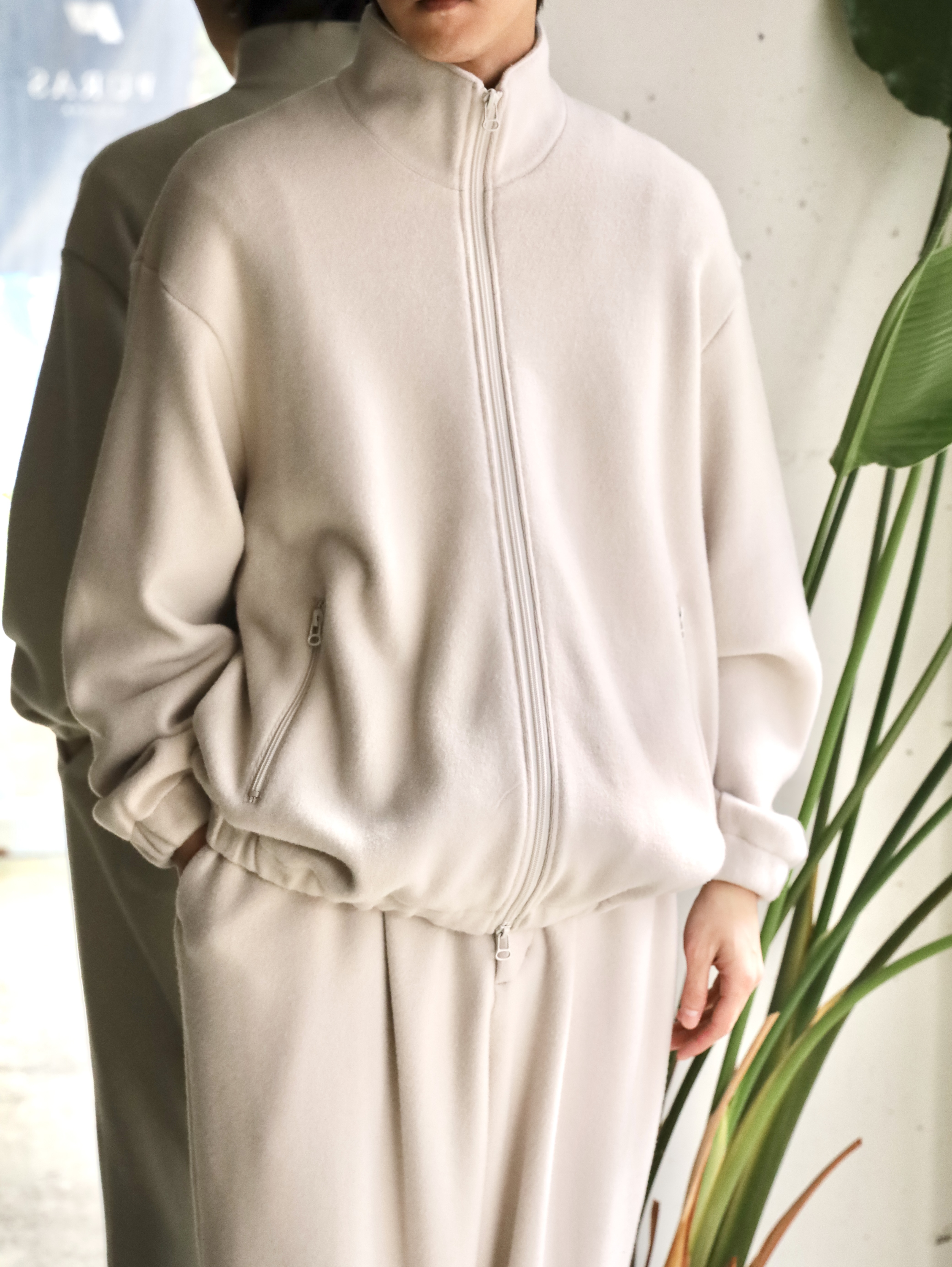クラシカルなスポーツウェアをベースに製作された、ミニマルなデザインのZIPトラックジャケット。袖口と裾にゴムが入ったスポーティーなデザインありながらも、品のあるパターンメイキングにこだわっています。程よくドロップしたショルダーラインやゆったりとした身幅、程よく力の抜けたルーズなサイジングが魅力です。フロントダブルジップにポケット付きでライトアウター感覚でご着用いただけます。生地には、和歌山のニッターが編み上げた、オリジナルのウールフリースを使用。ウールで編み立てたニットに、両面起毛と度重なる洗い加工を施し、ウール100%でありながらフリースの毛羽立ちや膨らみを再現しています。着用を重ねる度、毛羽立ちと膨らみが増し、より味のある独特な経年変化が楽しめます。