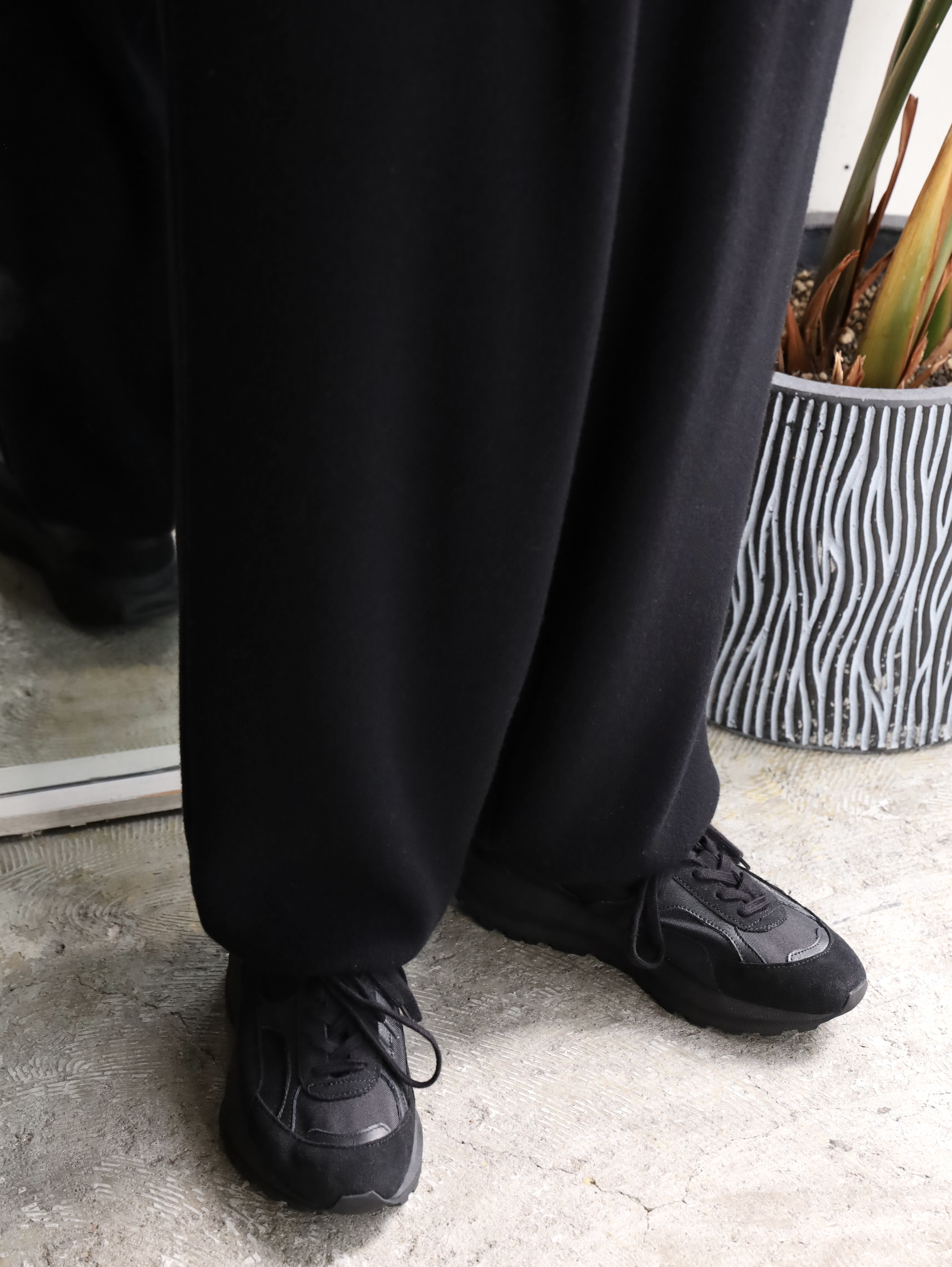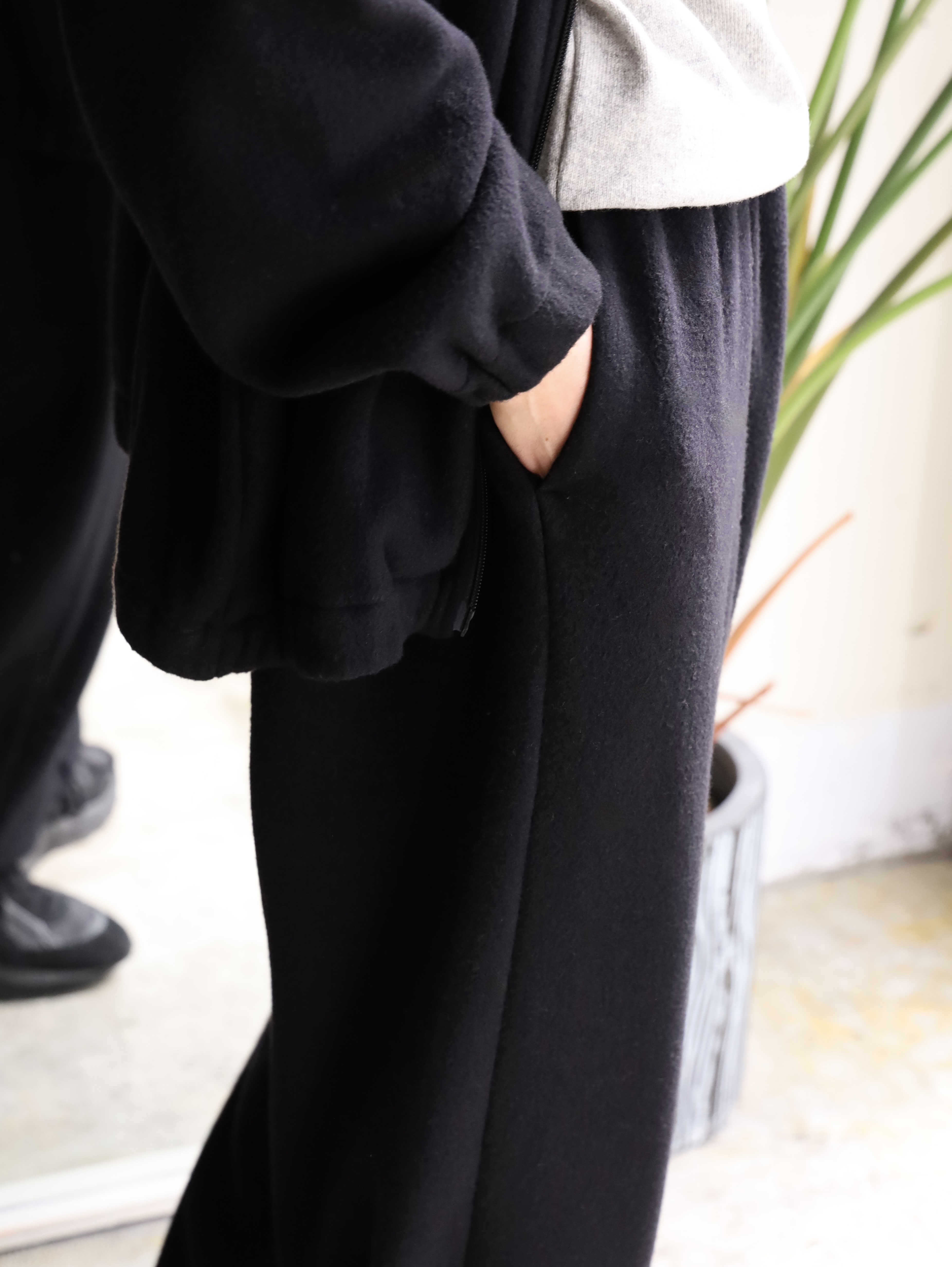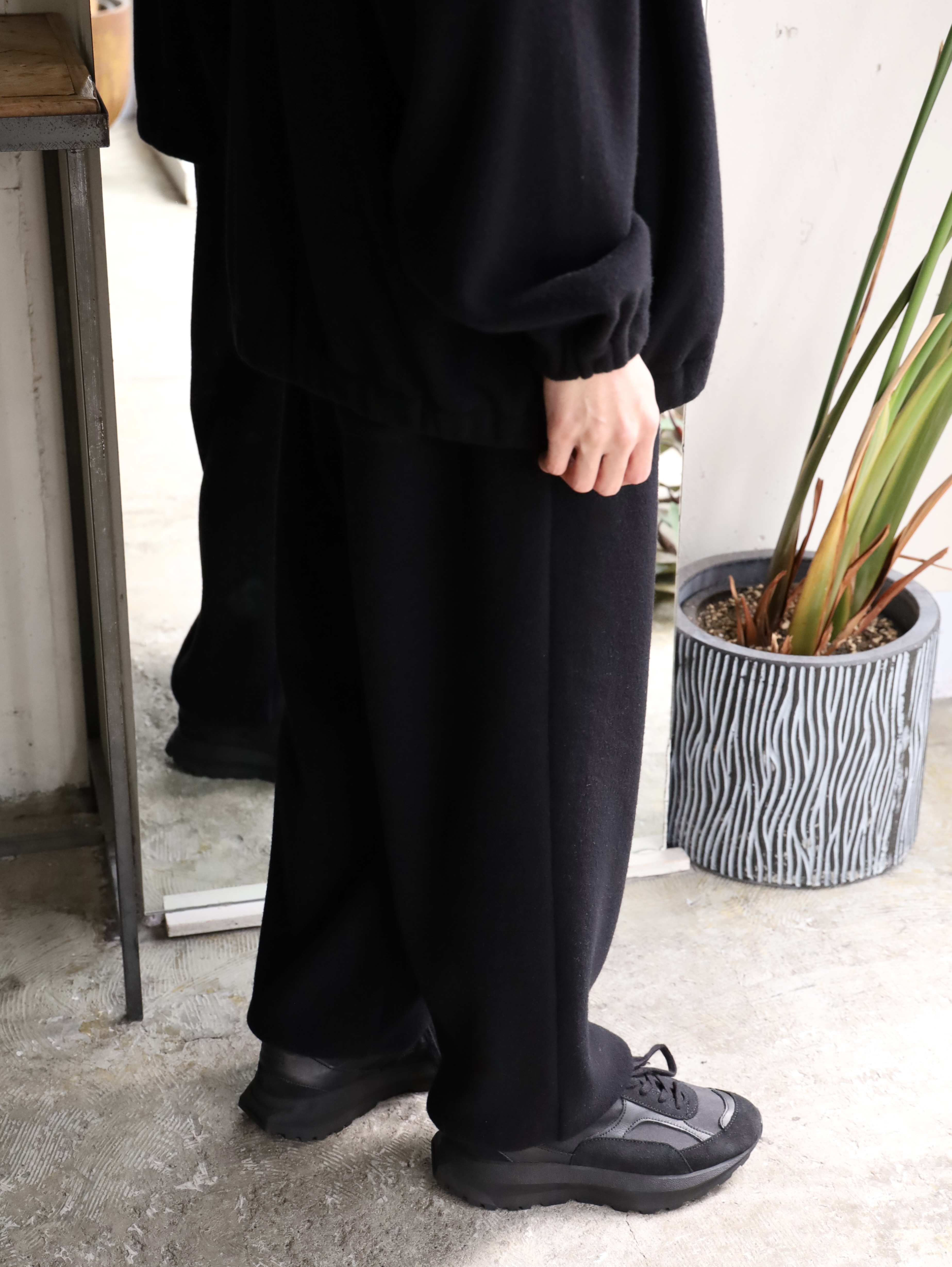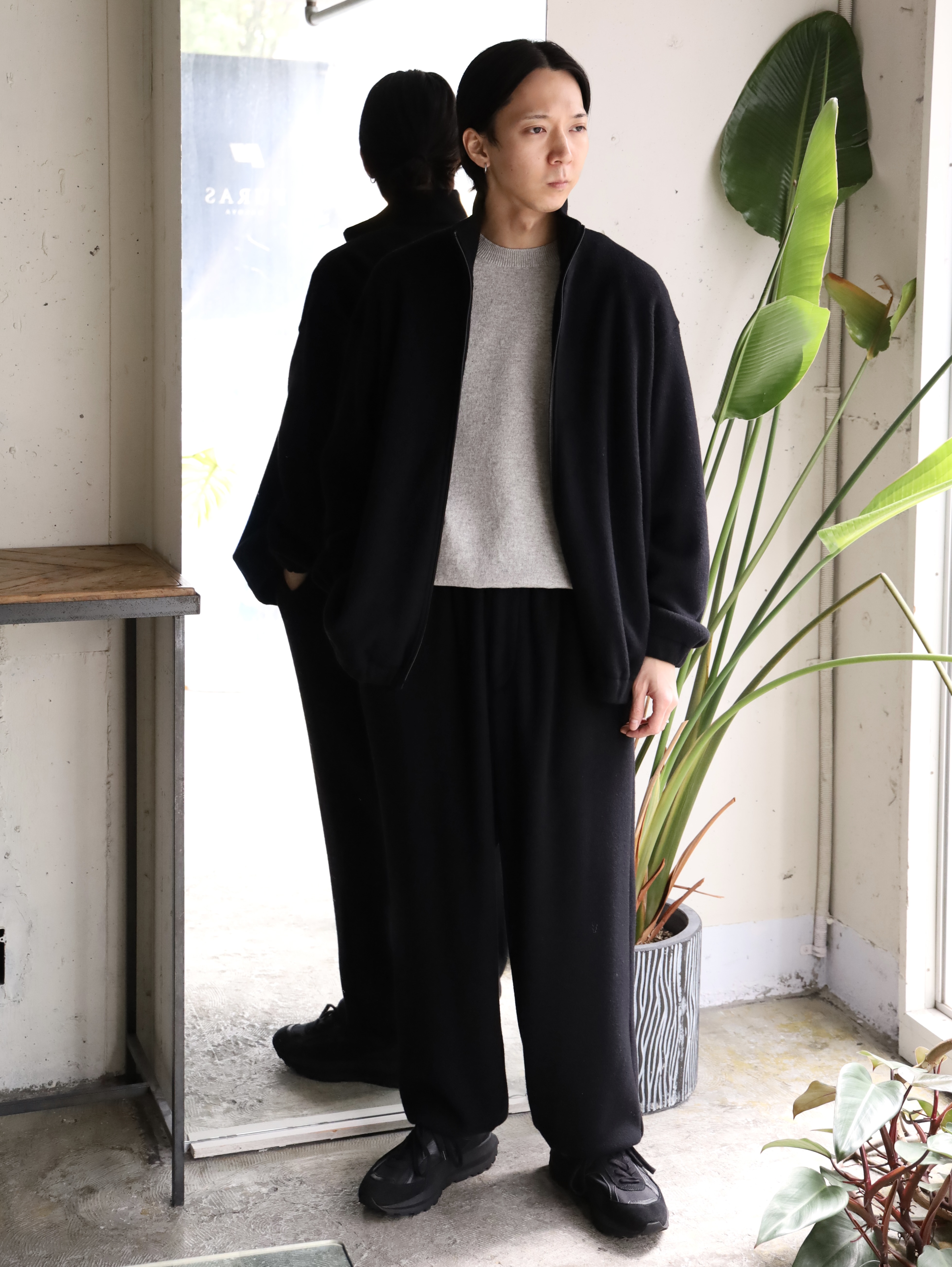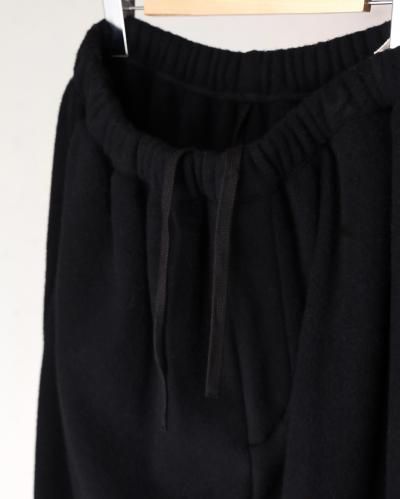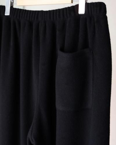クラシカルなスポーツウェアをベースに製作されたトラックパンツ。裾口にゴムを入れシャーリングさせたスポーティーなデザインと、品のあるパターンメイキングにこだわっています。ウエストには一周ゴムを入れており、性別・体型を問わずリラックスしてご着用いただけます。生地には、和歌山のニッターが編み上げた、オリジナルのウールフリースを使用。ウールで編み立てたニットに、両面起毛と度重なる洗い加工を施し、ウール100%でありながらフリースの毛羽立ちや膨らみを再現しています。着用を重ねる度、毛羽立ちと膨らみが増し、より味のある独特な経年変化が楽しめます。