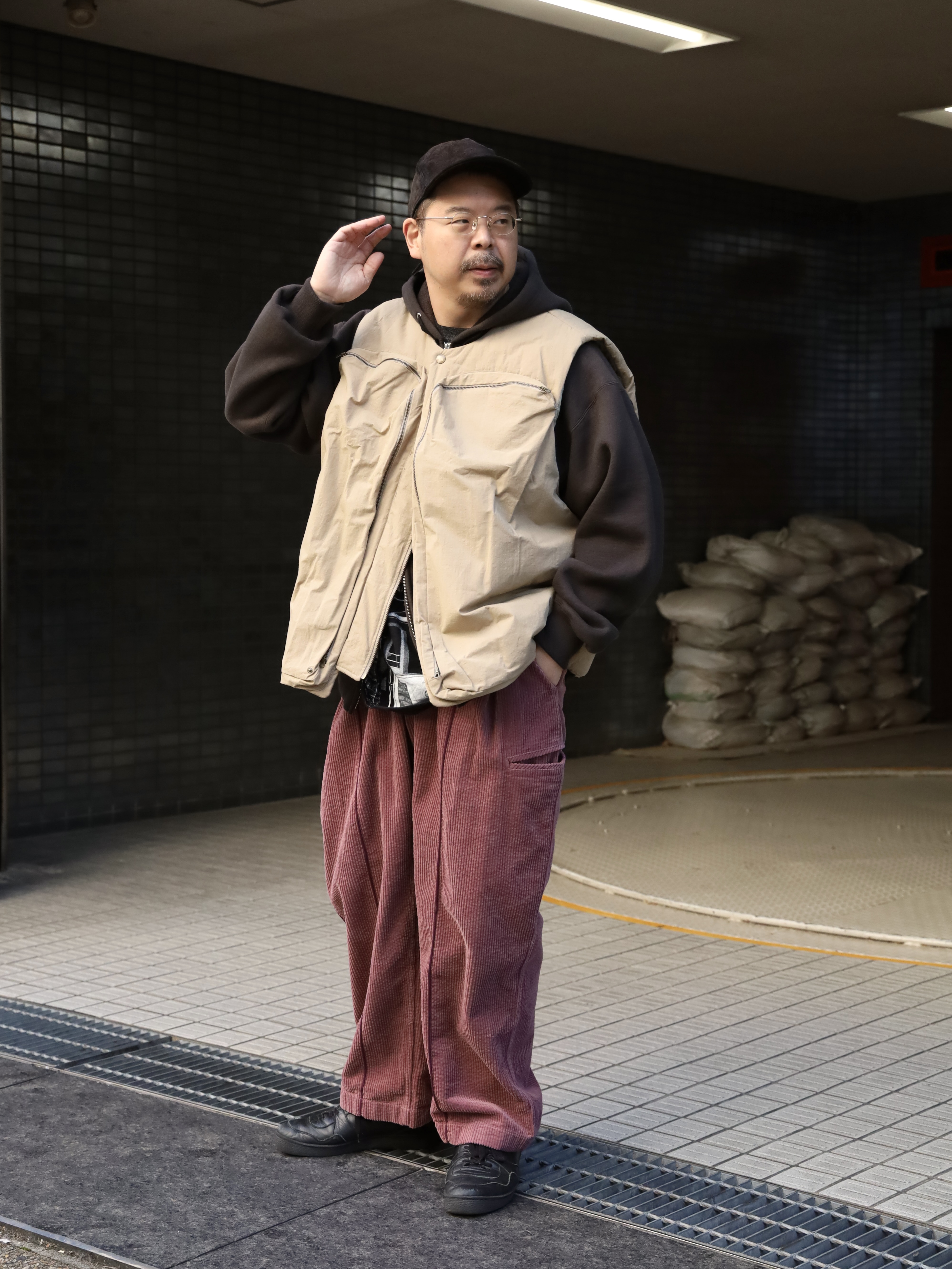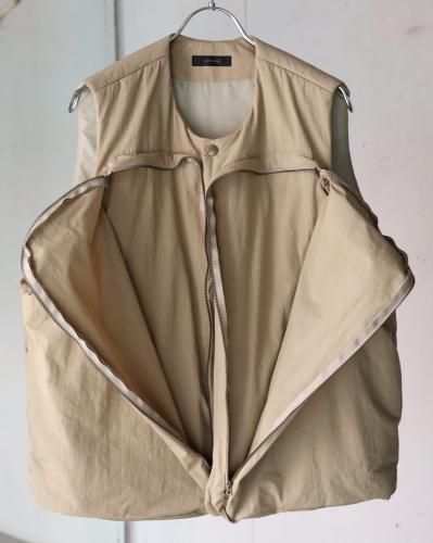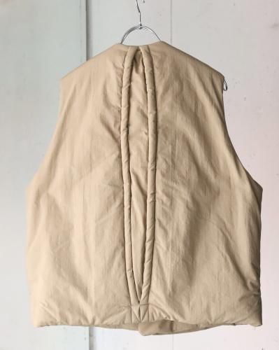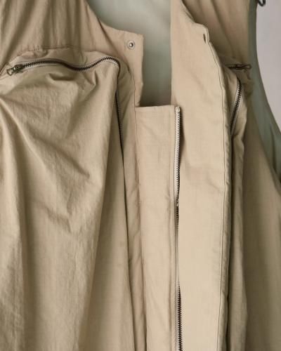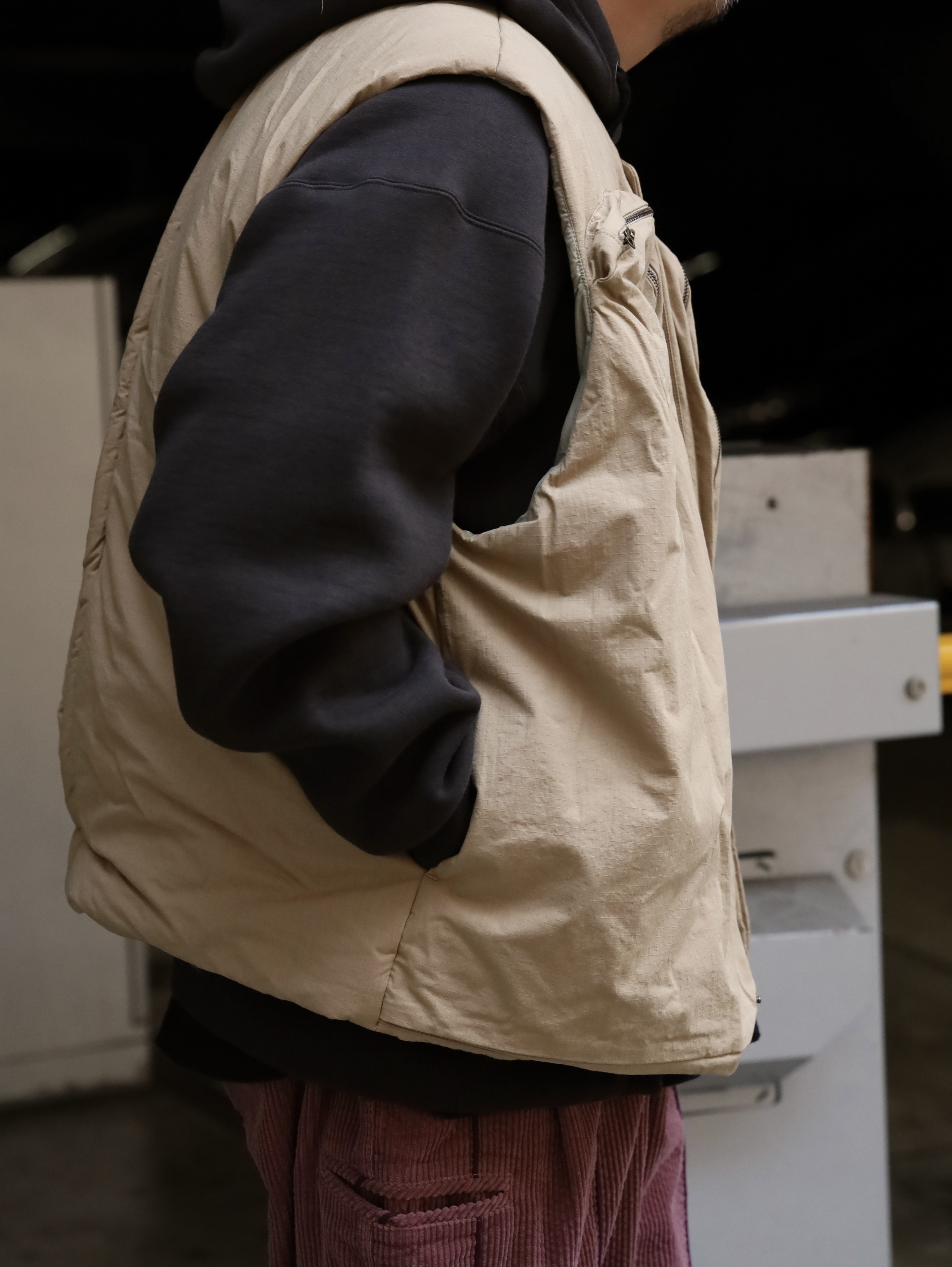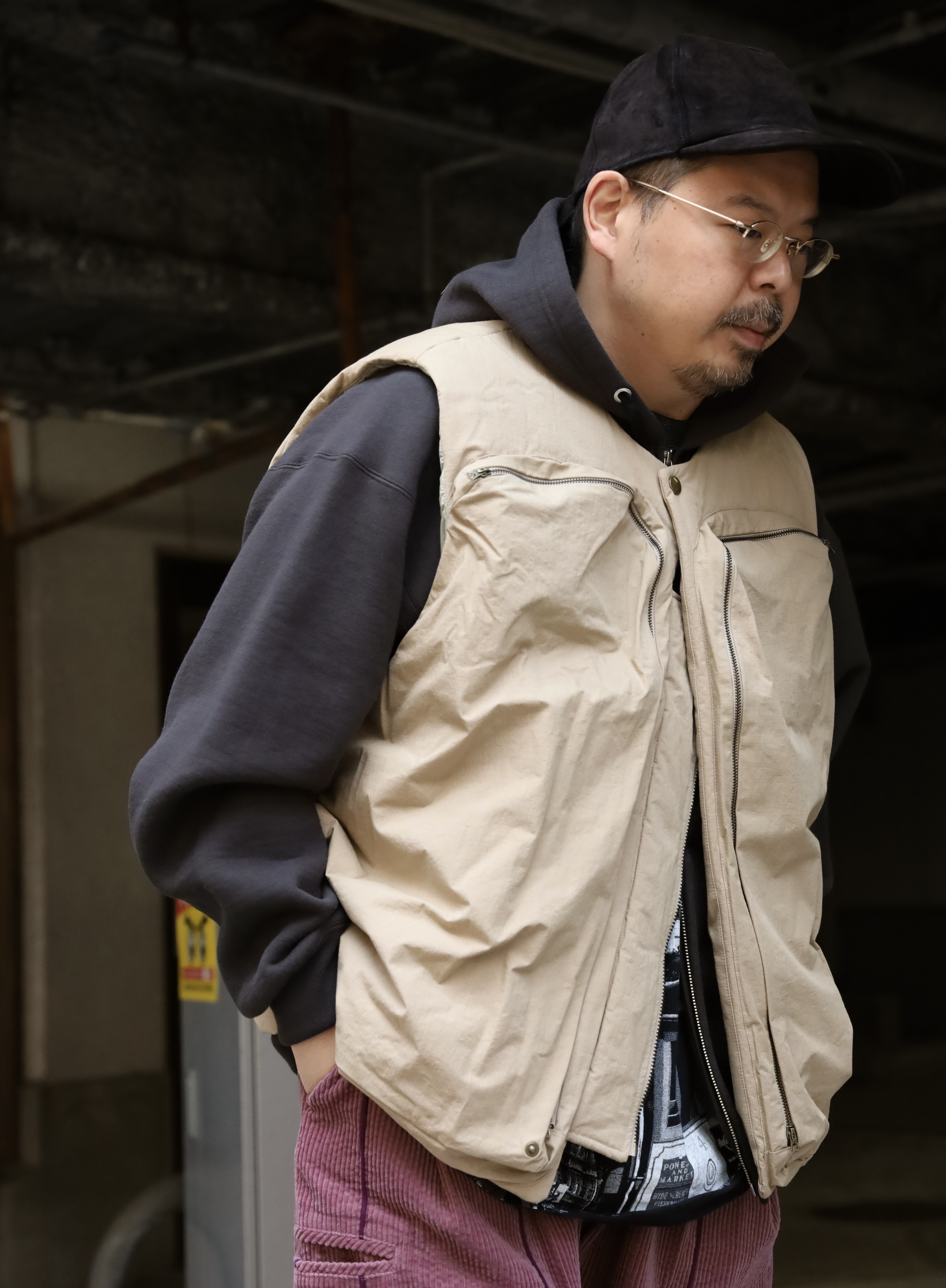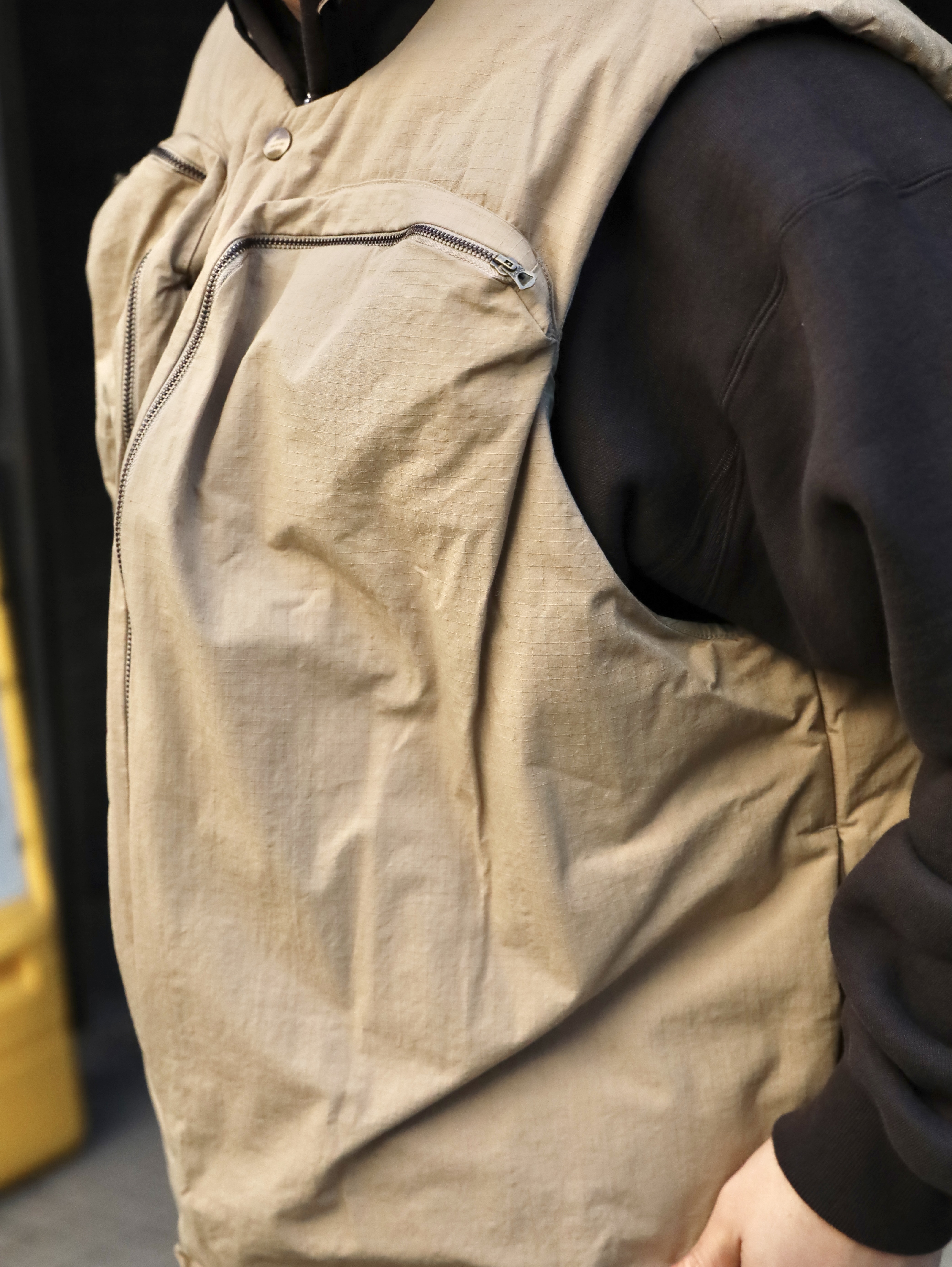 ワッシャー加工と撥水加工の両方を施された高密度なコットン/ナイロンのリップストップを表地に使用したベスト。90's イギリス軍:Waistcoat AFV Crewman Vestのように、左右の前身頃に大きなBAGのようなポケットが配されています。脇下シーム状にはポケットを配置。フロントポケットがボリューミーなので、中綿の量を前と後ろで変えています。