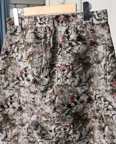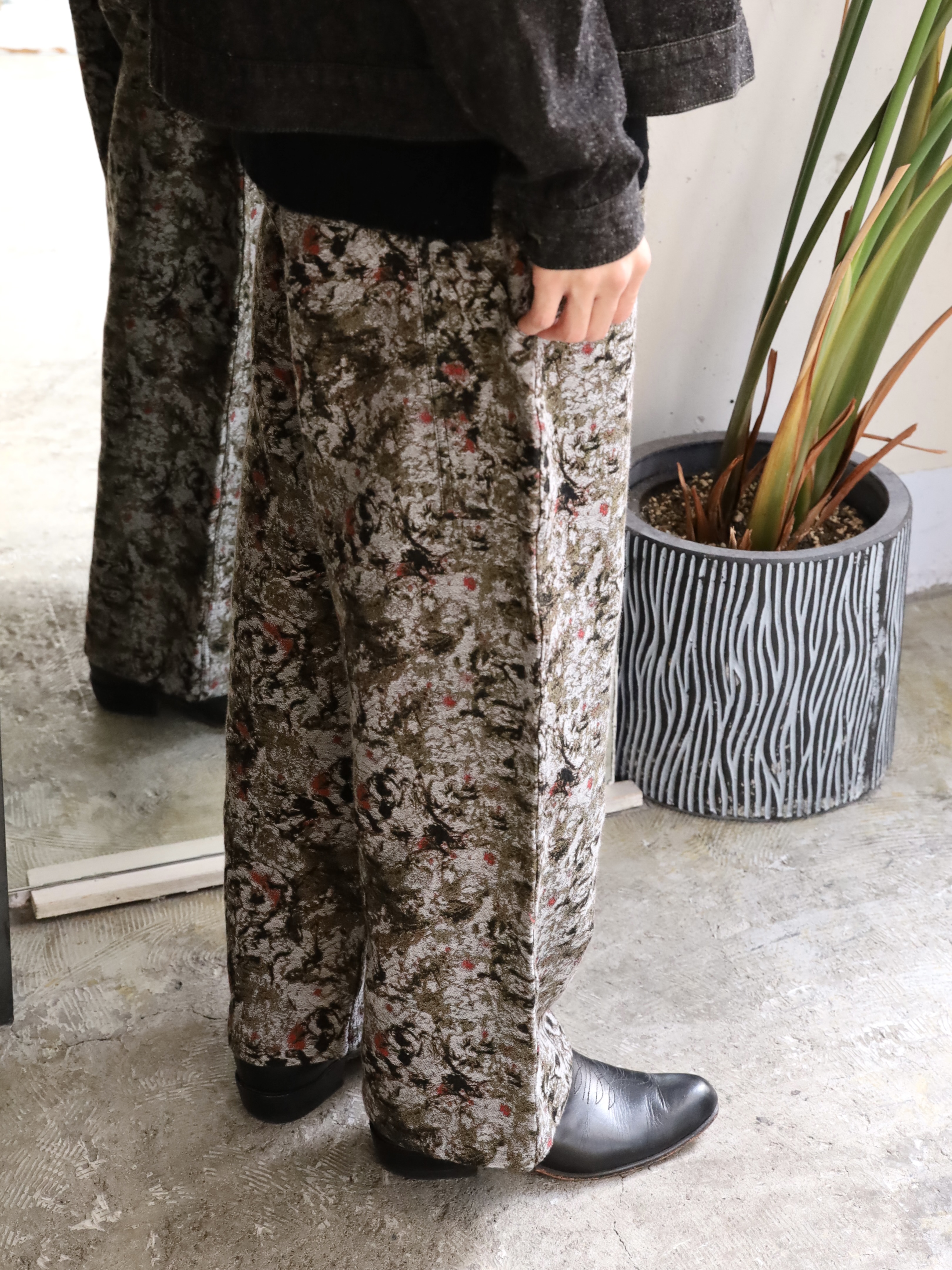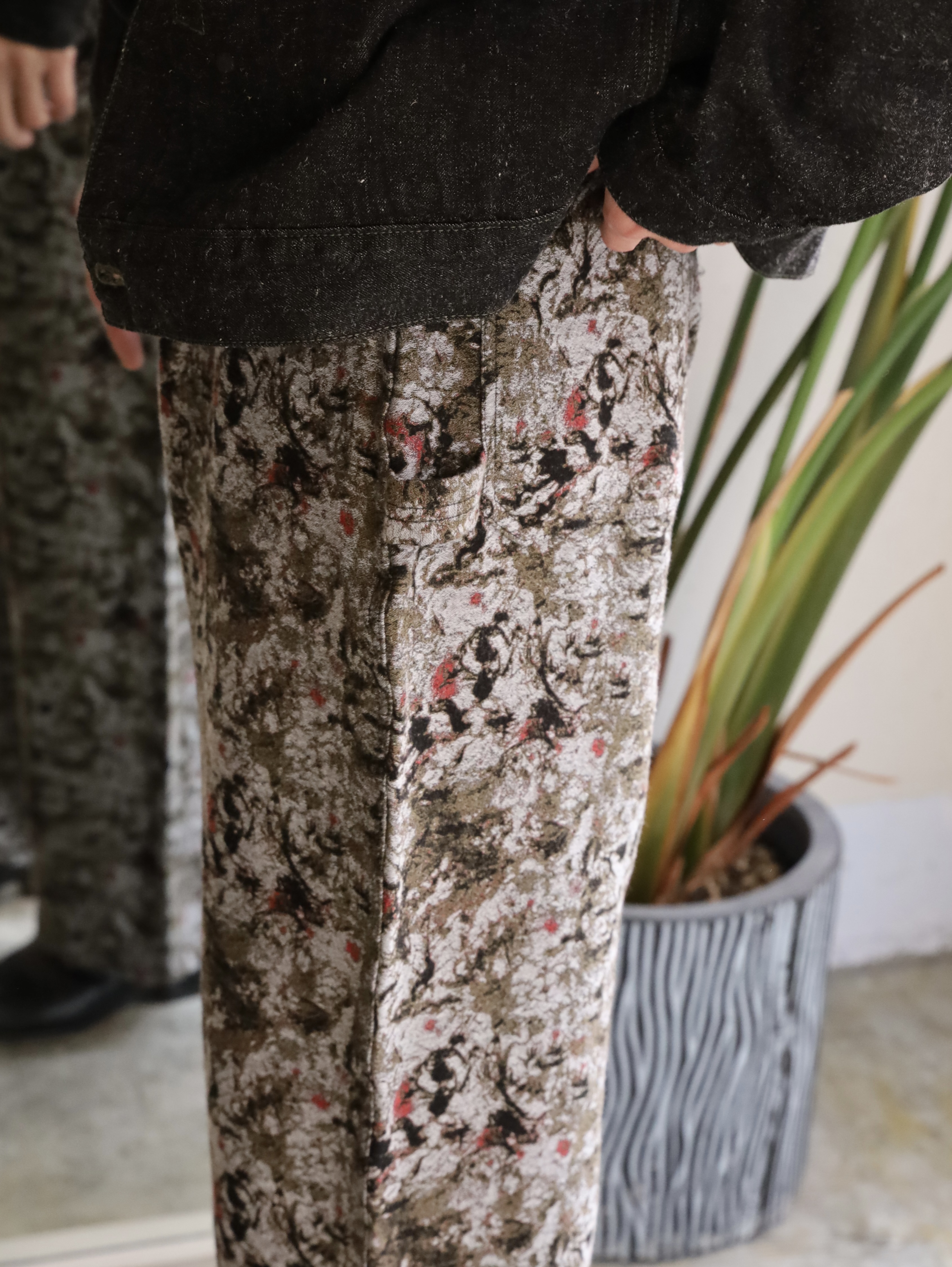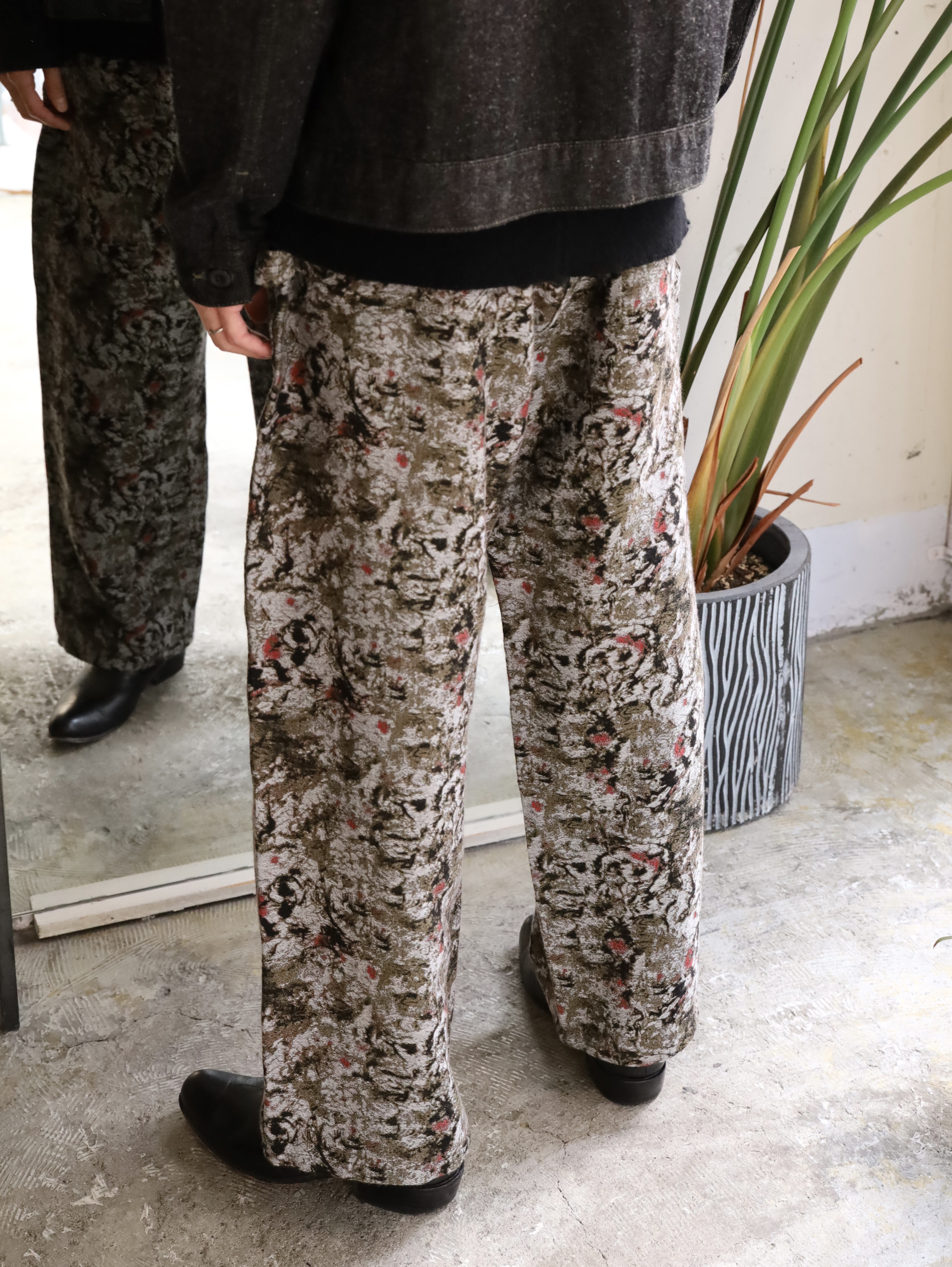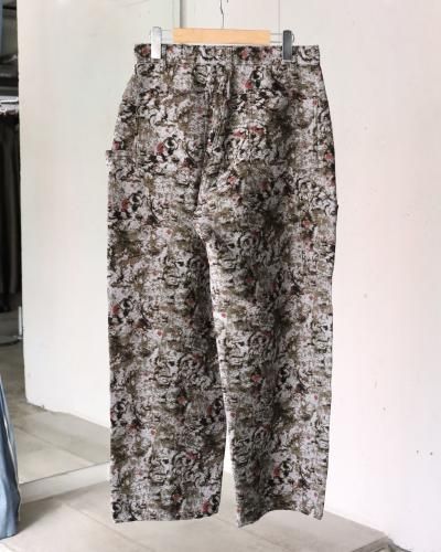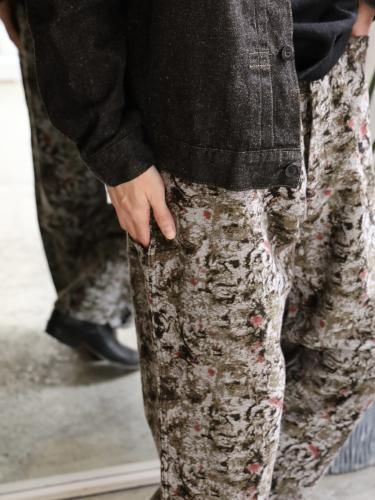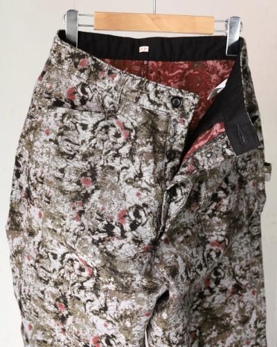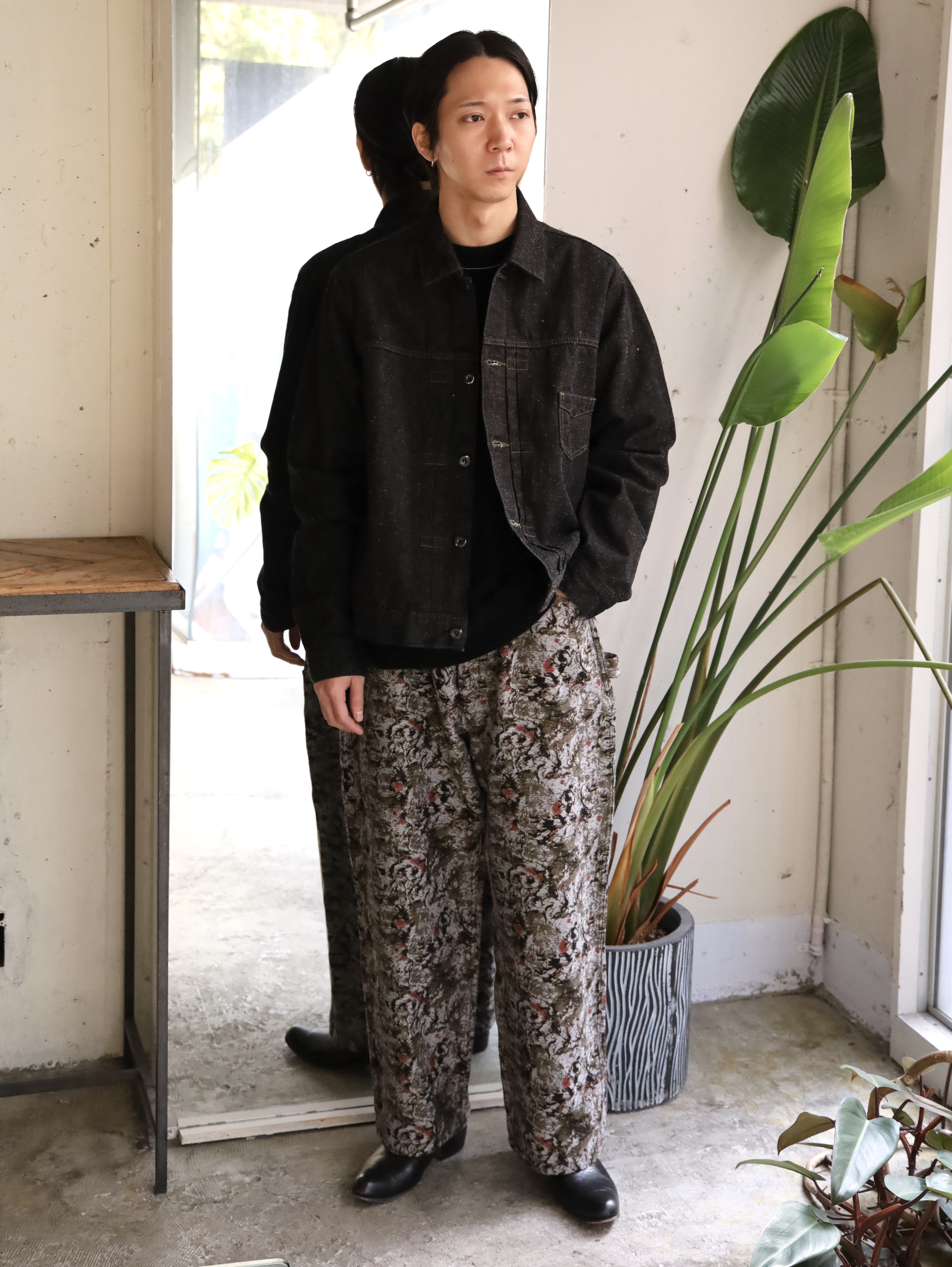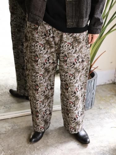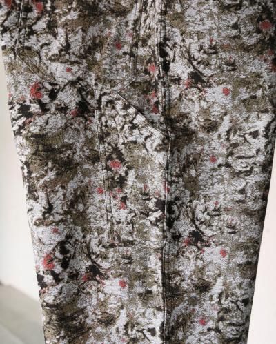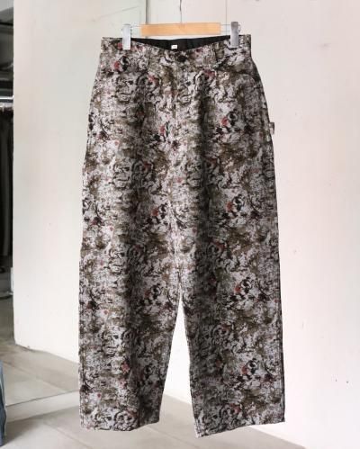 1970年代のフランスのデニムパンツをベースに製作された1本。程よくゆったりとしたサイジングのストレートシルエット。サイドのハンマーループやパッチポケットなど、ワークな印象を感じさせるデザインが魅力です。生地には、1970年代のフランス画家の絵からイメージした抽象的な柄を、ジャガード織機でインディゴ糸を含む経緯ともに4色使いで表現したオリジナル生地を使用。パンチのある色目と柄。沈んだ色や暗めの色を着ることが増えるこれからの季節に、コーディネートの差しとして着てみてください。