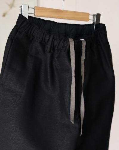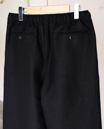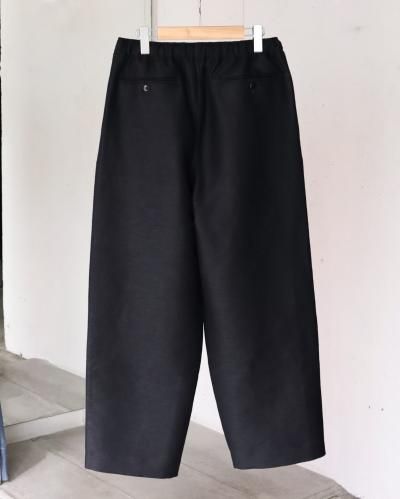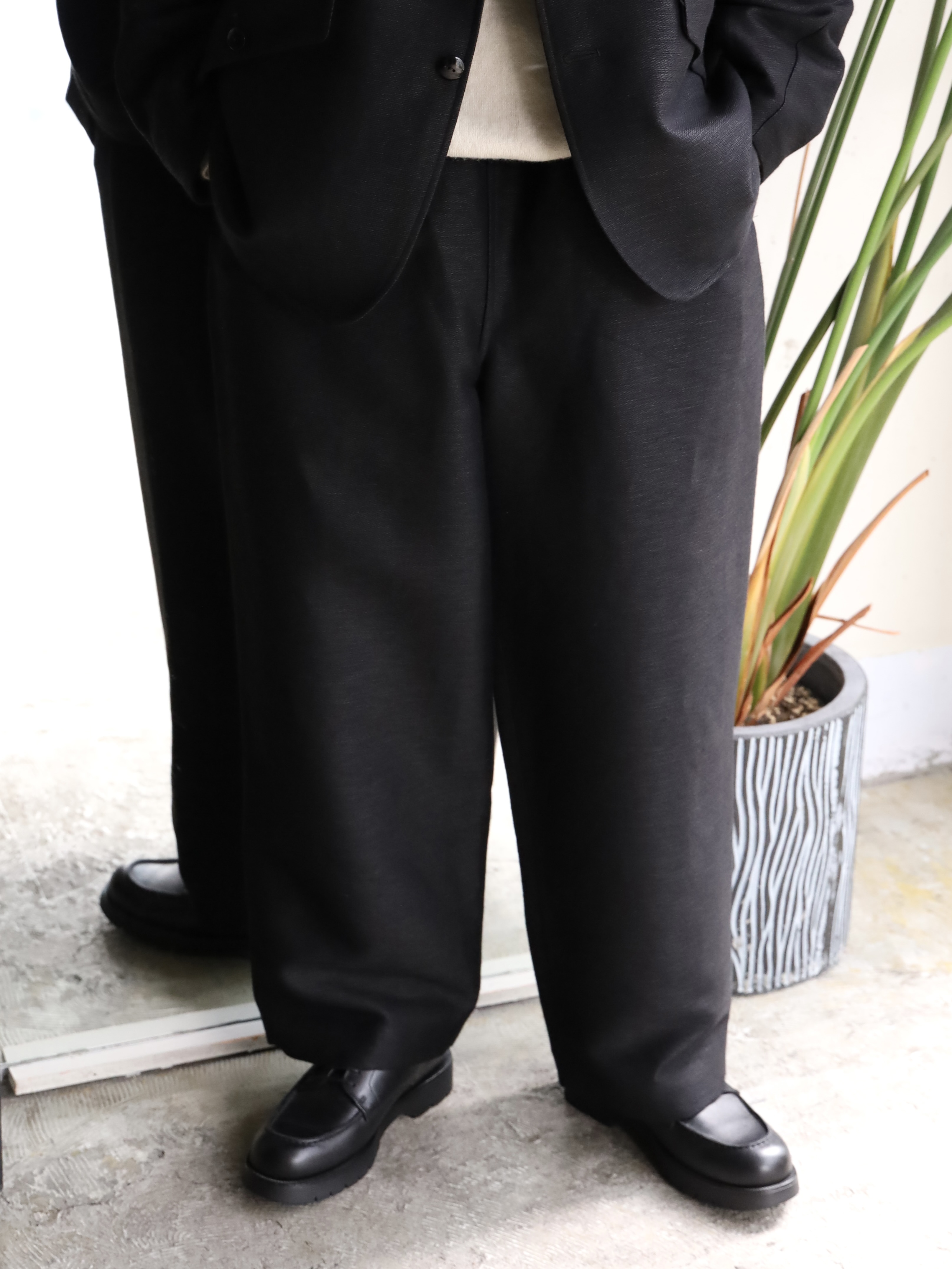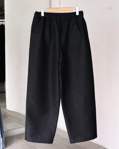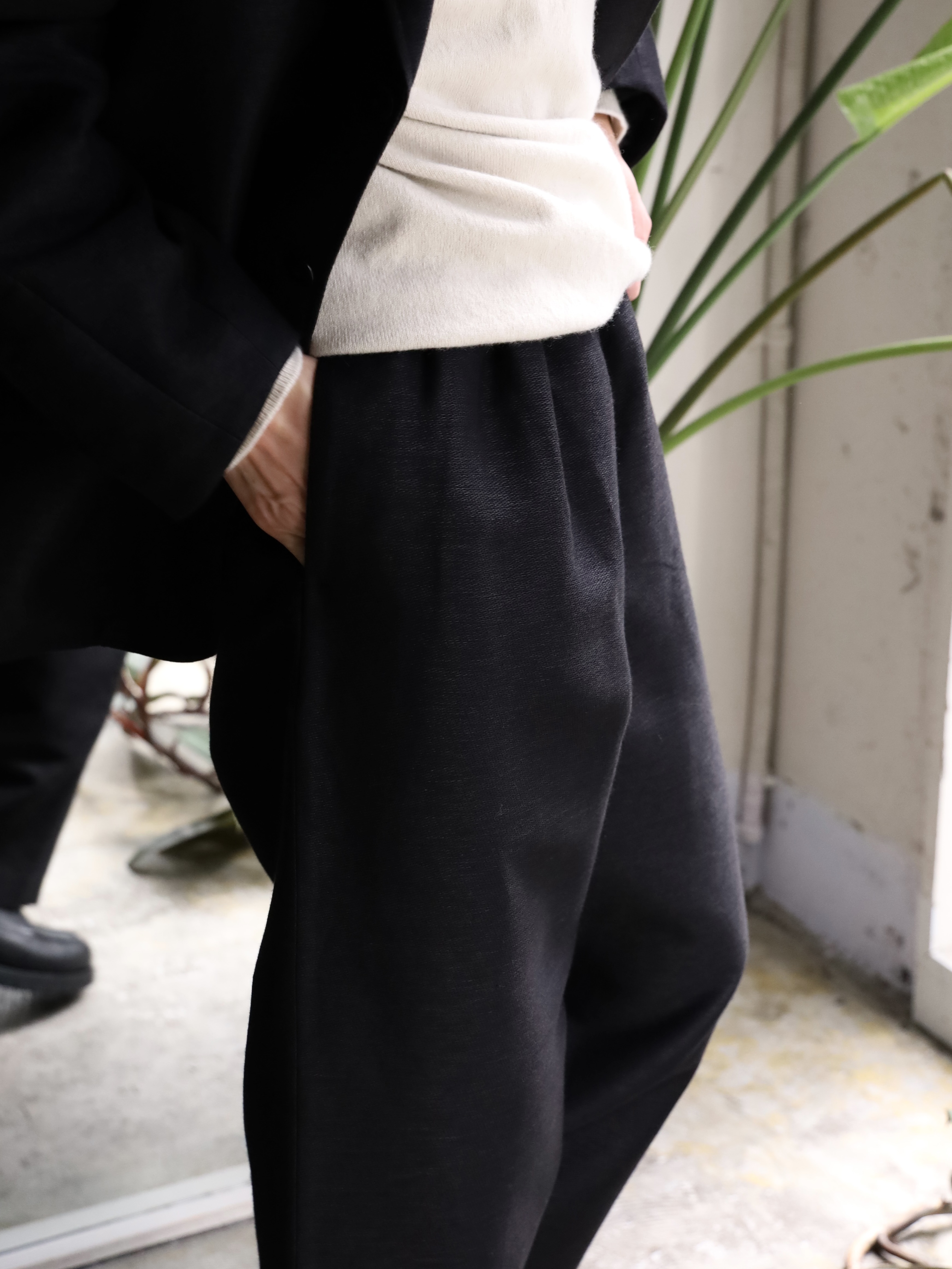 ウエストゴムを入れたワイドシルエットイージートラウザー。ラインナップにあれば必ずオーダーしている、PURASでは定番としてご用意している1本です。ワイドといいながら、若干のテーパードにしシルエットを形成。生地も相まって非常に上品な印象です。ウエストゴムにコットンリネンのコードを通しており、しっかりウエストを締めることができるので、男性のみならず女性が穿いても素敵かなと思います。生地には、愛知県一宮市の変わった織りや混率、糸の組み合わせなど、他では出会えない魅力的な生地を作る機屋/近藤毛織製の、経糸にウール、緯糸の表にヘンプ、裏にウールを用いた完全なリバー組織ではない緯二重組織という特殊な組織の生地を使用。表はヘンプの浮きが大きいためヘンプ特有の光沢感があり、裏は綾の組織でマットな色味で織られています。