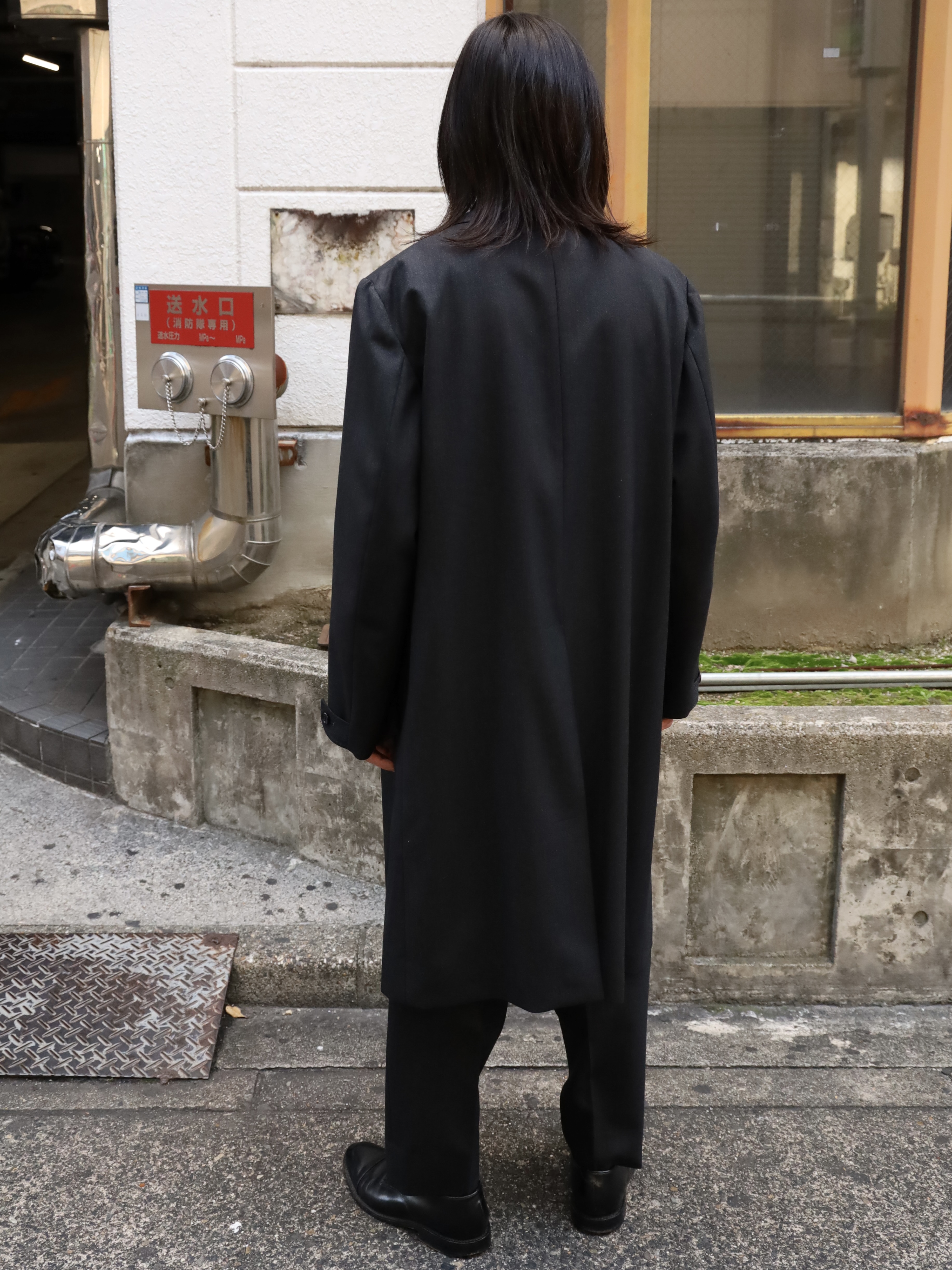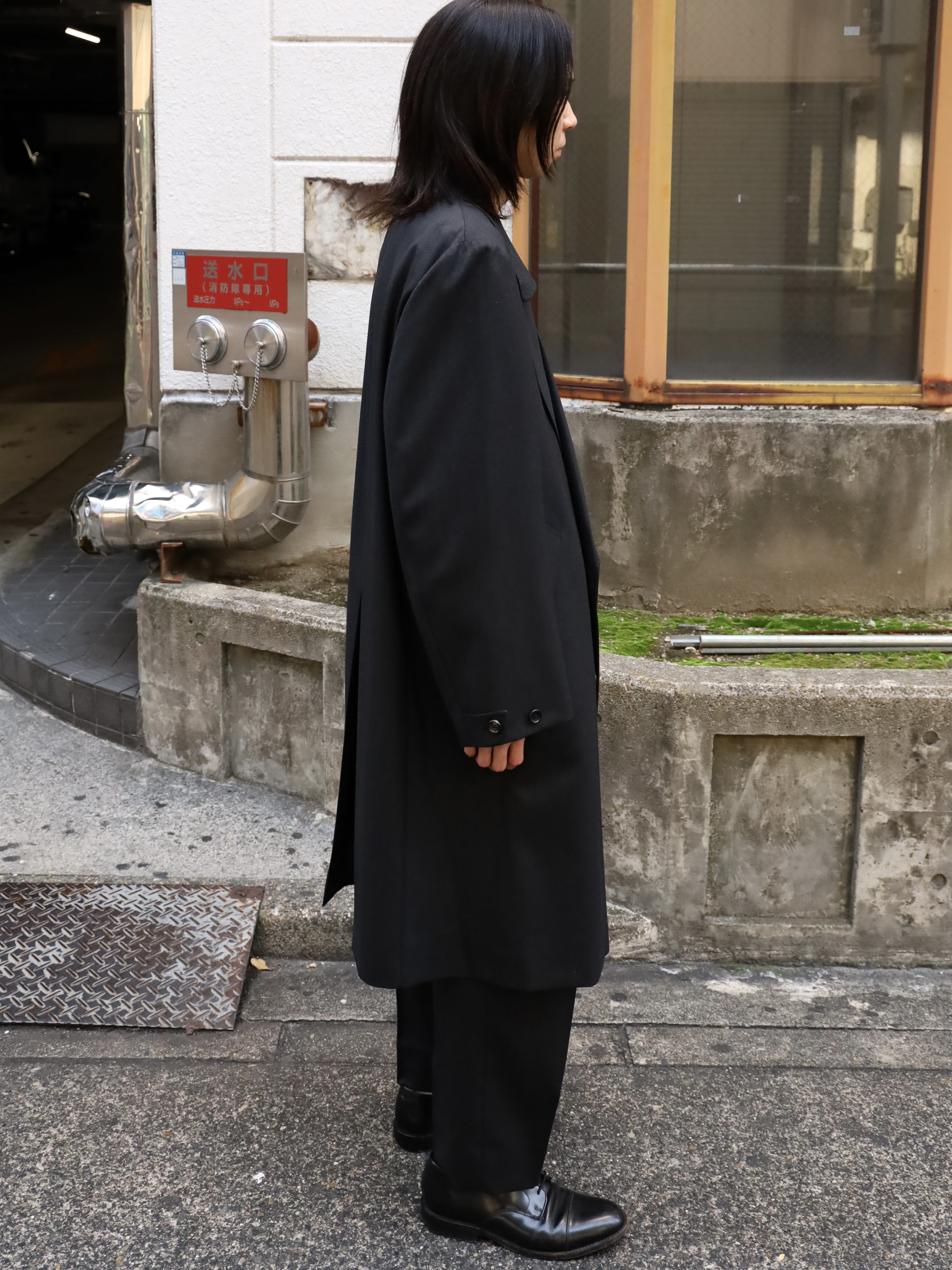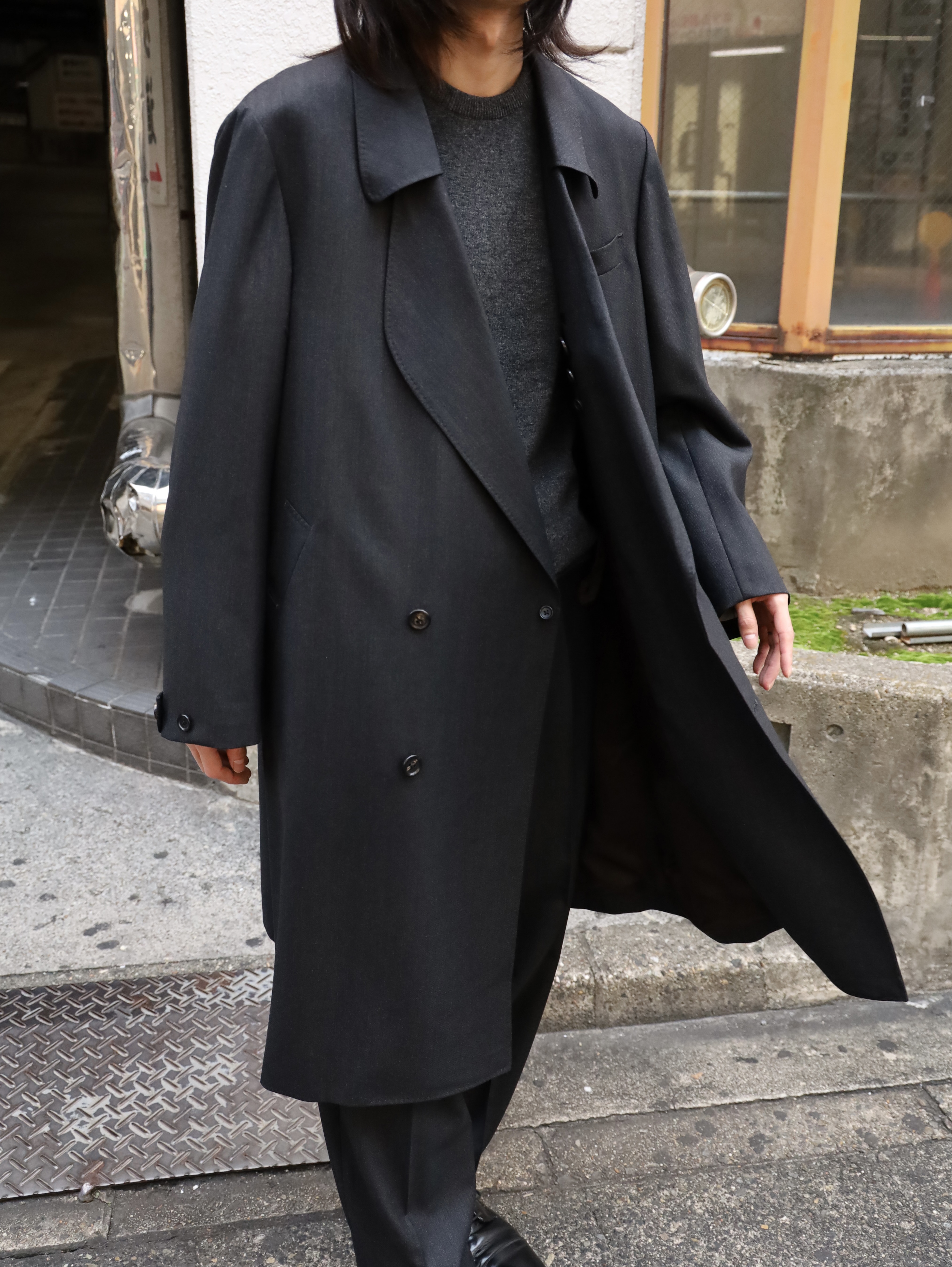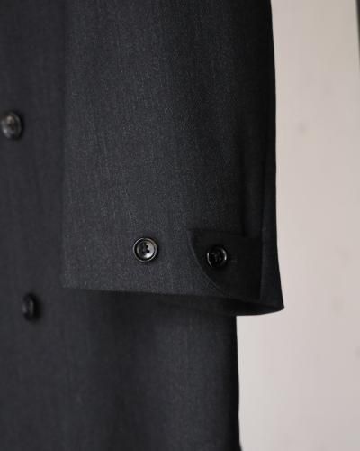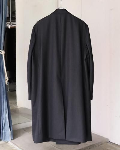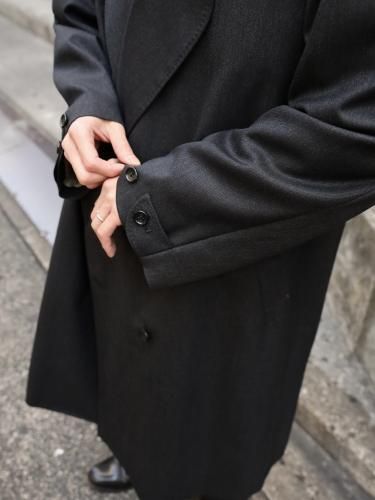 変形ラペルが特徴のコート。肩をややドロップさせ、身幅は分量たっぷりに仕上げたダブル仕様。生地のクオリティーがとても高いので、その雰囲気に負けないよう。そしてしっかり活かせるような形に仕上げられています。フォーマルな印象ですが、パーカーやスウェットといったカジュアルアイテムとも相性が良く、オンオフ問わずご着用いただけます。 芯はビスポークのようにフラシ芯を添え、表地が崩れてこないようにしっかりとハリを出しています。 昔のダブルの紳士服のように、内側に打ち掛け紐を付け、前打ち合わせのボタンをかけずに着ても、見栄え良く安定するよう設計されています。生地には、ウールの産地として知られる愛知県一宮市。その一角にある葛利毛織を訪ねて選んだ、弾力性が強く、非常に滑らかで膨らみがある生地を使用。上質なウール生地の中から、かなり迷いこの生地に巡り合いました。経糸は2色を強撚し、緯糸は無地でカルゼ組織で織り上げており、まだら模様のようなうっすらジャガードにもみえるような奥行きのある印象。素材の風合いを最大に活かすようションヘルと呼ばれる低速織機で丁寧に織り、時間をかけて仕上げています。