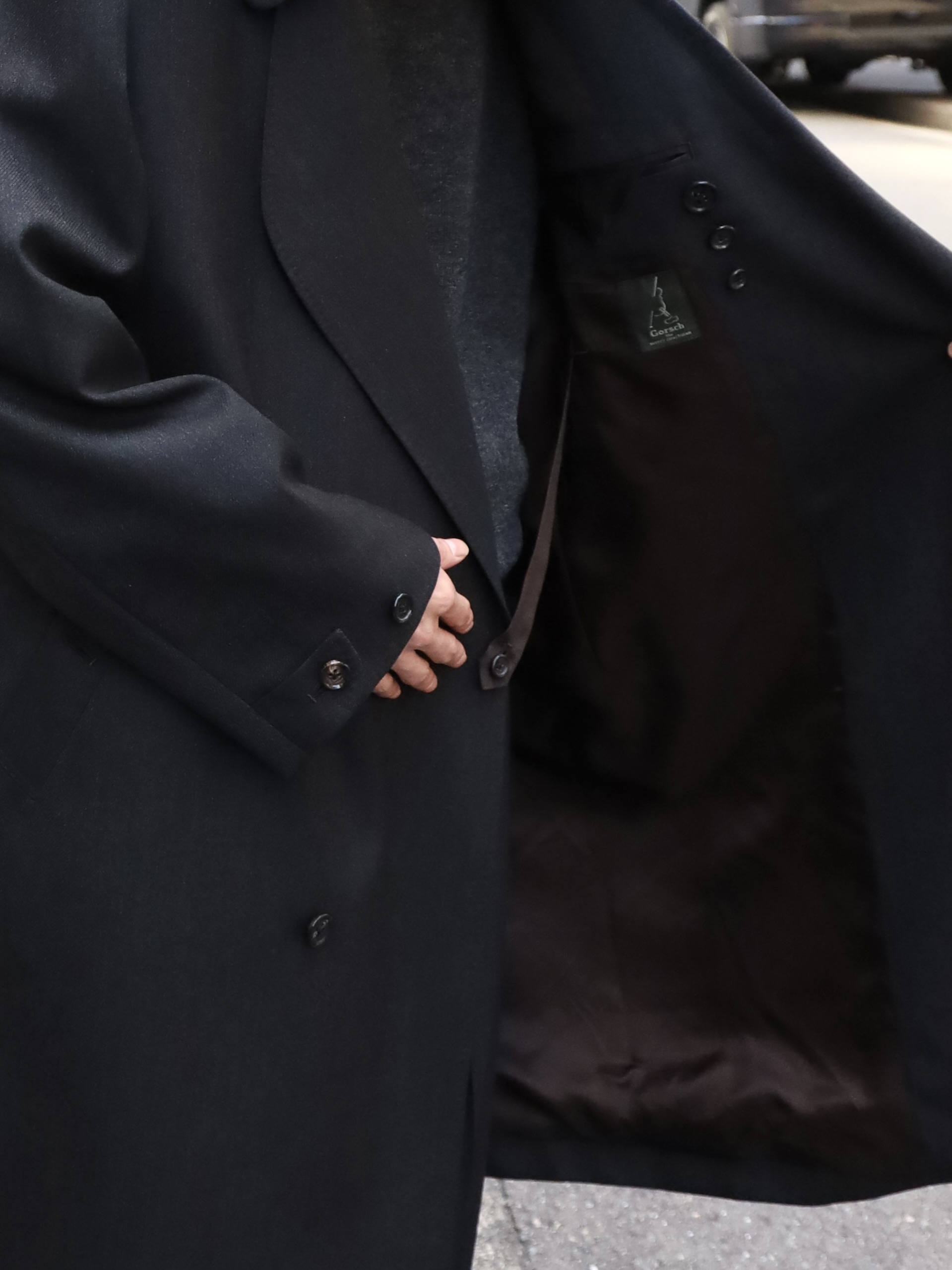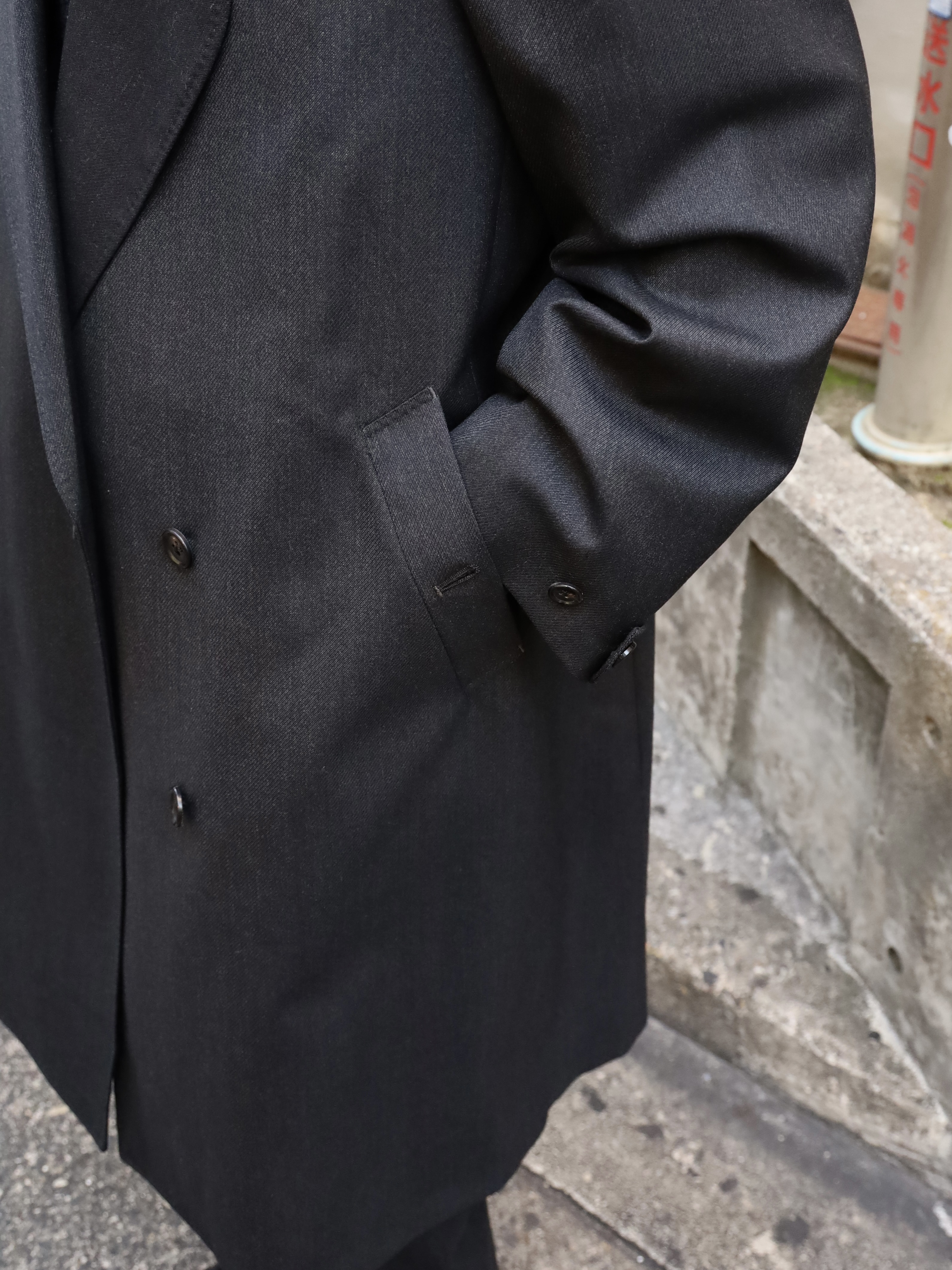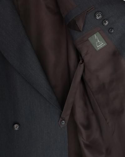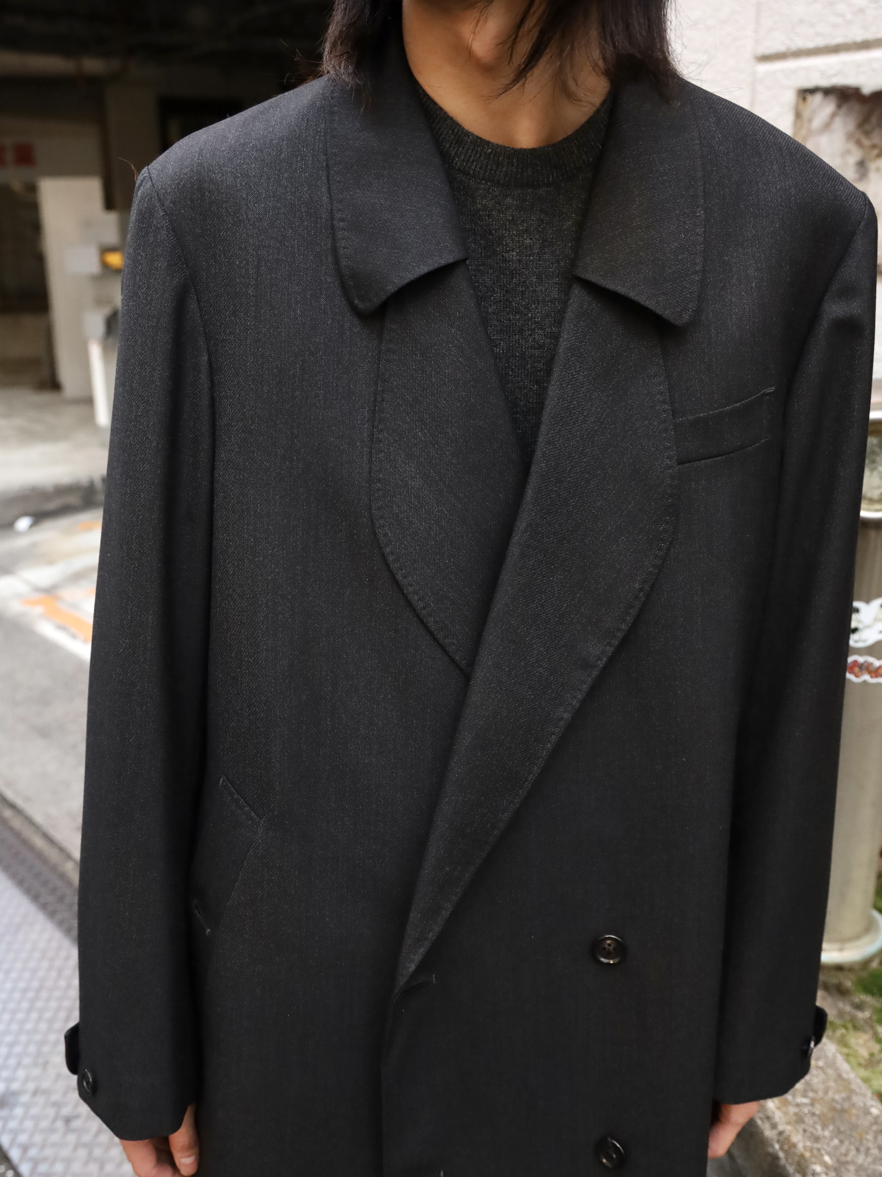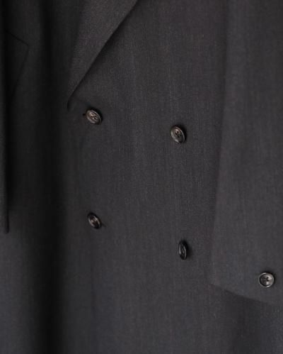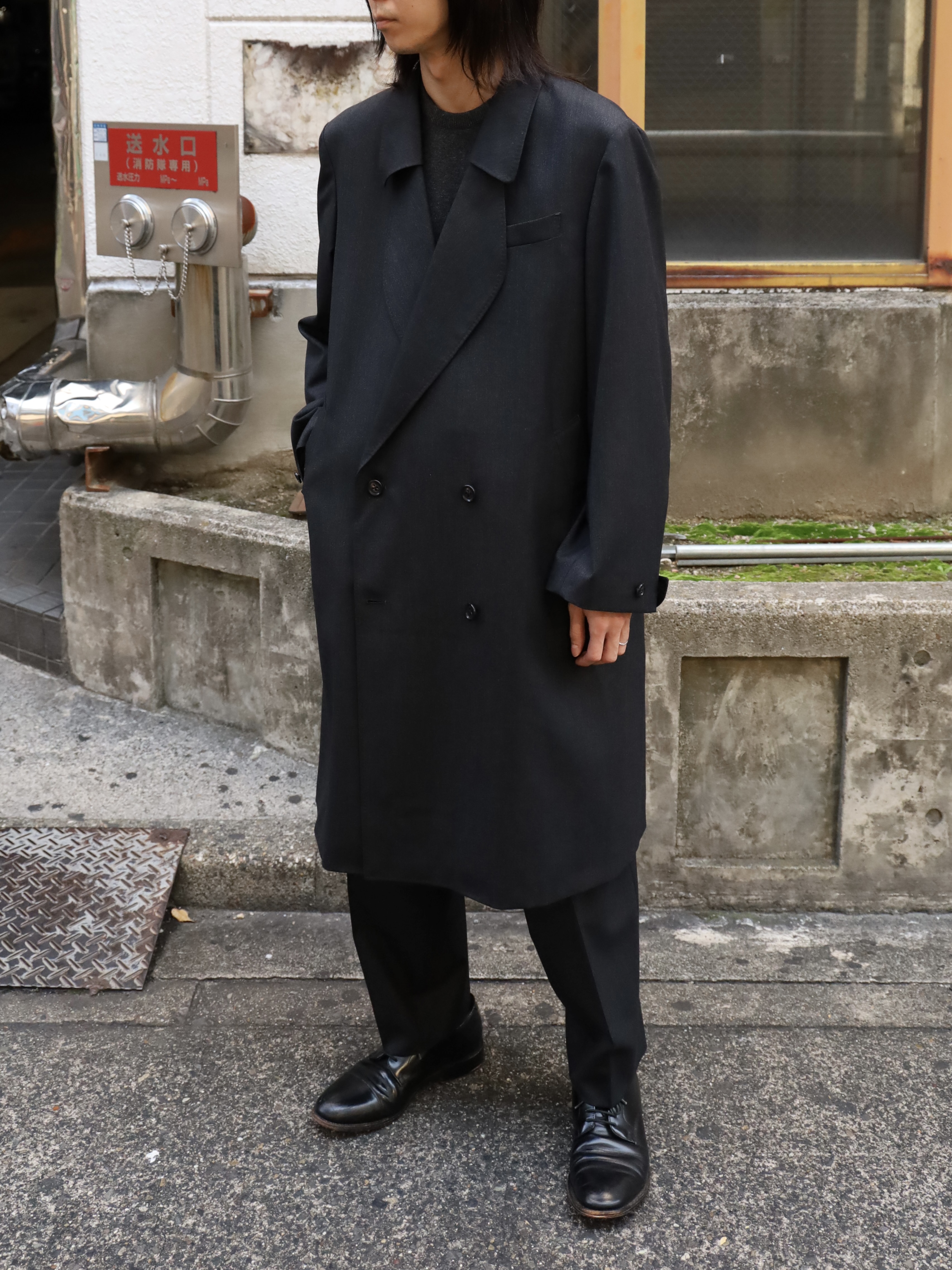 変形ラペルが特徴のコート。肩をややドロップさせ、身幅は分量たっぷりに仕上げたダブル仕様。生地のクオリティーがとても高いので、その雰囲気に負けないよう。そしてしっかり活かせるような形に仕上げられています。フォーマルな印象ですが、パーカーやスウェットといったカジュアルアイテムとも相性が良く、オンオフ問わずご着用いただけます。 芯はビスポークのようにフラシ芯を添え、表地が崩れてこないようにしっかりとハリを出しています。 昔のダブルの紳士服のように、内側に打ち掛け紐を付け、前打ち合わせのボタンをかけずに着ても、見栄え良く安定するよう設計されています。生地には、ウールの産地として知られる愛知県一宮市。その一角にある葛利毛織を訪ねて選んだ、弾力性が強く、非常に滑らかで膨らみがある生地を使用。上質なウール生地の中から、かなり迷いこの生地に巡り合いました。経糸は2色を強撚し、緯糸は無地でカルゼ組織で織り上げており、まだら模様のようなうっすらジャガードにもみえるような奥行きのある印象。素材の風合いを最大に活かすようションヘルと呼ばれる低速織機で丁寧に織り、時間をかけて仕上げています。