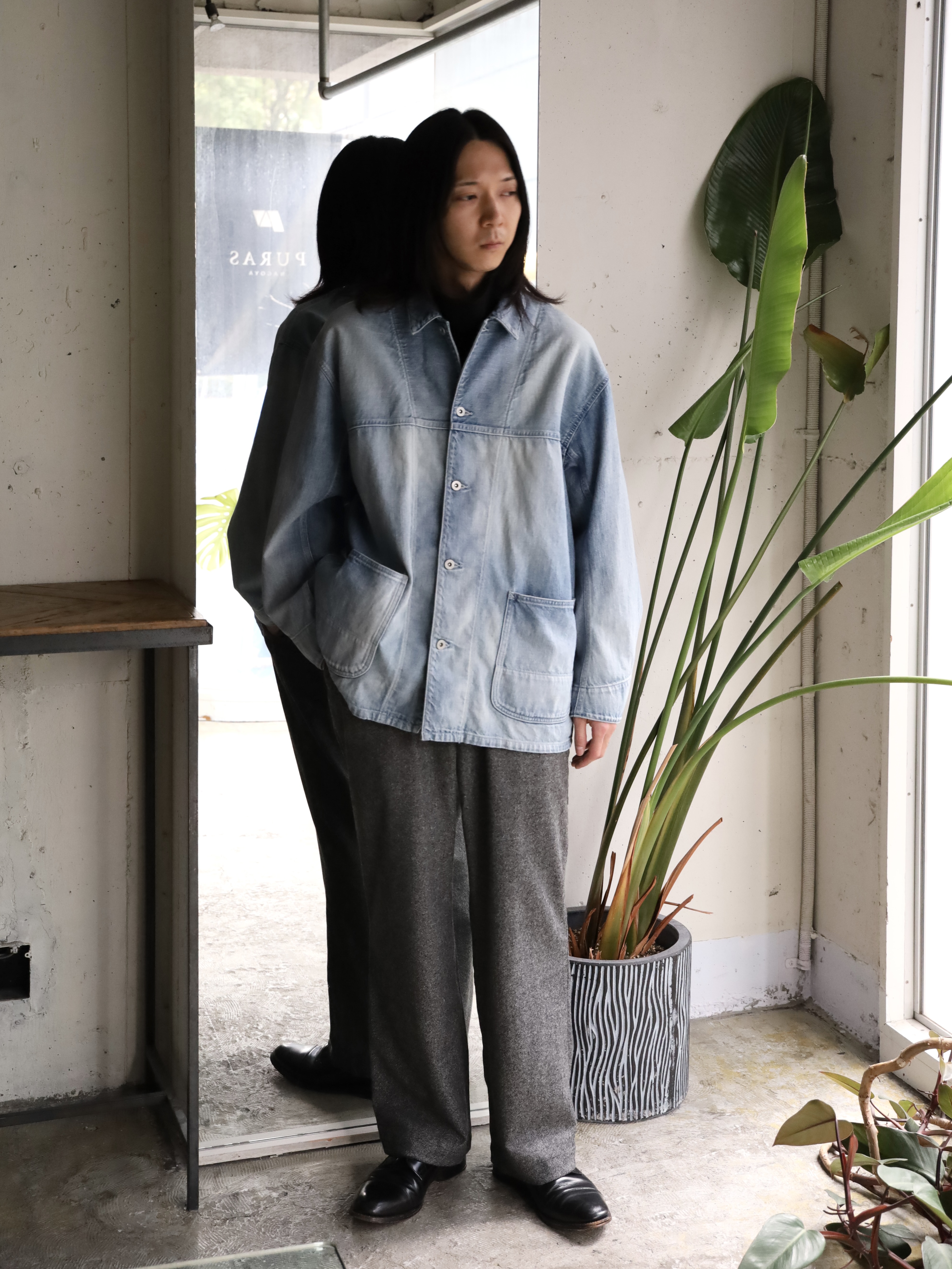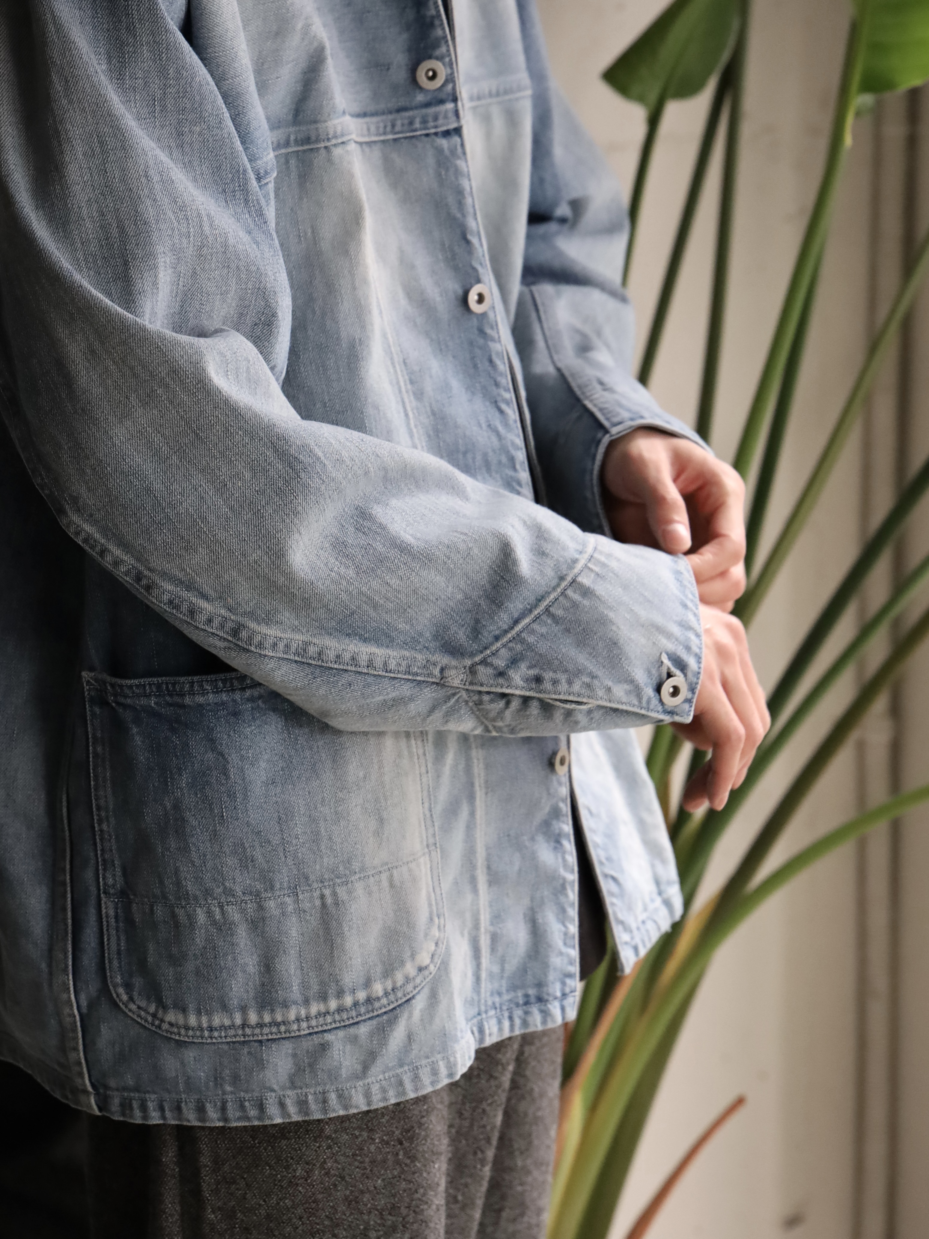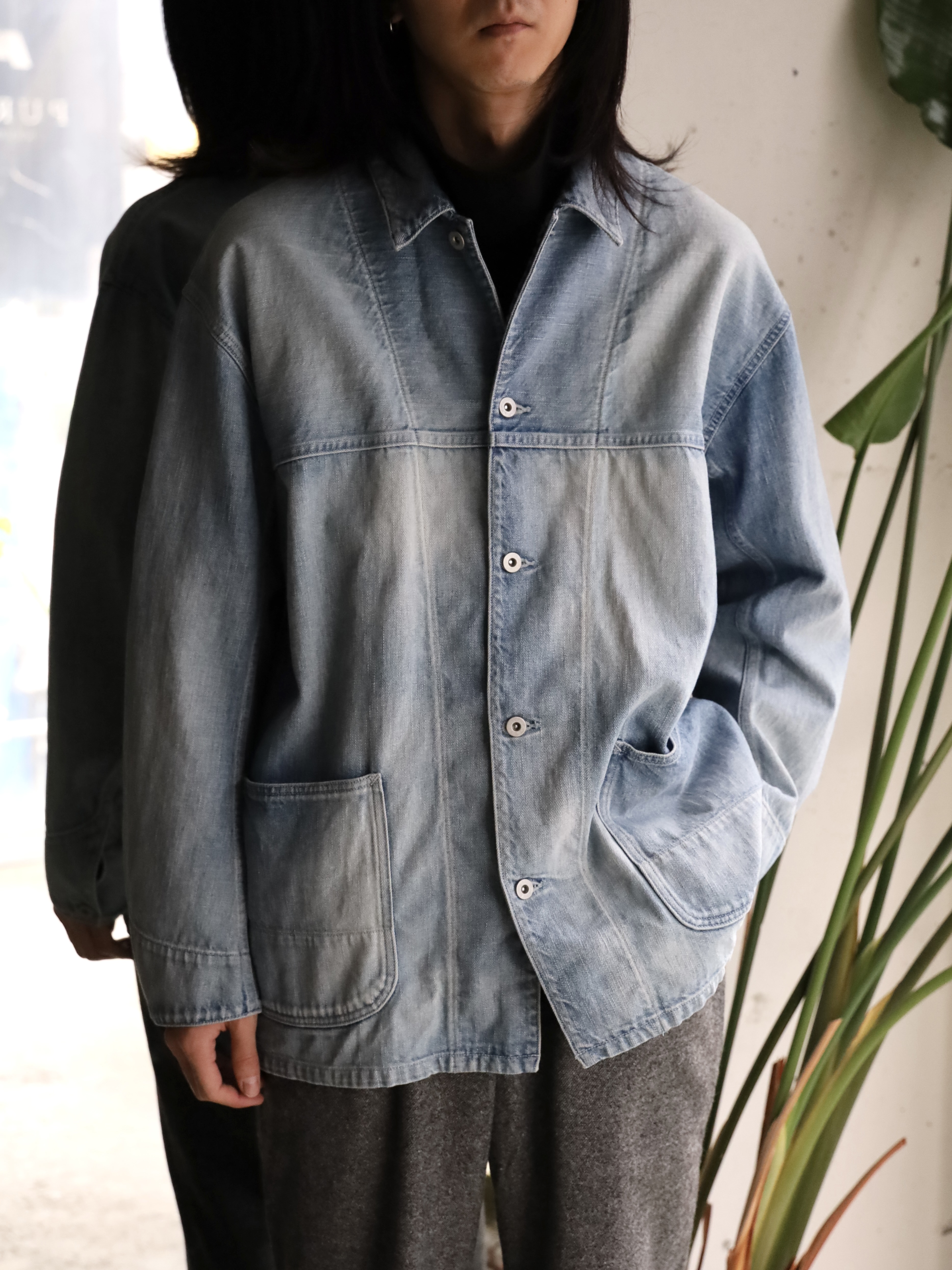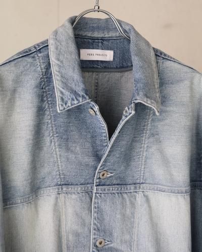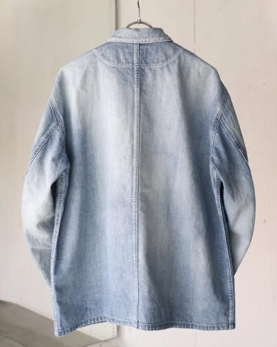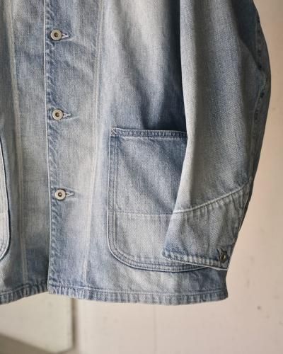 60年代から70年代初頭頃のデニムカバーオールをモチーフに、ショルダーヨークやポケットの形状でモダンにアレンジし存在感を際立たせた1着。アウターとしてはもちろん、インナー使いもしやすい程よいサイジングです。生地には、ムラ糸を使い、経と横の糸の太さを変えることでミドルオンスでありながらフラットにならず、奥行のある表情に仕上がっている。ヴィンテージ加工は、世界でも指折りの加工技術を持つ児島の職人により1点づつ加工を加えています。
