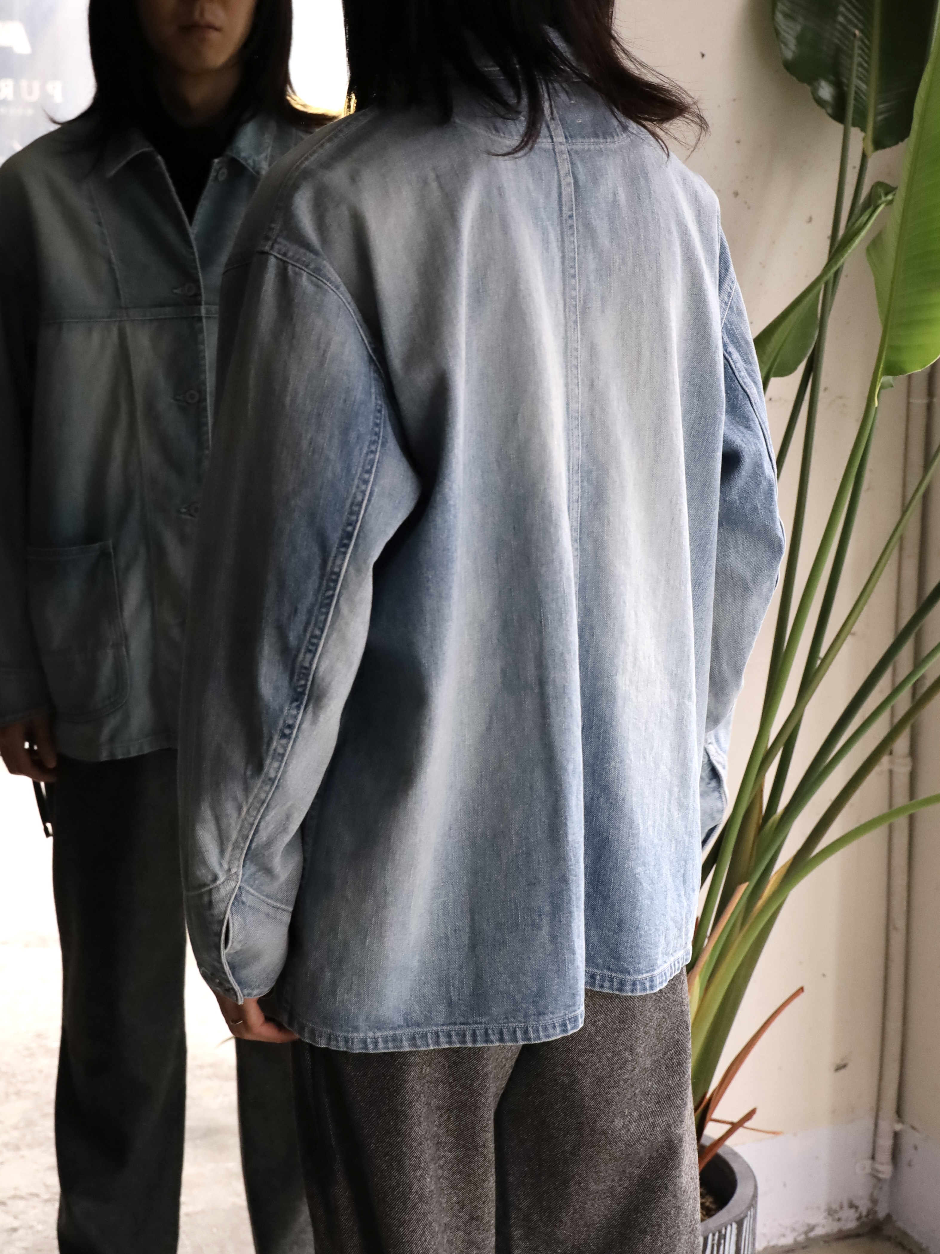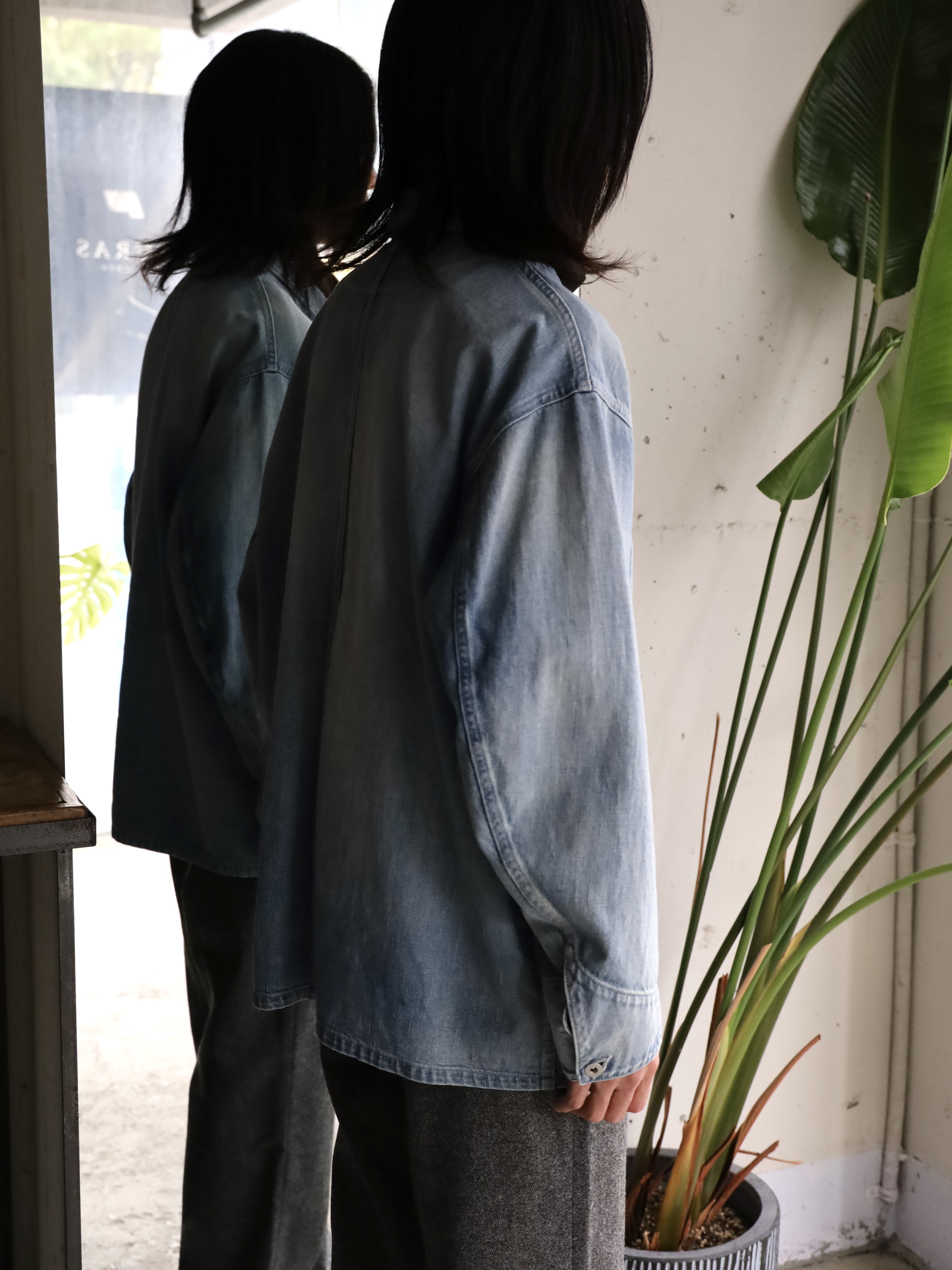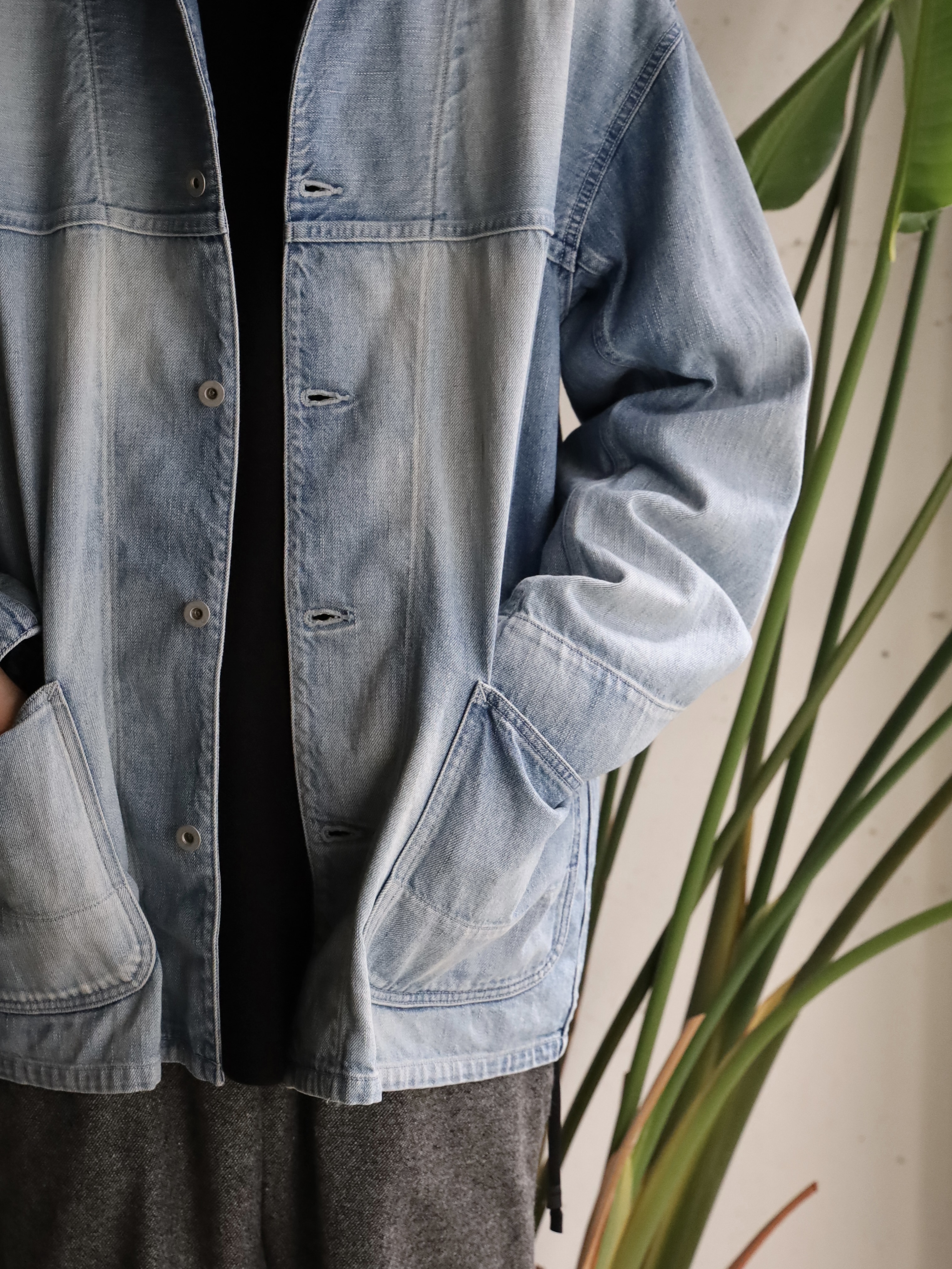 60年代から70年代初頭頃のデニムカバーオールをモチーフに、ショルダーヨークやポケットの形状でモダンにアレンジし存在感を際立たせた1着。アウターとしてはもちろん、インナー使いもしやすい程よいサイジングです。生地には、ムラ糸を使い、経と横の糸の太さを変えることでミドルオンスでありながらフラットにならず、奥行のある表情に仕上がっている。ヴィンテージ加工は、世界でも指折りの加工技術を持つ児島の職人により1点づつ加工を加えています。