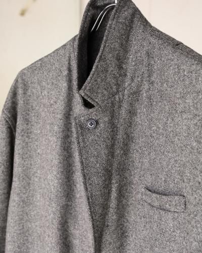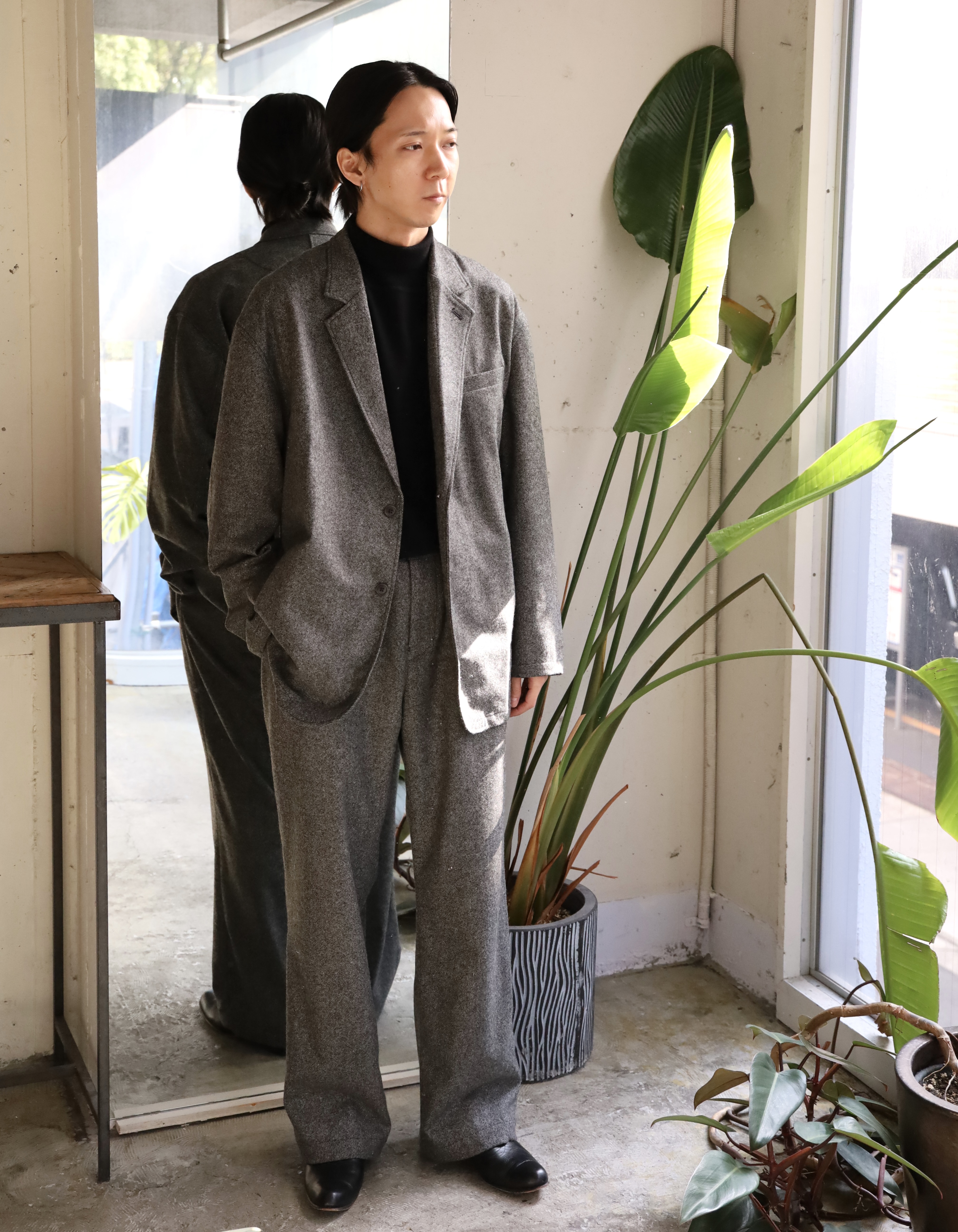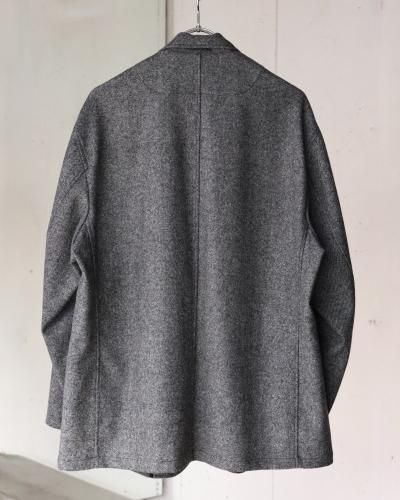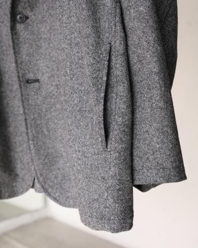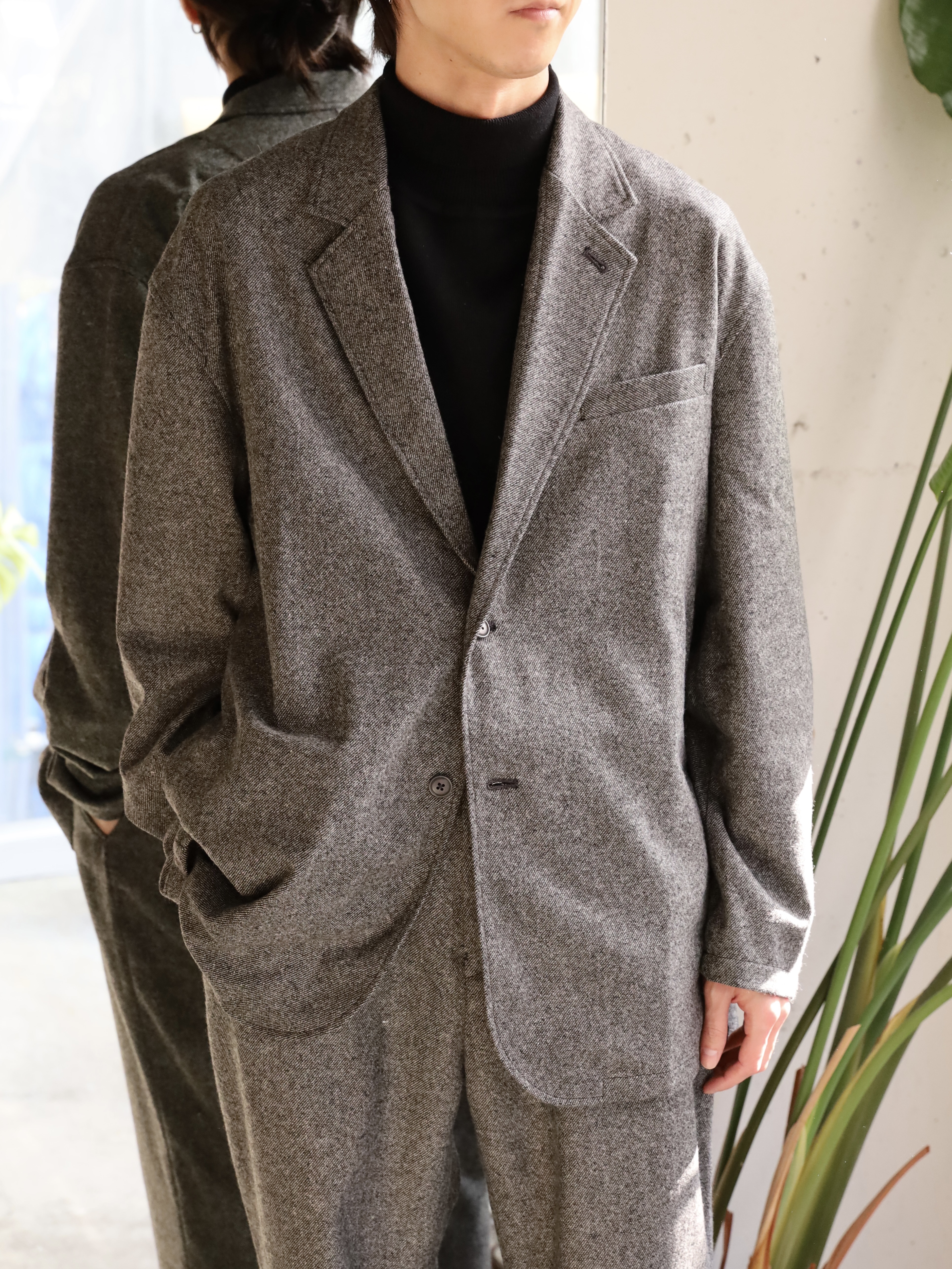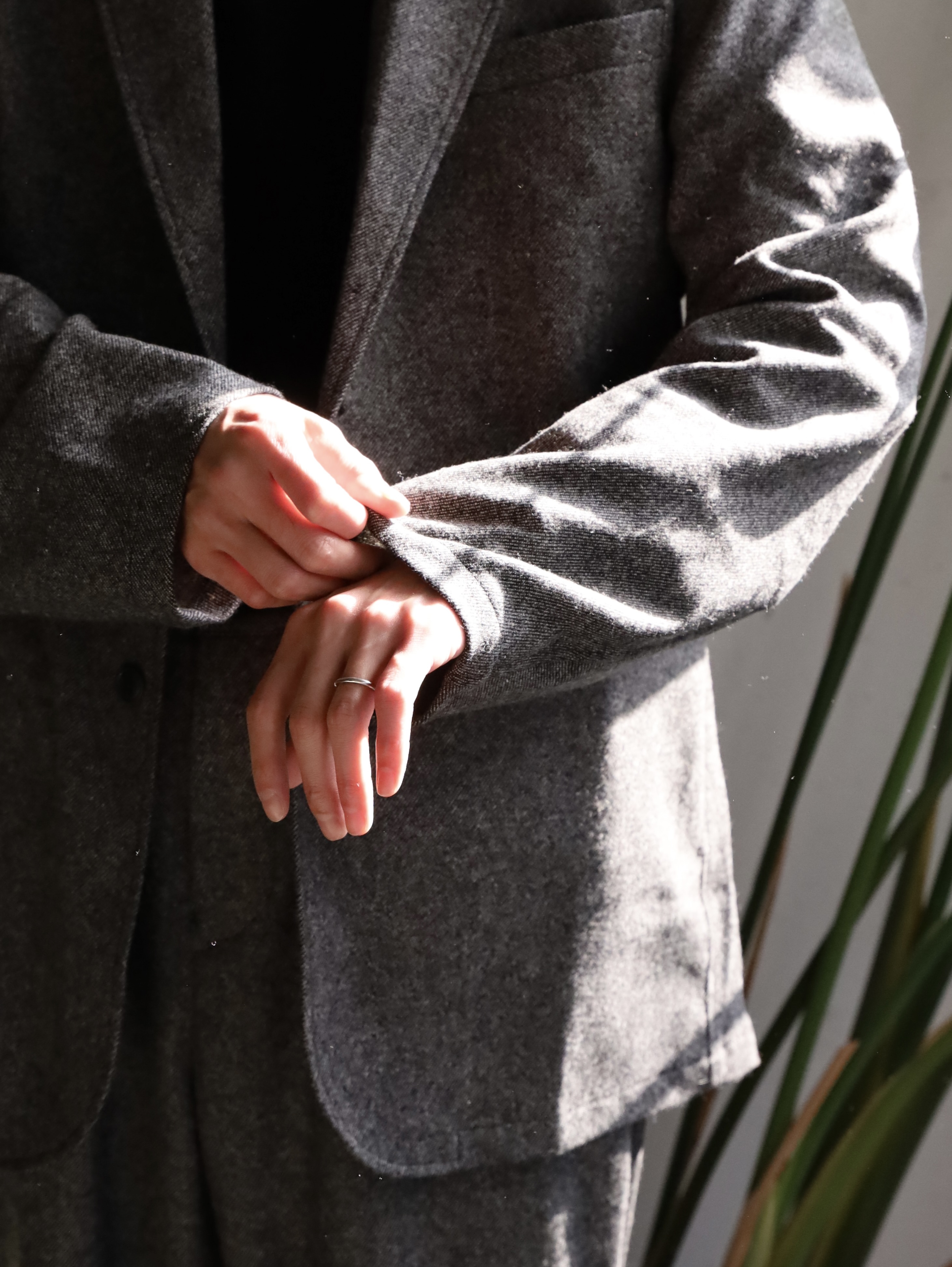 程よくゆとりのあるシルエットと、生地の柔らかさでタテのラインを作った2Bジャケット。やや長めの着丈にし、腰ポケットを脇のシームポケットにすることでアウターライクに着用ができる仕上がりです。生地には、リサイクルウールにカシミアをブレンドした素材で製作したストレッチの効いた生地を使用。カシミヤをブレンドすることでしなやかな表情と肌触りに仕上がっています。