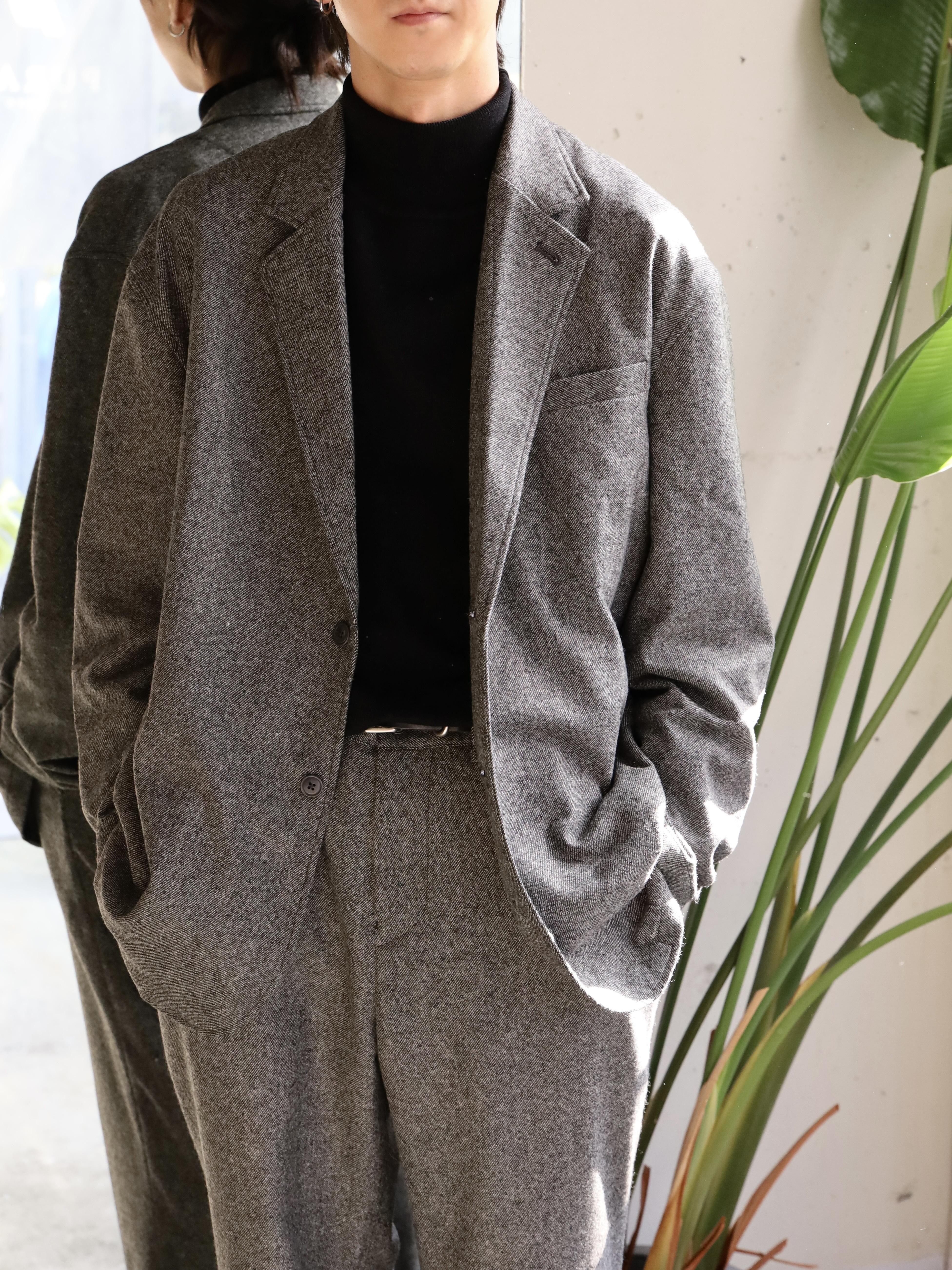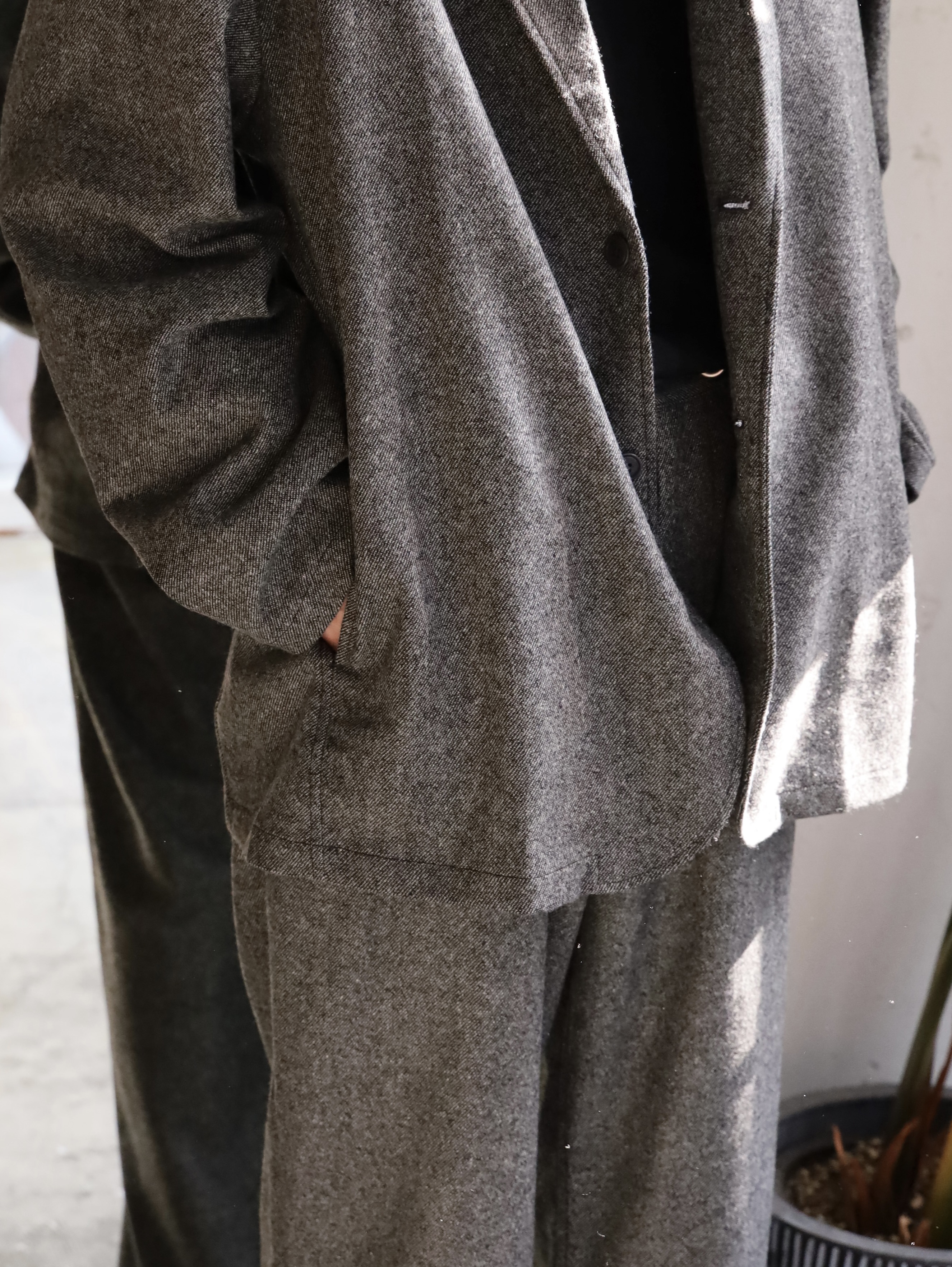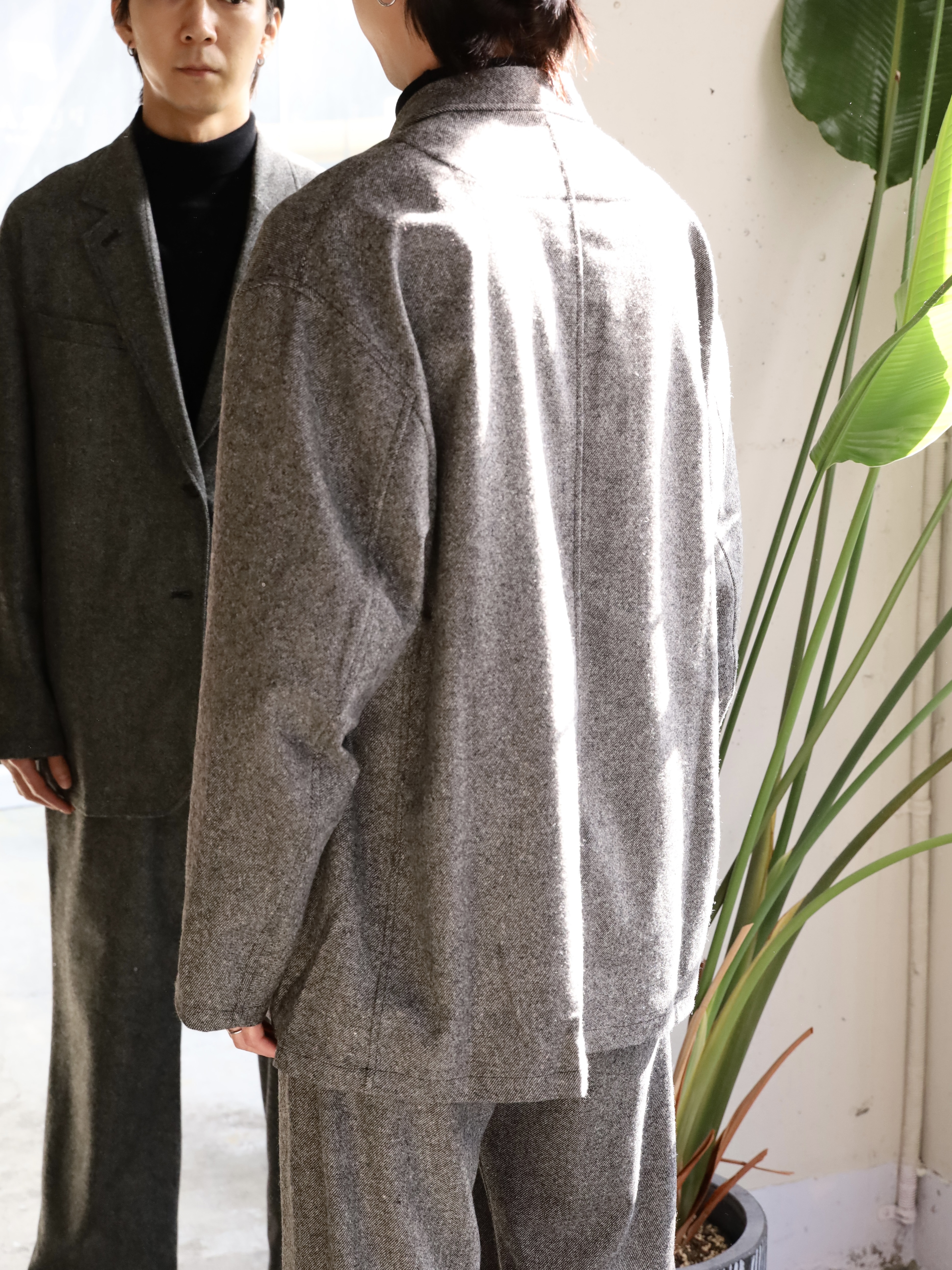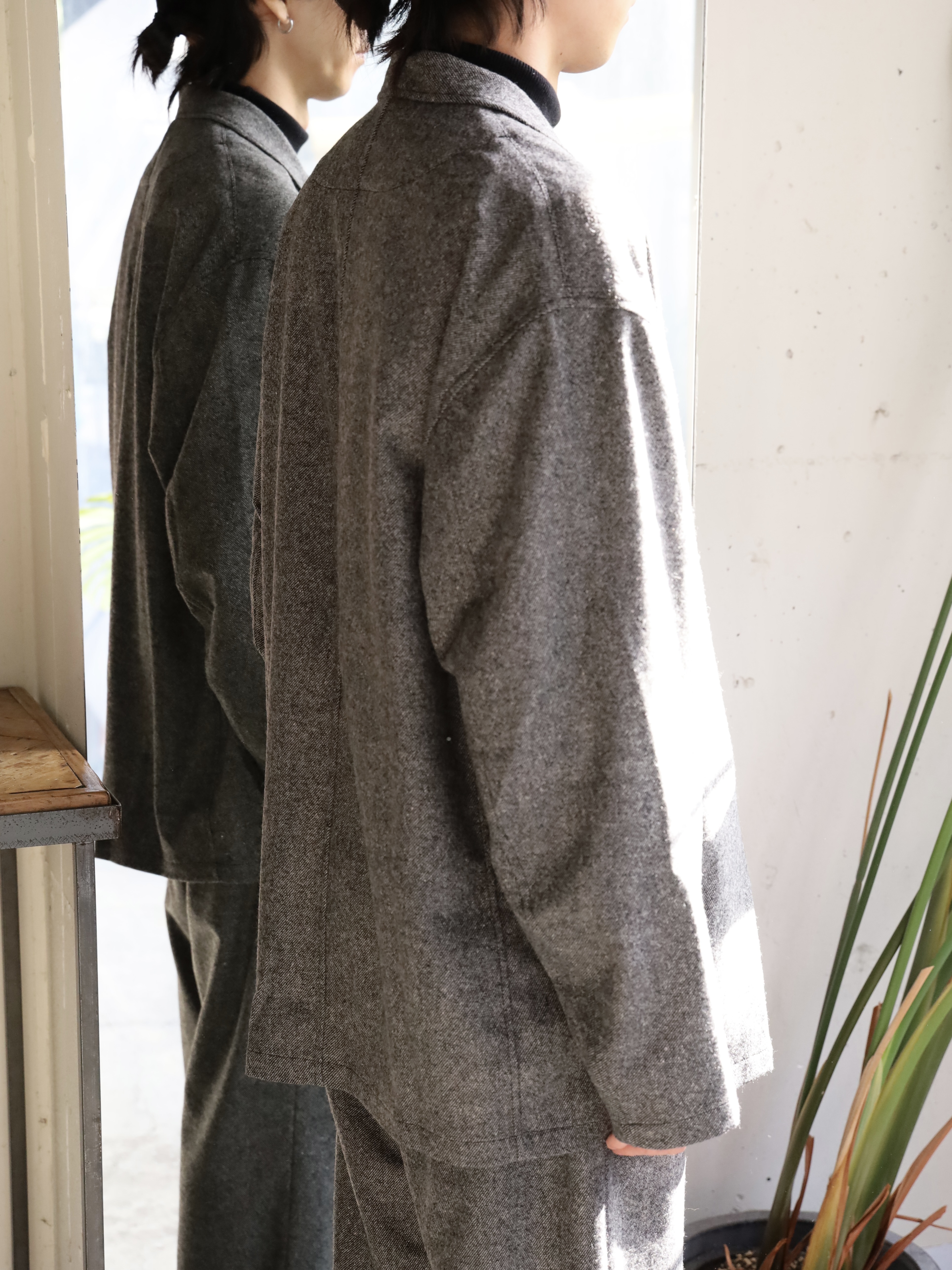 程よくゆとりのあるシルエットと、生地の柔らかさでタテのラインを作った2Bジャケット。やや長めの着丈にし、腰ポケットを脇のシームポケットにすることでアウターライクに着用ができる仕上がりです。生地には、リサイクルウールにカシミアをブレンドした素材で製作したストレッチの効いた生地を使用。カシミヤをブレンドすることでしなやかな表情と肌触りに仕上がっています。