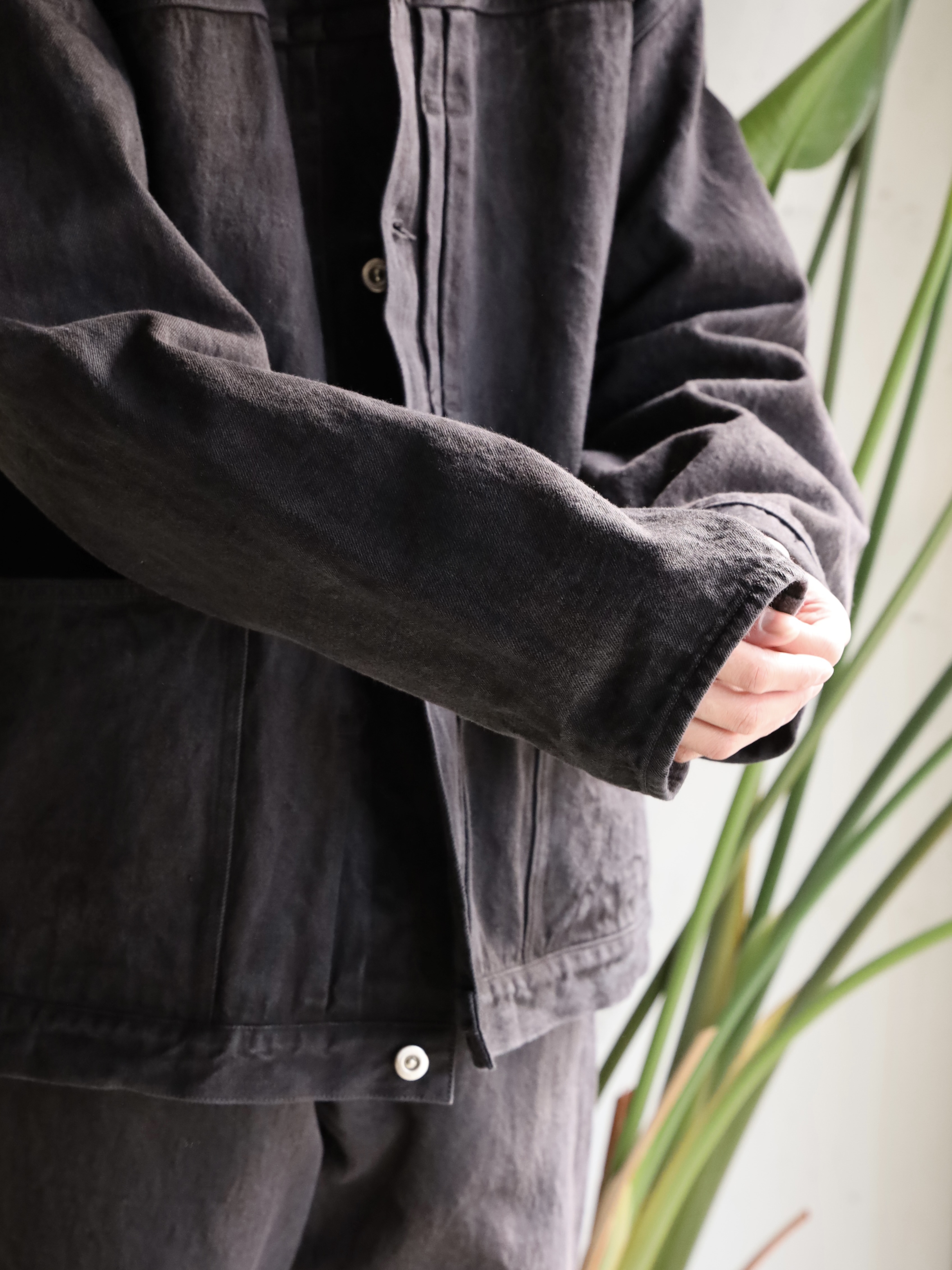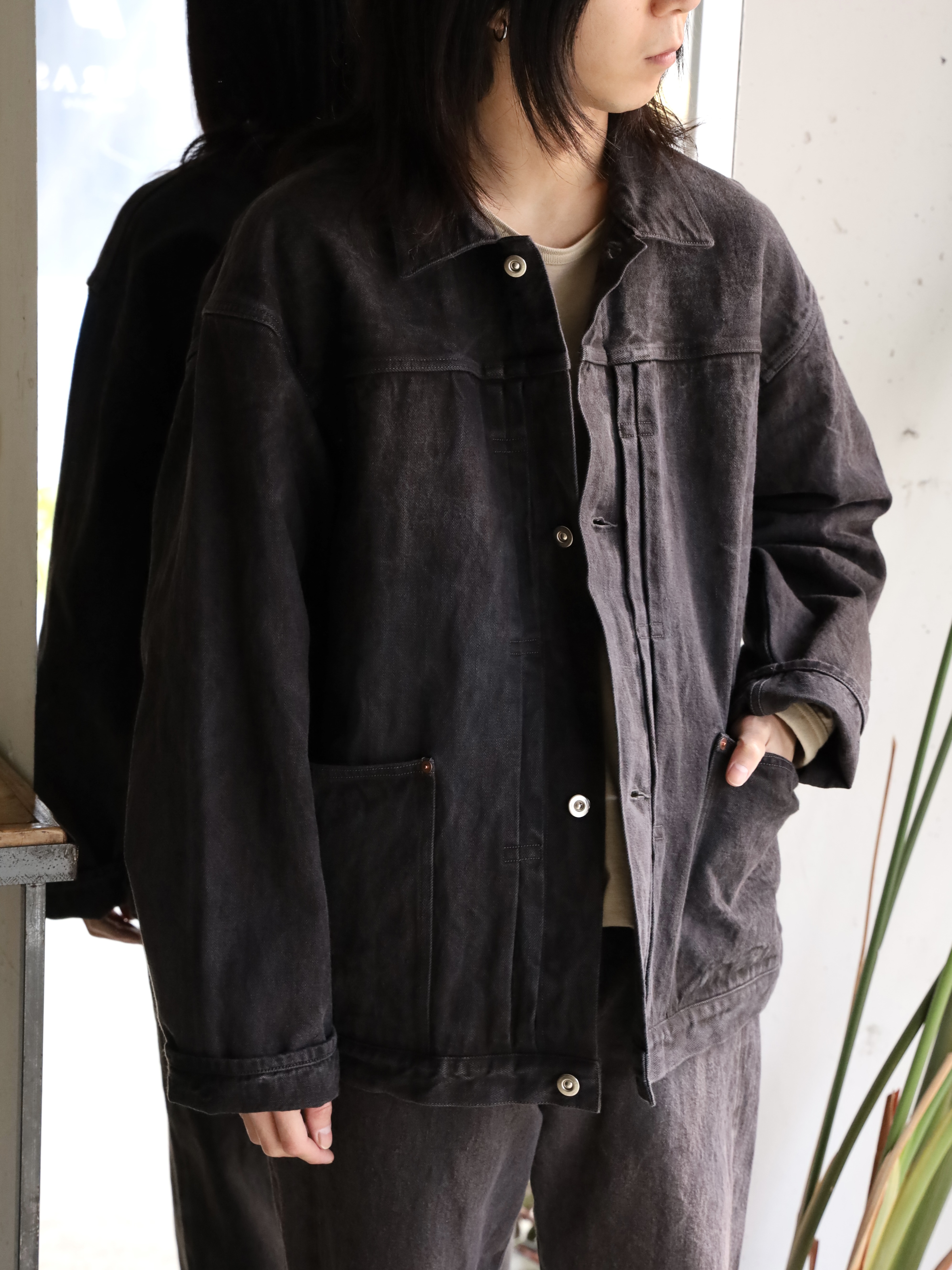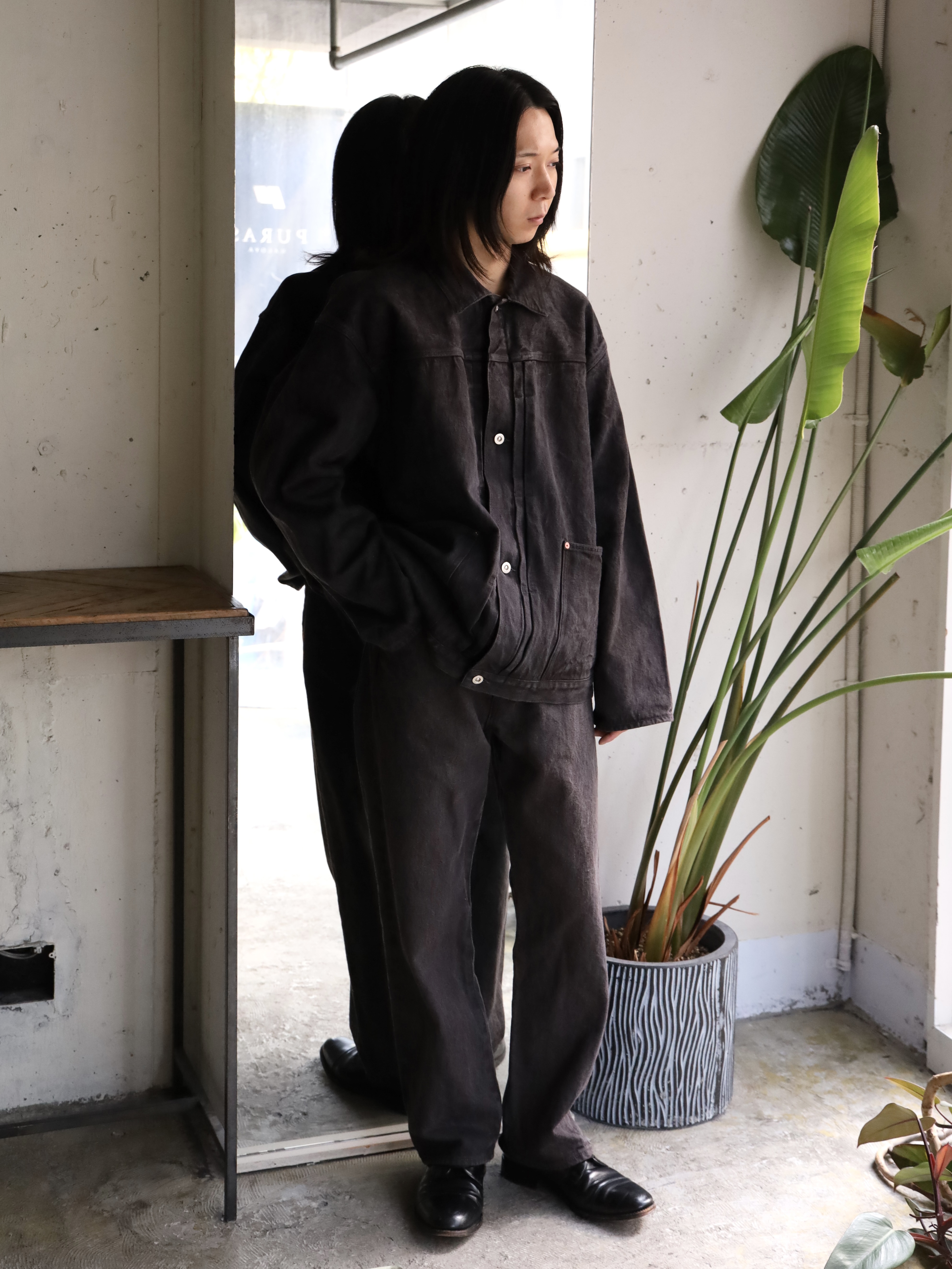 かなり古い時代の素朴なハウスブランドのアイテムをインスピレーション源にした1着。デニムジャケットにカバーオール大きなポケットが付いたユニークなデザイン。ブランドらしい大きくドロップしたショルダーラインや広い身幅、力の抜けたゆったりとしたサイジング。シーズン長くお使いいただけるのが嬉しいポイントです。タックボタンは鉄製の無塗装を、リベットには鉄製銅メッキを使用。徐々に錆びていき、独特な風合いとルックスに変化していきます。生地には、岡山県の歴史のある機屋にて 、旧式の力織機( シャトル織機) で 、ゆっくりと丁寧に織り上げた、独自の風合いが特徴のセルビッチデニムを使用しています。この生地を織るために用いられる旧式織機は生産効率が非常に低く、1 時間にわずか数メートルしか織る事が出来ません。しかし、この丁寧な製法により、経糸に無理な張力を掛けることなくシャリ感と膨らみを併せ持つ、他には無い風合いの生地になるのです。特徴的な染色は、京都の歴史ある染め工場にて熟練の職人が一点一点手染めを施しており、着用を重ねることでより味のある風合いに変化していきます。