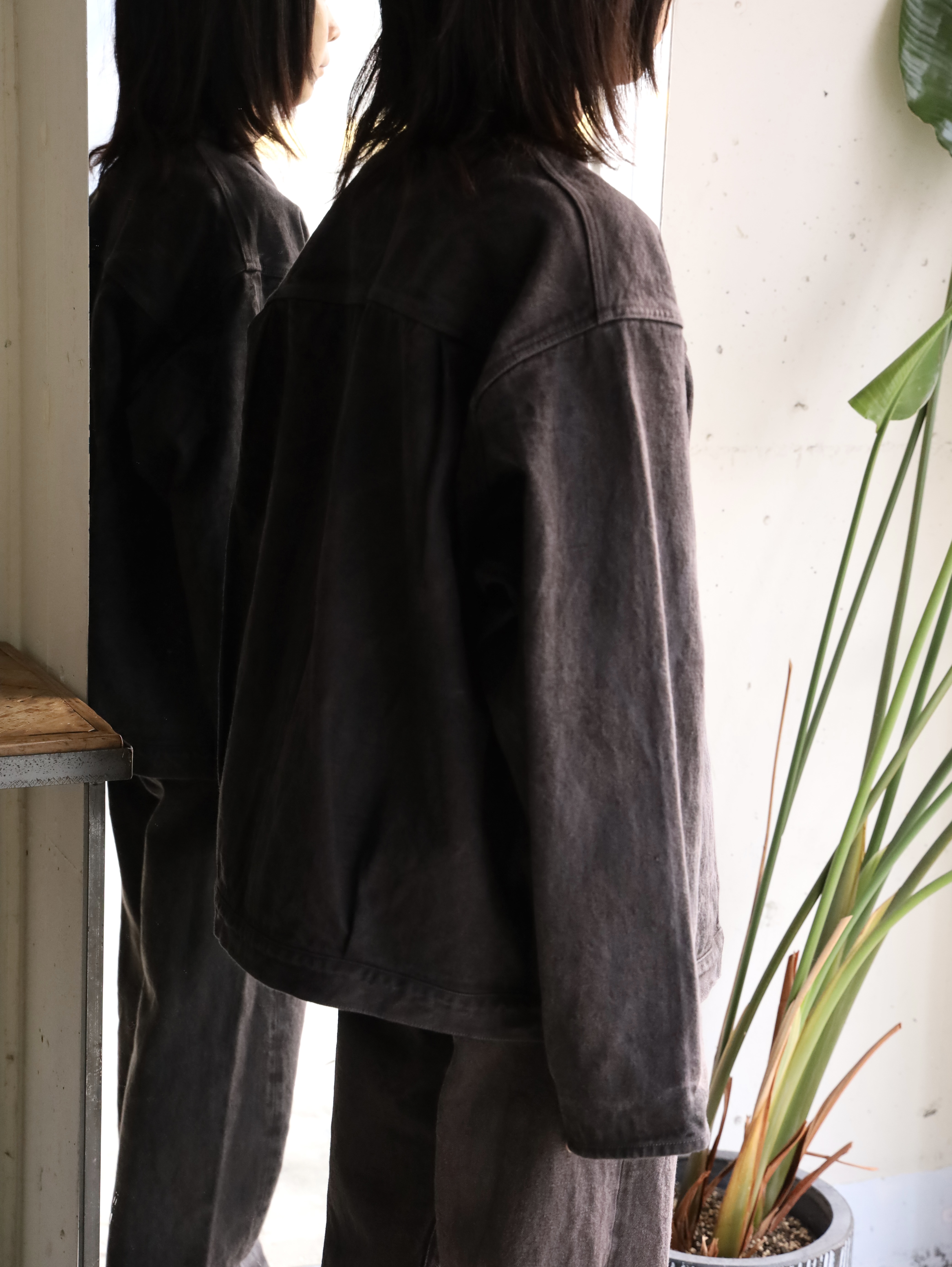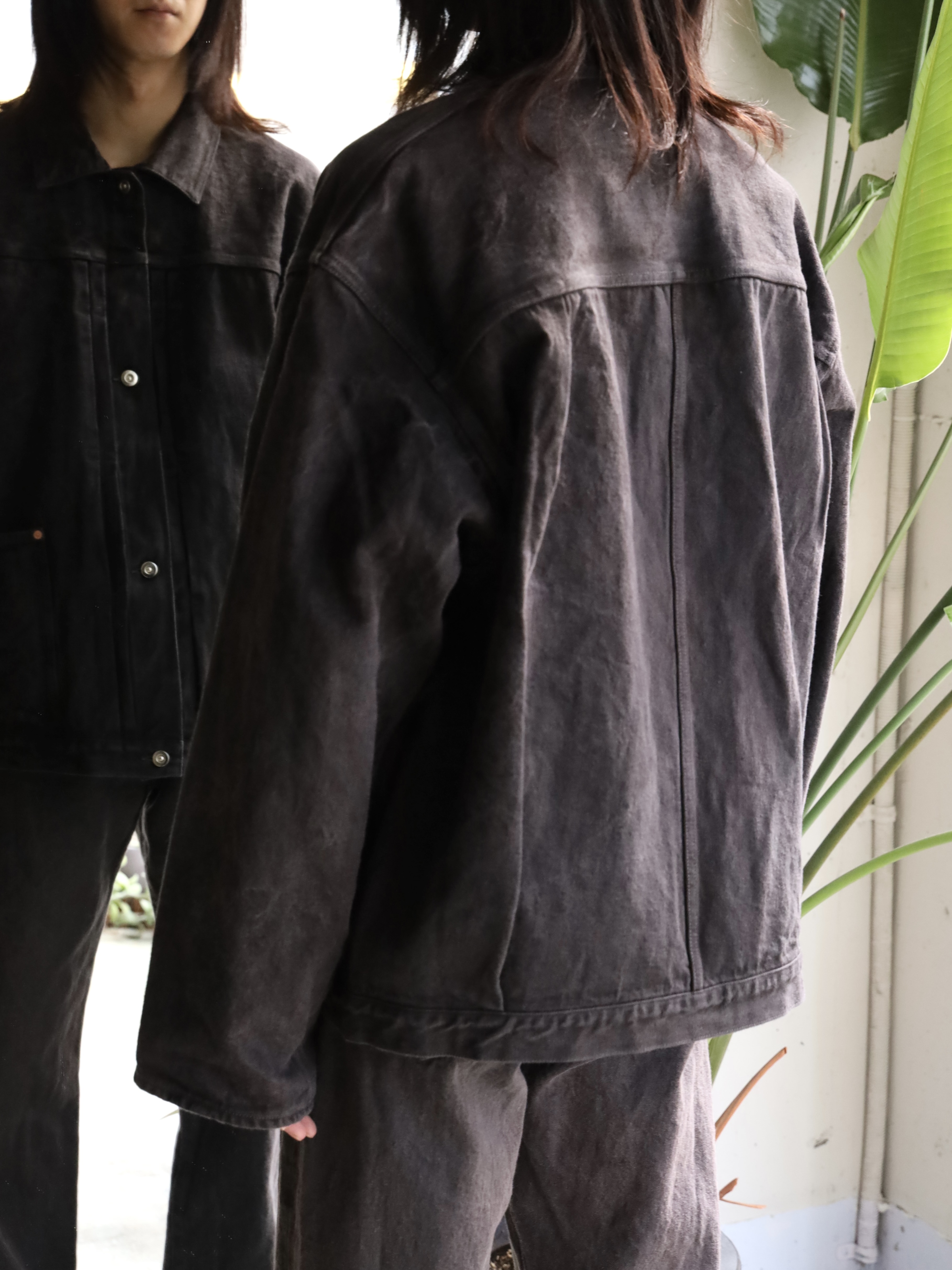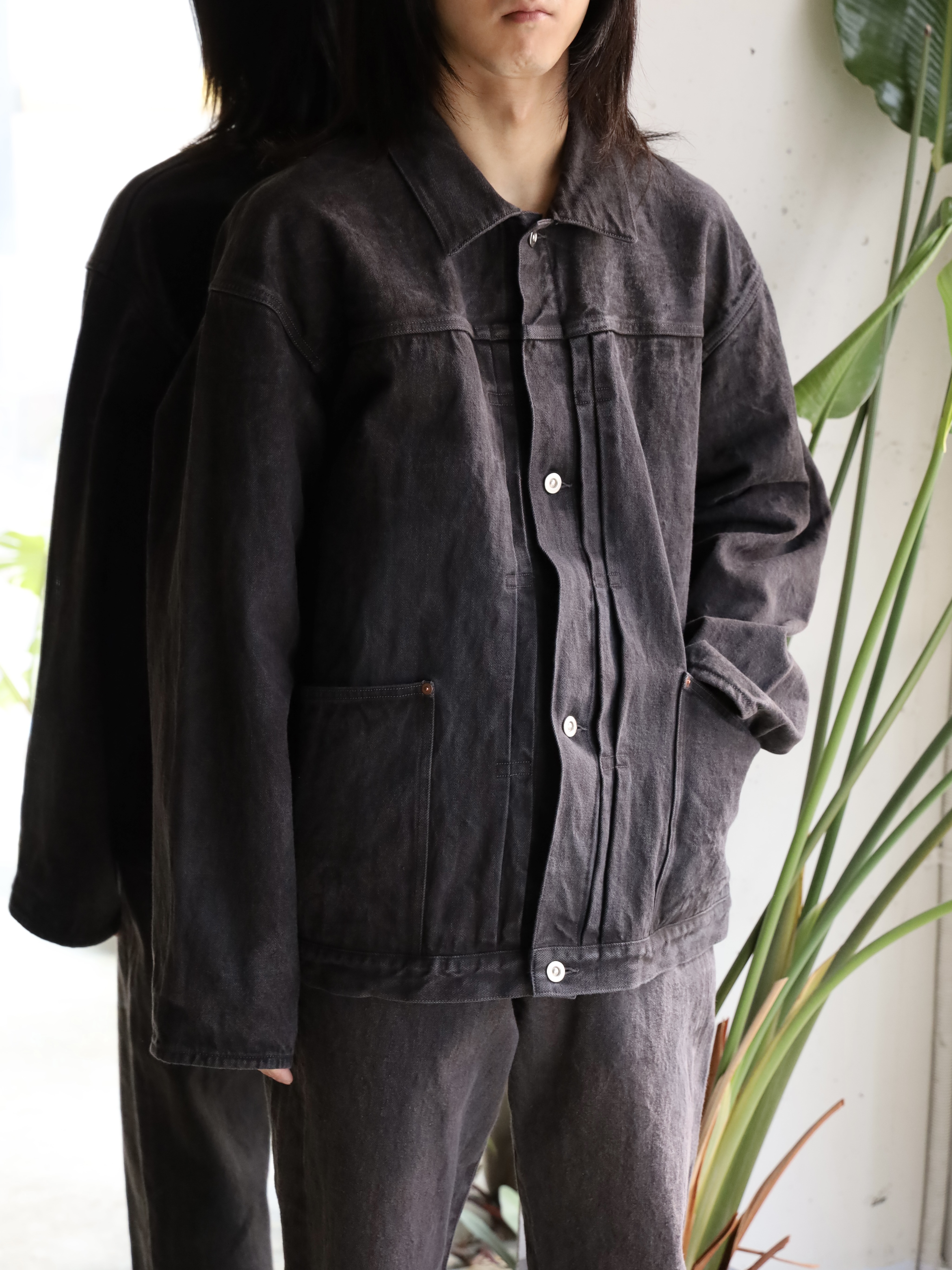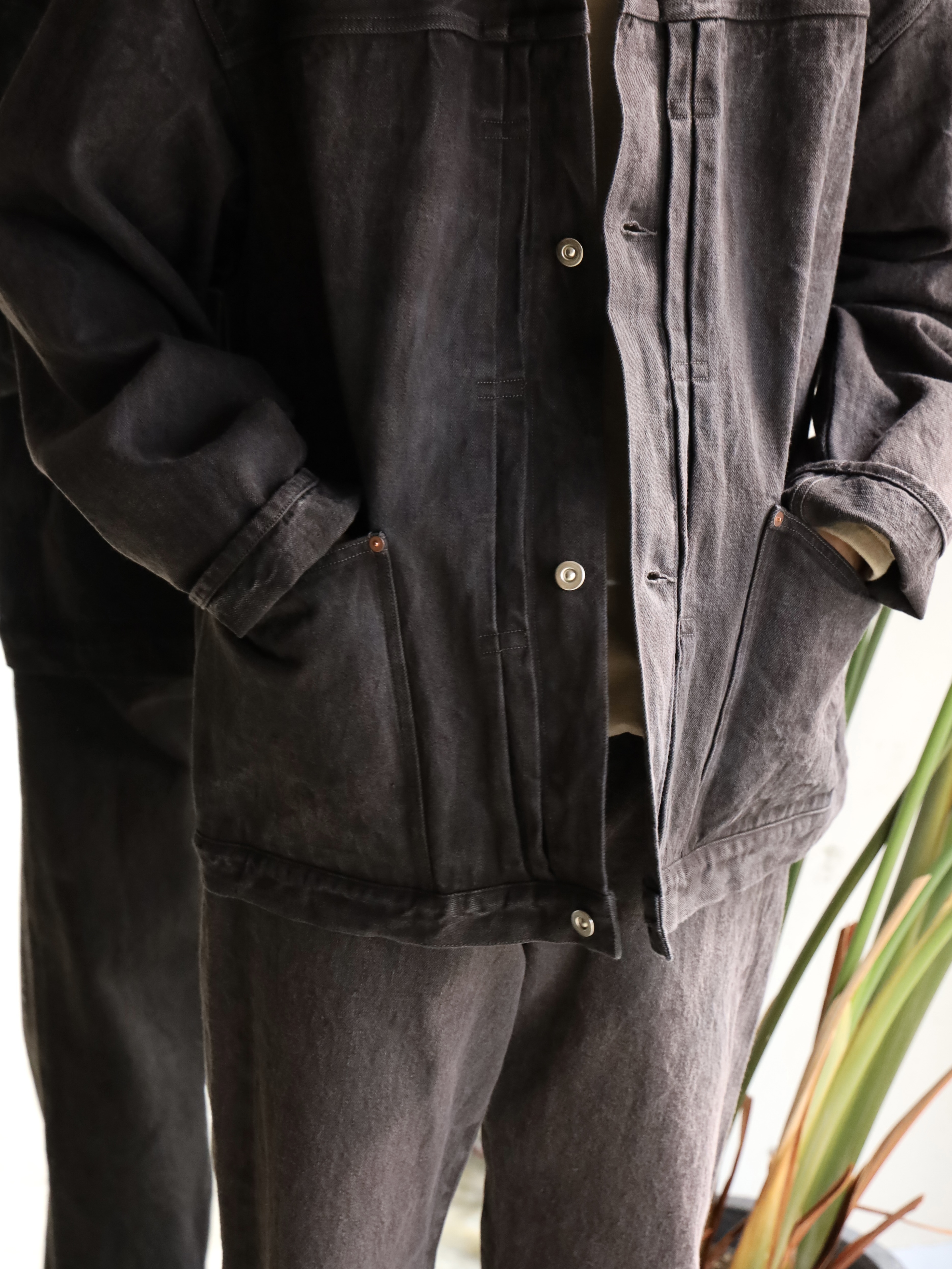 かなり古い時代の素朴なハウスブランドのアイテムをインスピレーション源にした1着。デニムジャケットにカバーオール大きなポケットが付いたユニークなデザイン。ブランドらしい大きくドロップしたショルダーラインや広い身幅、力の抜けたゆったりとしたサイジング。シーズン長くお使いいただけるのが嬉しいポイントです。タックボタンは鉄製の無塗装を、リベットには鉄製銅メッキを使用。徐々に錆びていき、独特な風合いとルックスに変化していきます。生地には、岡山県の歴史のある機屋にて 、旧式の力織機( シャトル織機) で 、ゆっくりと丁寧に織り上げた、独自の風合いが特徴のセルビッチデニムを使用しています。この生地を織るために用いられる旧式織機は生産効率が非常に低く、1 時間にわずか数メートルしか織る事が出来ません。しかし、この丁寧な製法により、経糸に無理な張力を掛けることなくシャリ感と膨らみを併せ持つ、他には無い風合いの生地になるのです。特徴的な染色は、京都の歴史ある染め工場にて熟練の職人が一点一点手染めを施しており、着用を重ねることでより味のある風合いに変化していきます。