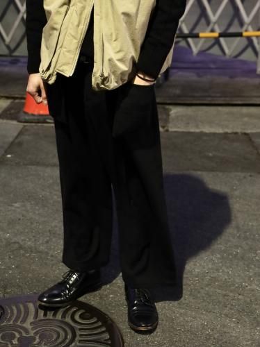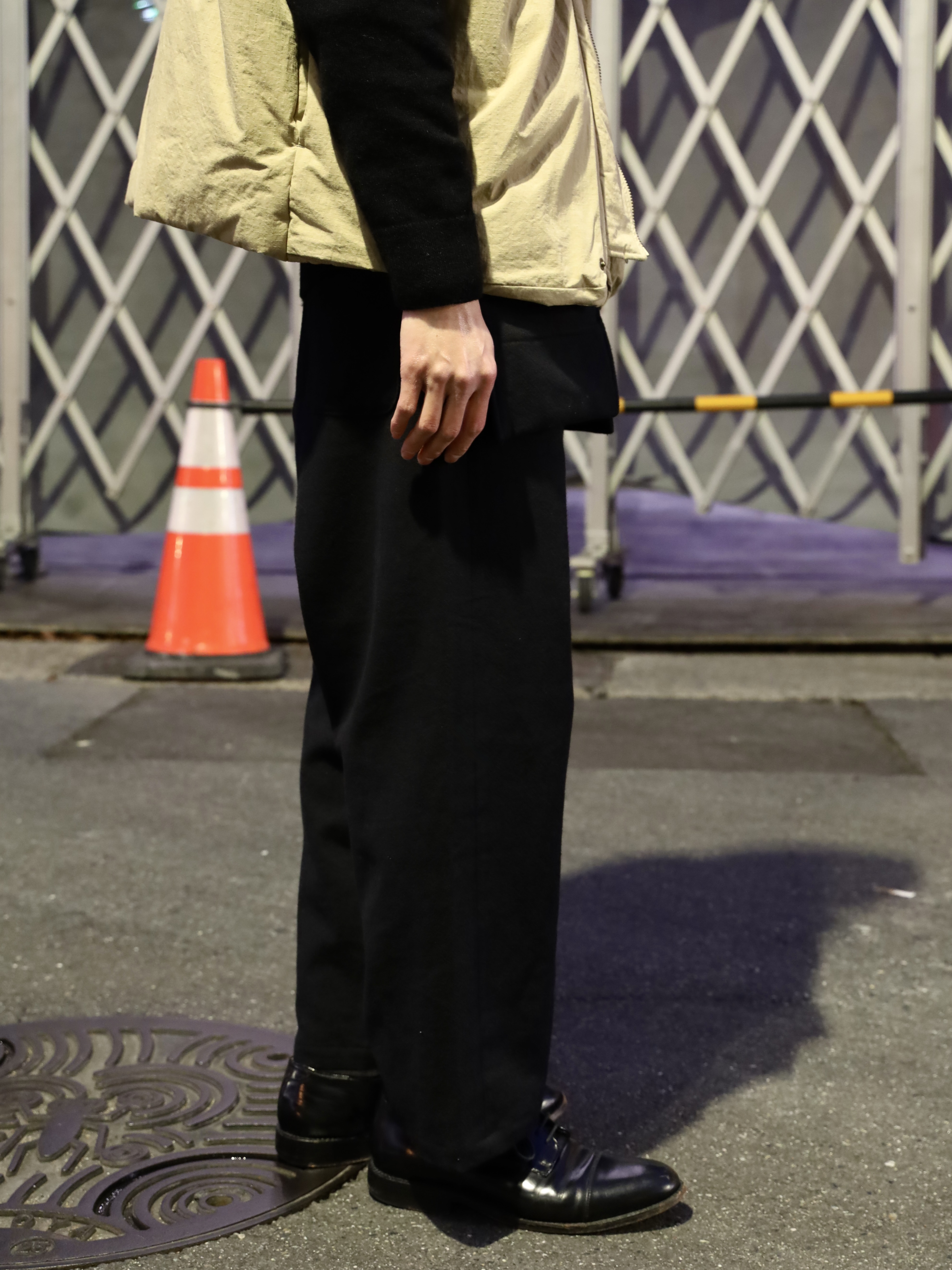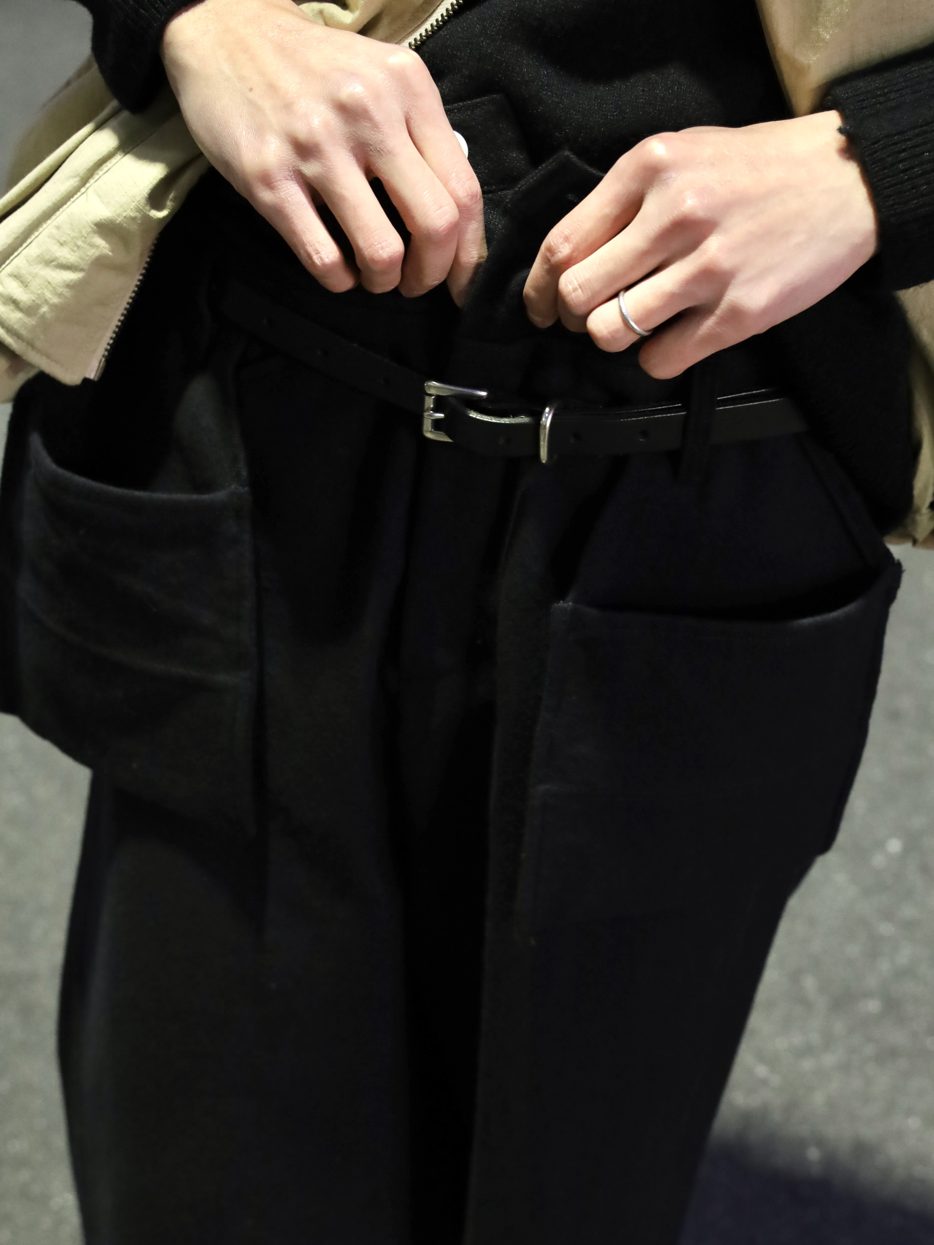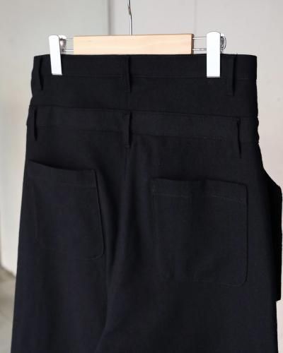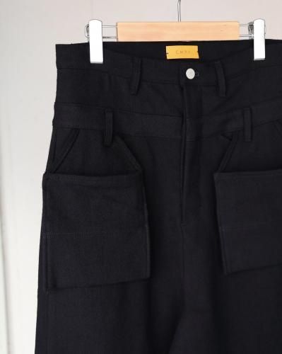 10ozのウール/コットン素材を用いたデニム生地を使用した一本。素材由来のドレープが織りなすリラックス感や軽快な穿き心地、着用時に生み出されるシルエットの美しさ。そしてなによりも腰回りのダブルウエストディテールと大胆に配された外付けポケットが特徴。ハイウエストでスッキリ穿くも良し、ローでいなたく穿くも良し。ファッションの楽しさを底上げしてくれる一本です。
