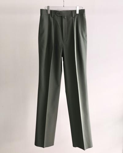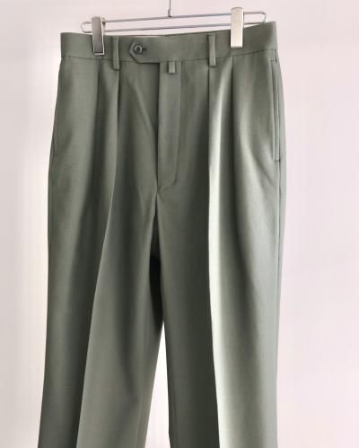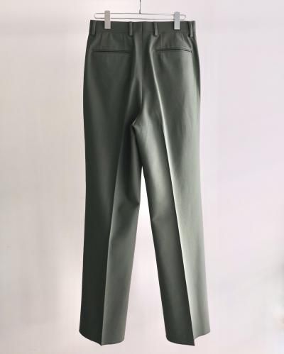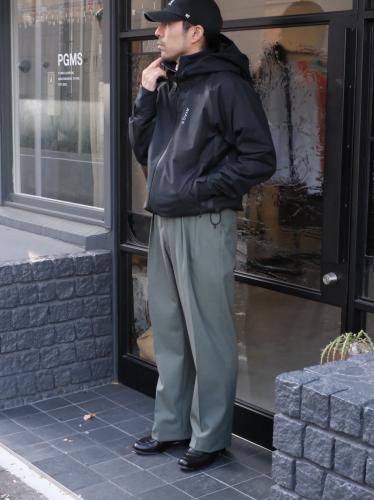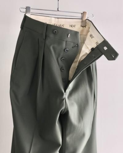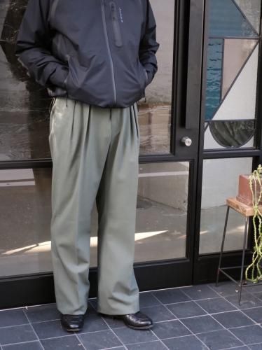 貴重な太番手の強撚糸を縦横に贅沢に使用し、力強い綾目でありながら強撚糸が持つ特徴的なシャリ感を残しつつ、ドレープ感もあるため、ウールのような雰囲気を感じさせる生地を使用。また特殊なシワ軽減加工も入れております。ワイド型はシルエット太めですが、腰回りがすっきりとしたクセのない印象。通年ご着用いただける頼れる仕上がりの1本です。