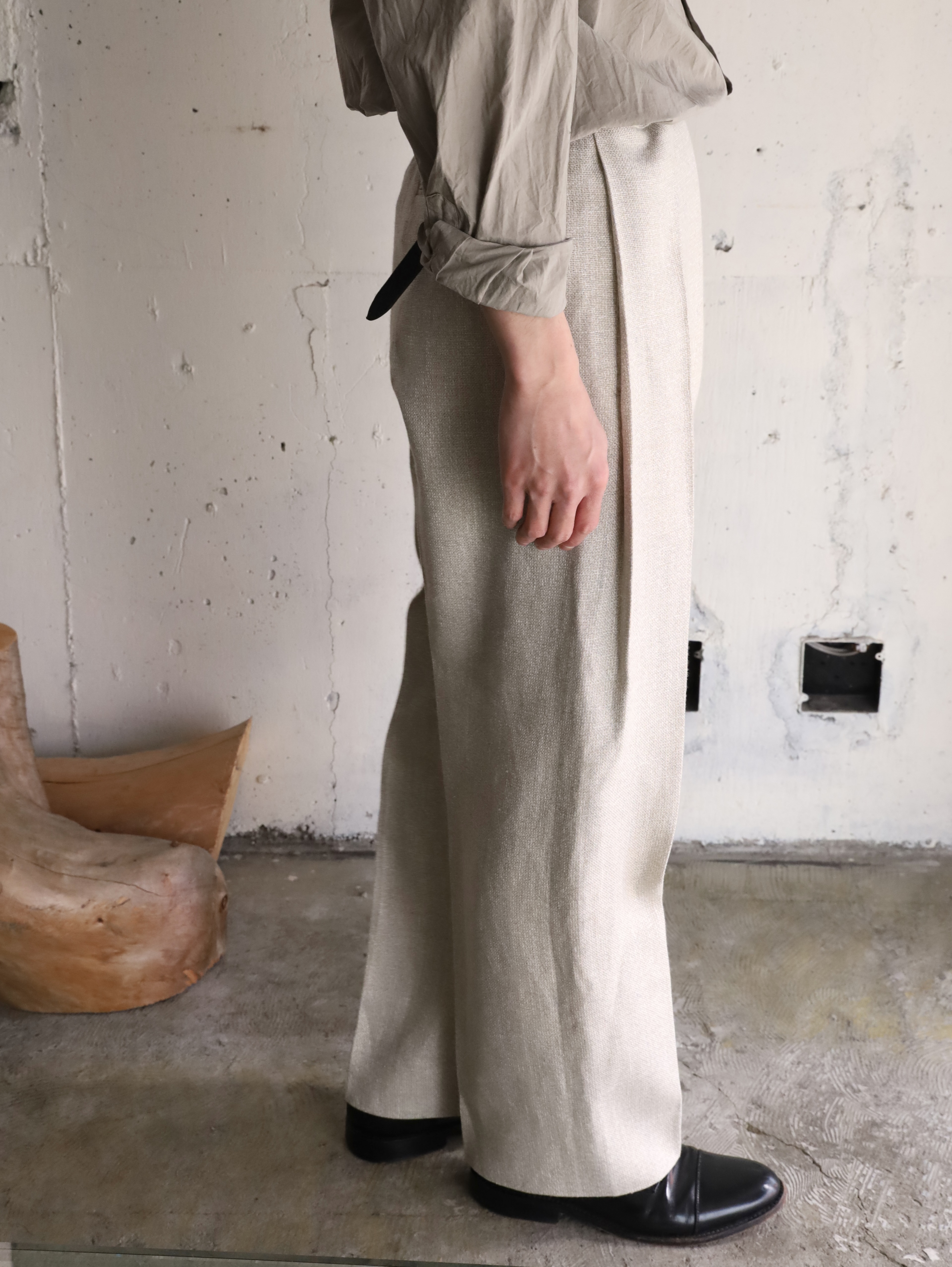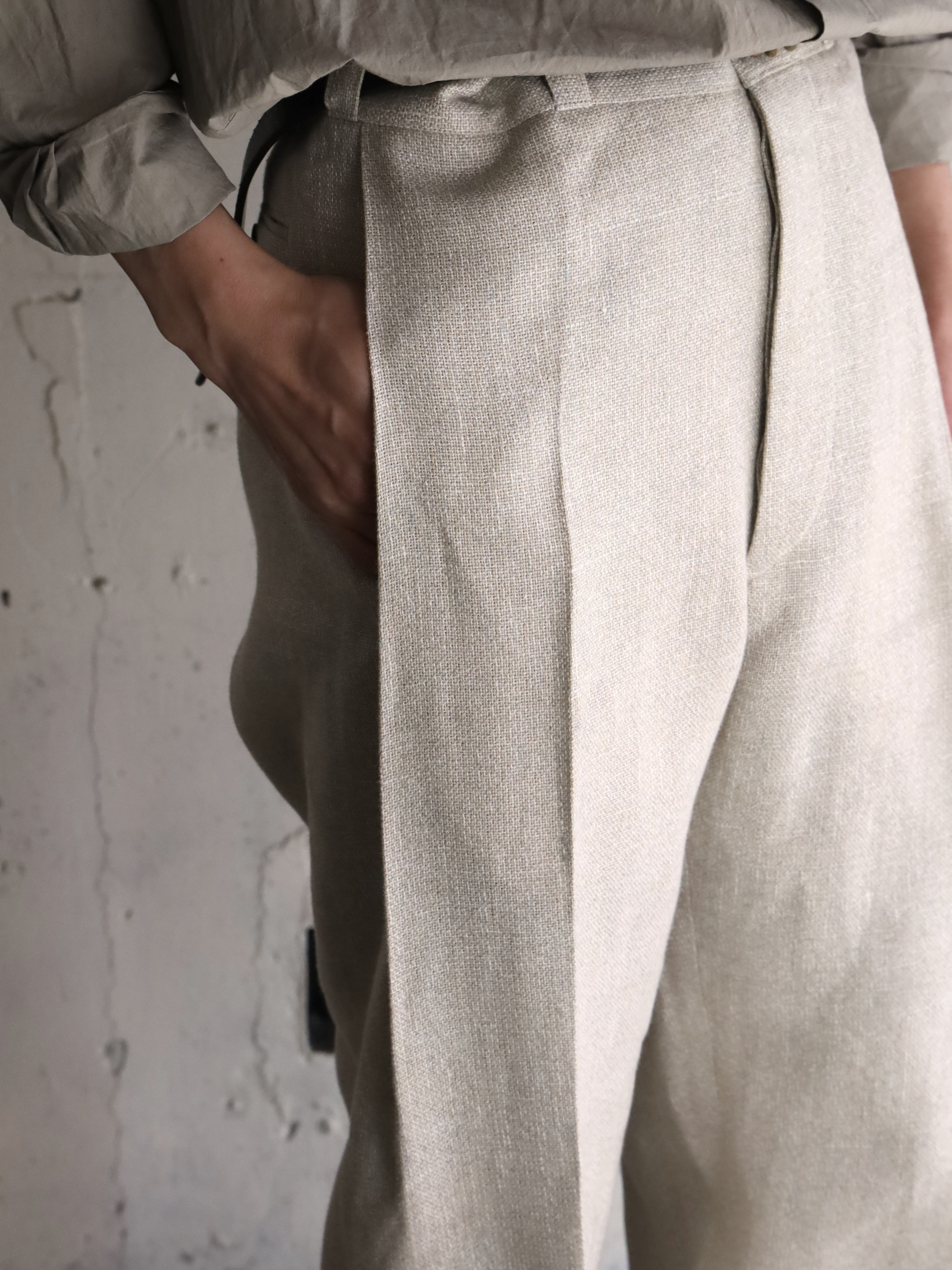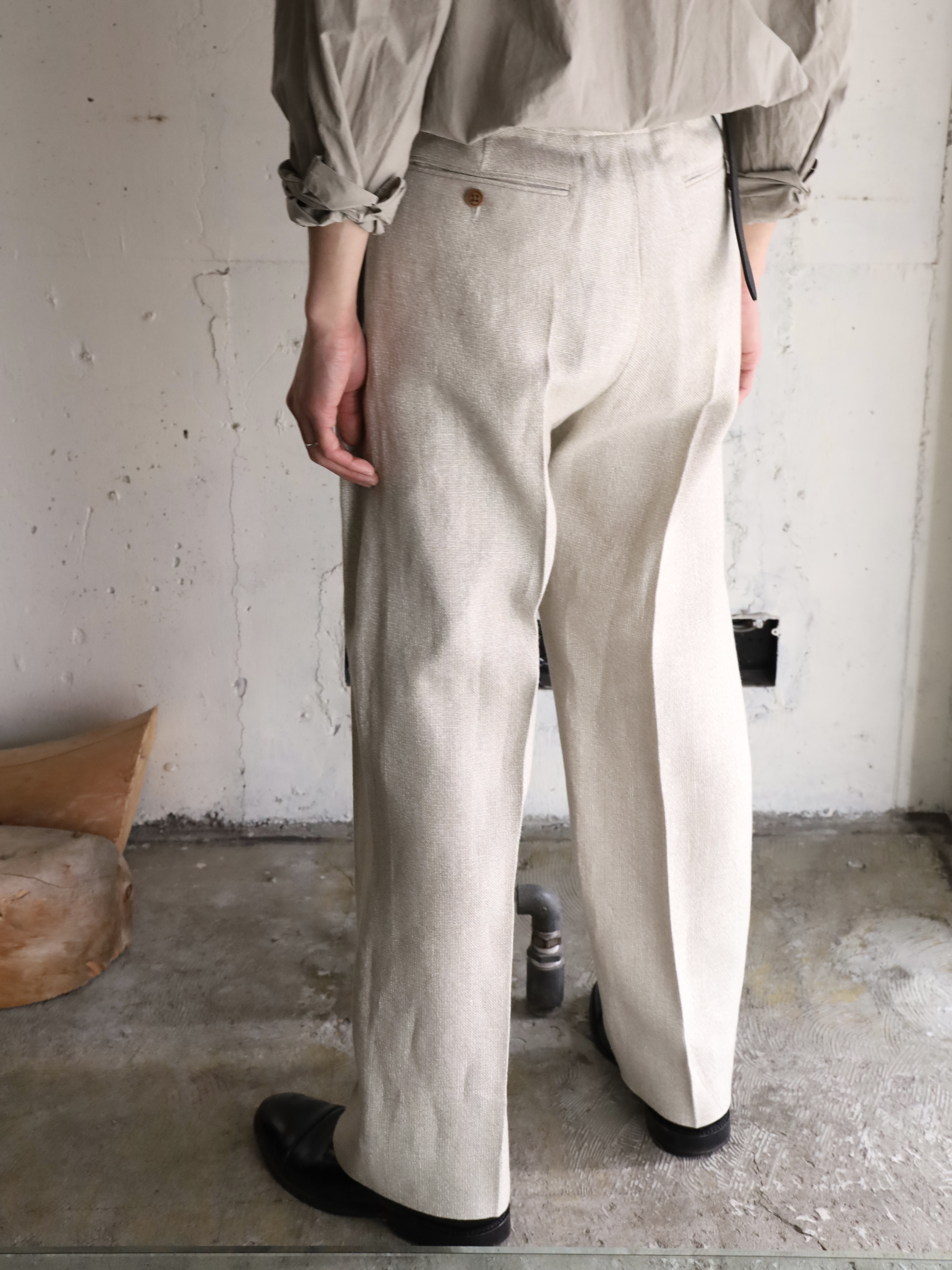 サイドにタックを入れた当店では定番のトラウザー。前から見たときは平面に見え、横から見たときには立体的に見えるパターンワークが光る仕様。サイドタックに隠れたポケットもポイントの一つ。生地量多く使用しているのに、お尻周りはスッキリとしていて、野暮ったさを感じさせないよう作り込まれています。生地には、経糸にオフホワイトとペールブルーの2色の撚った糸を使い、緯糸にベージュの糸を通した、奥行きのあるテクスチャーの生地を使用。ハリコシのある一方、リネン特有のしなやかさと爽やかさを兼ね備えています。