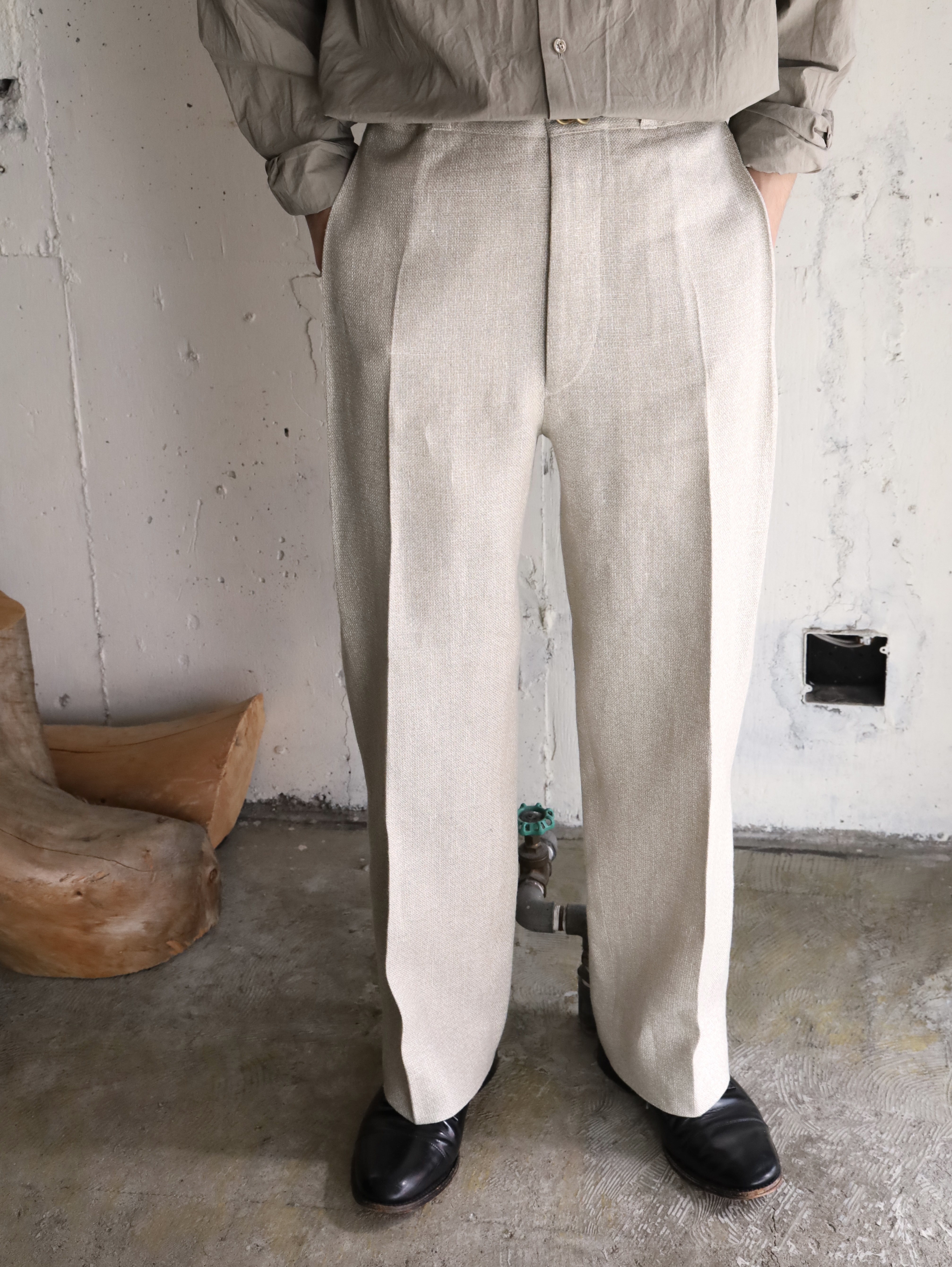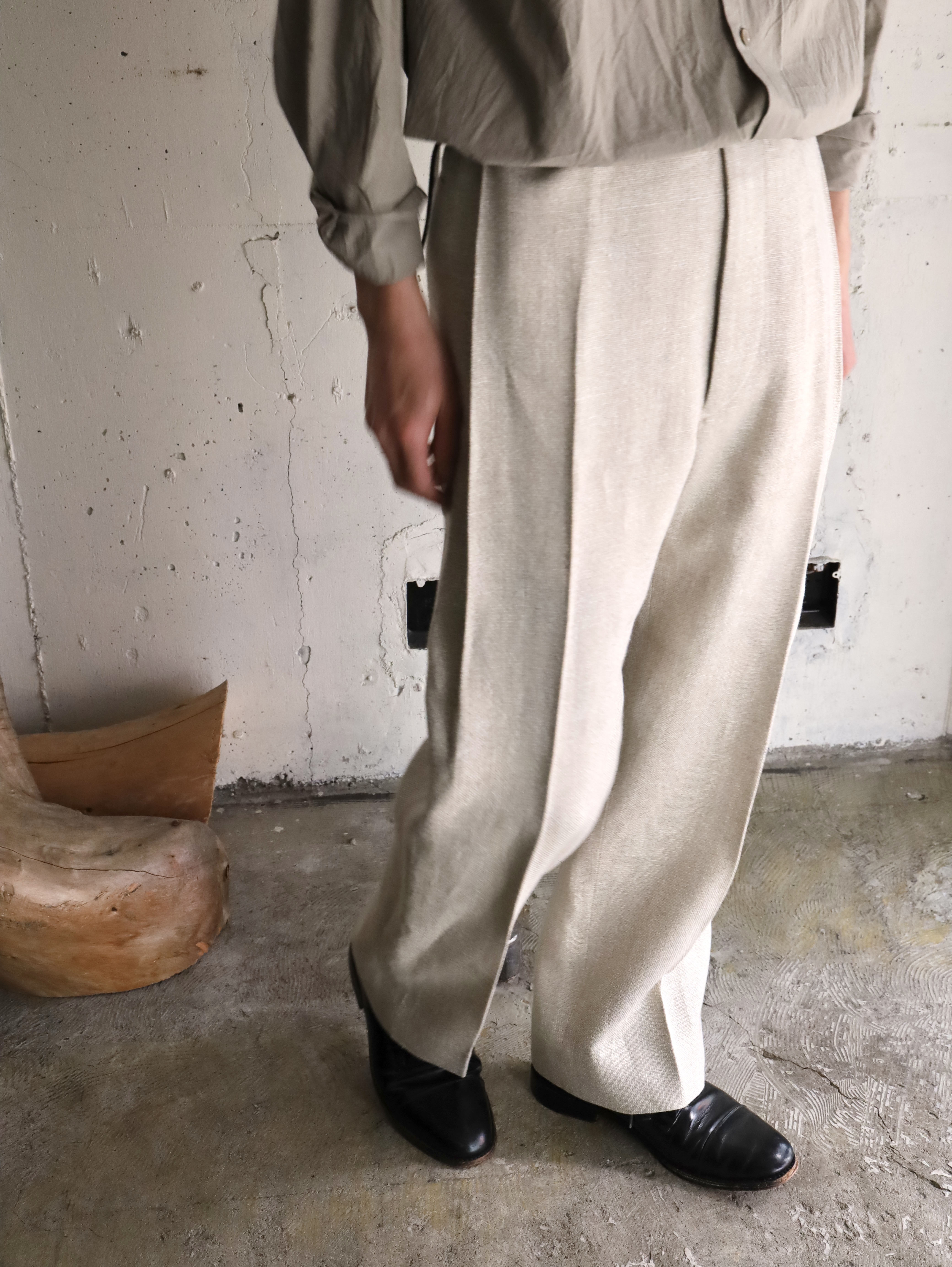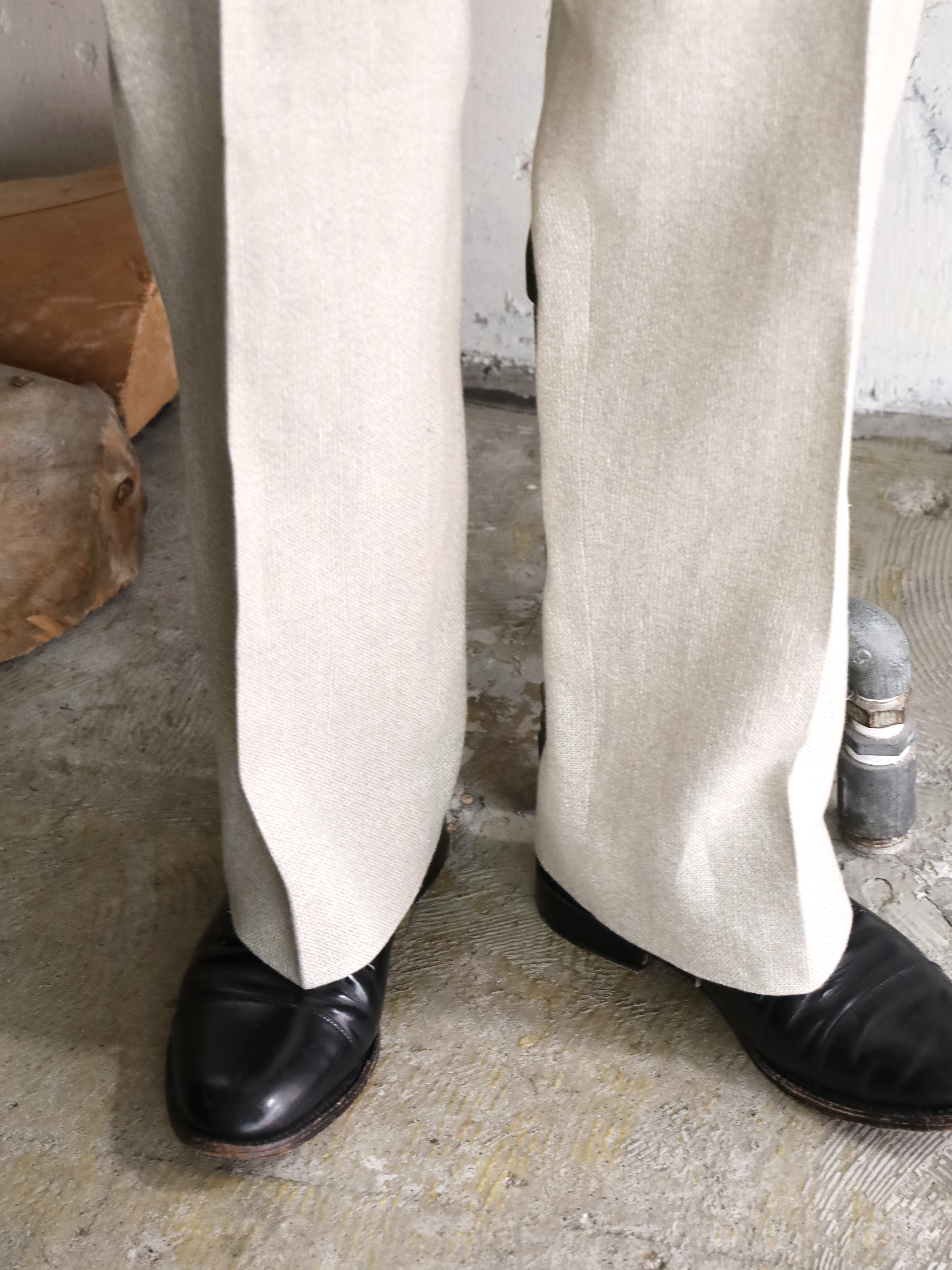 サイドにタックを入れた当店では定番のトラウザー。前から見たときは平面に見え、横から見たときには立体的に見えるパターンワークが光る仕様。サイドタックに隠れたポケットもポイントの一つ。生地量多く使用しているのに、お尻周りはスッキリとしていて、野暮ったさを感じさせないよう作り込まれています。生地には、経糸にオフホワイトとペールブルーの2色の撚った糸を使い、緯糸にベージュの糸を通した、奥行きのあるテクスチャーの生地を使用。ハリコシのある一方、リネン特有のしなやかさと爽やかさを兼ね備えています。